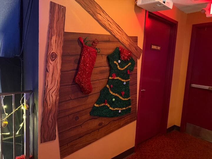 The upstairs bar is also decorated. Gift tags line the walls and hang from the ceiling.