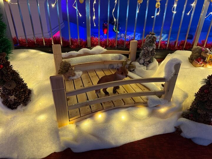 Near the second-floor railing, a winder wonderland complete with woodland creatures and a snow-covered bridge has been set up.