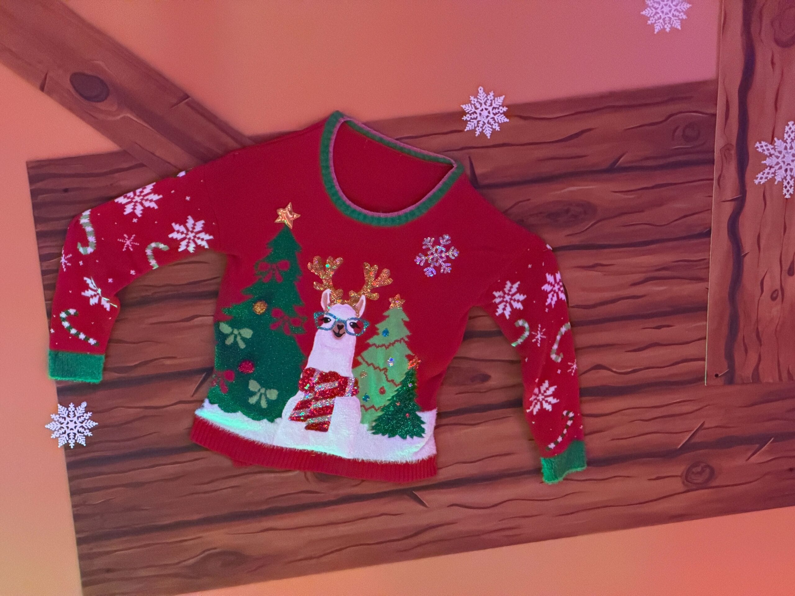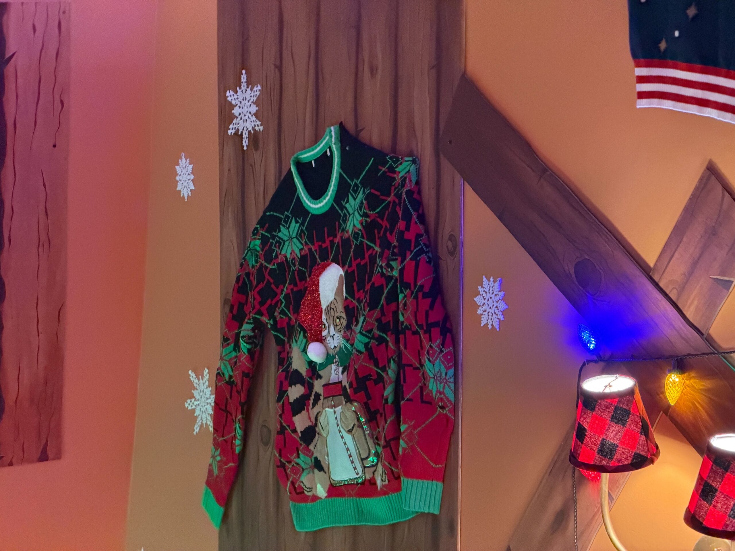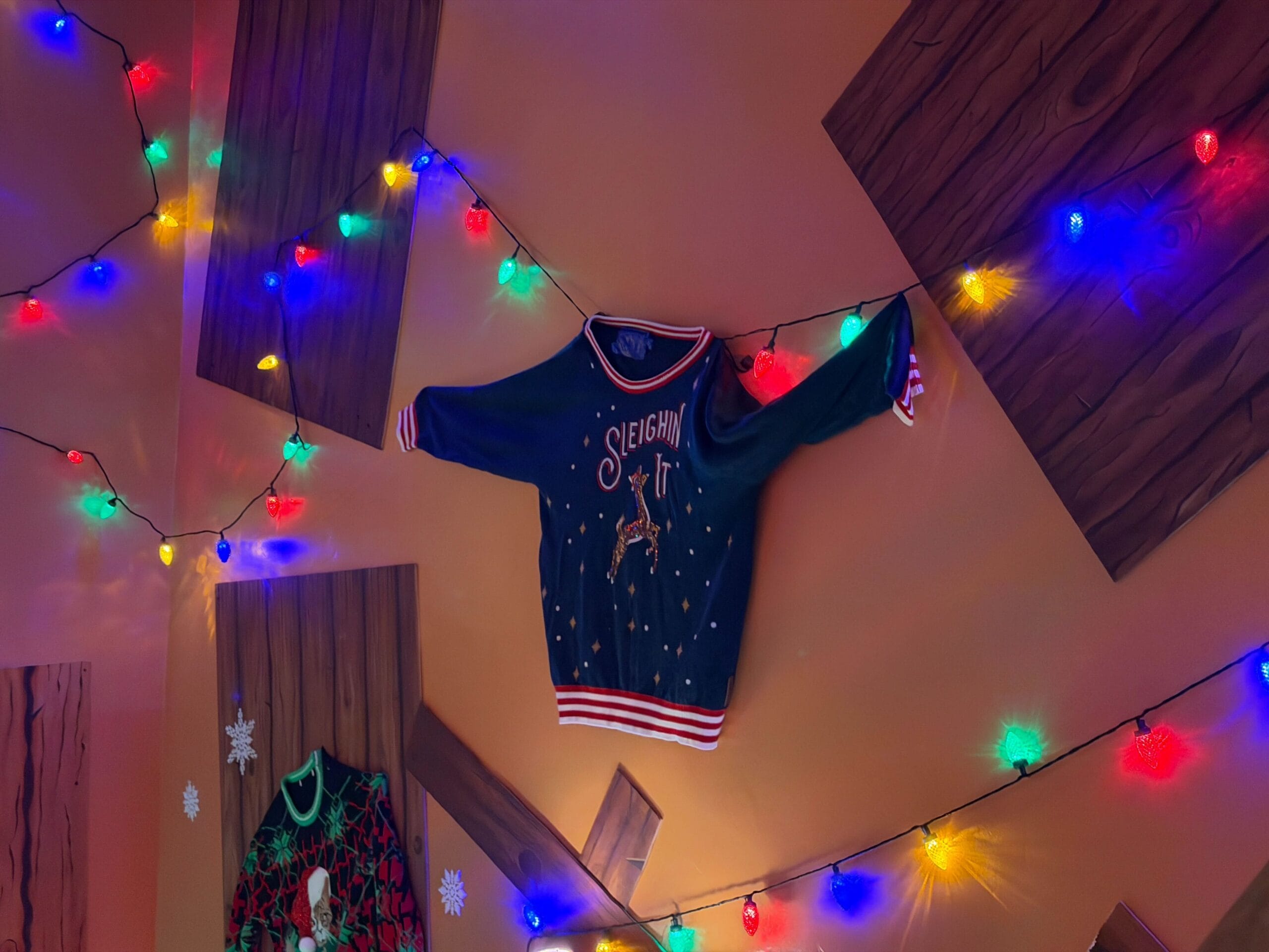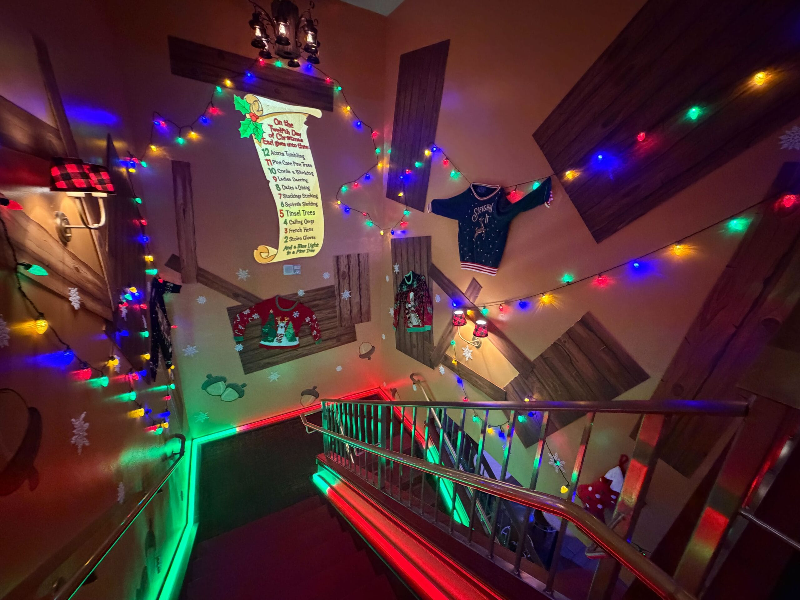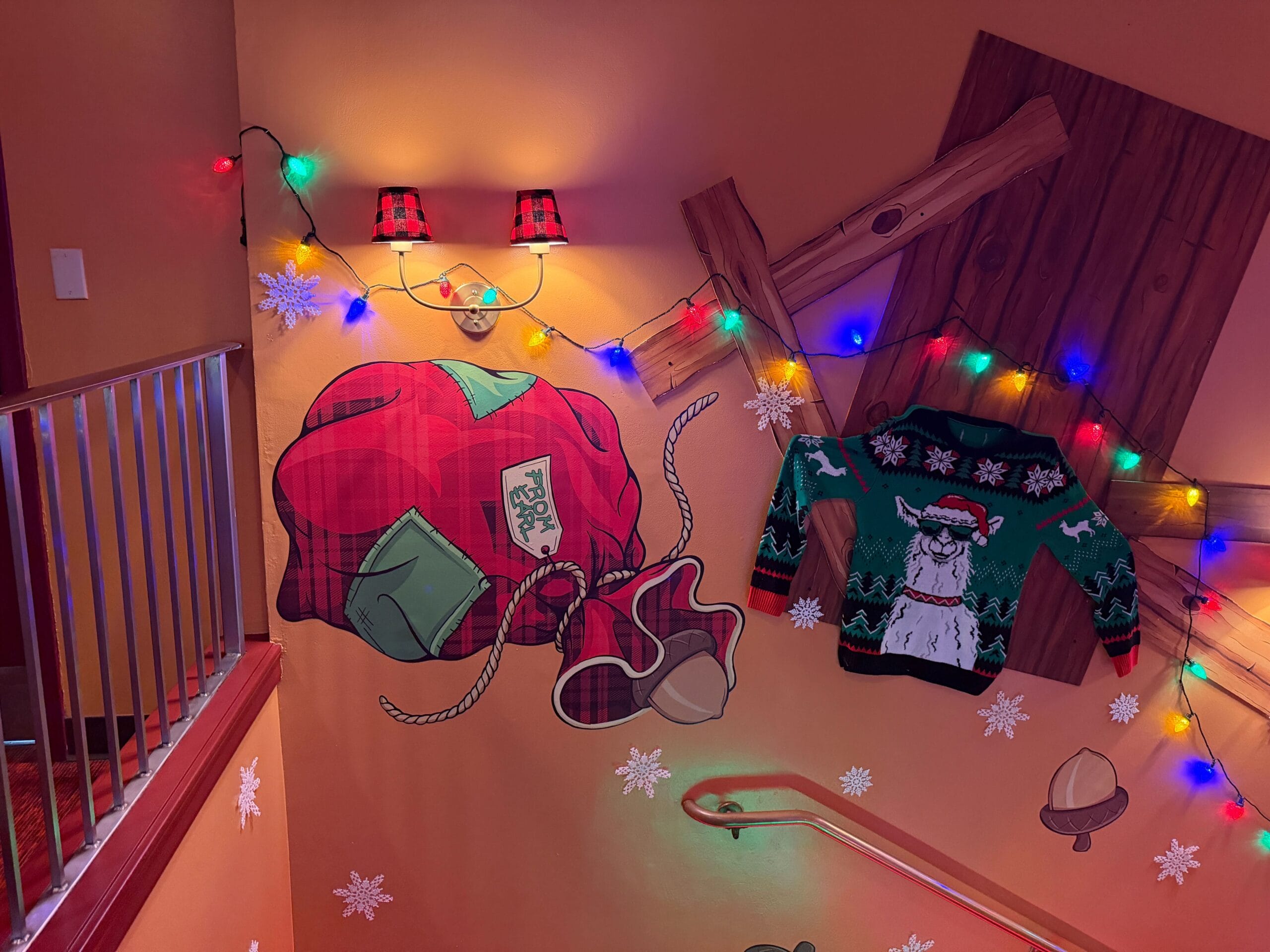 Ugly Christmas sweaters and lights line the stairway around the list.
