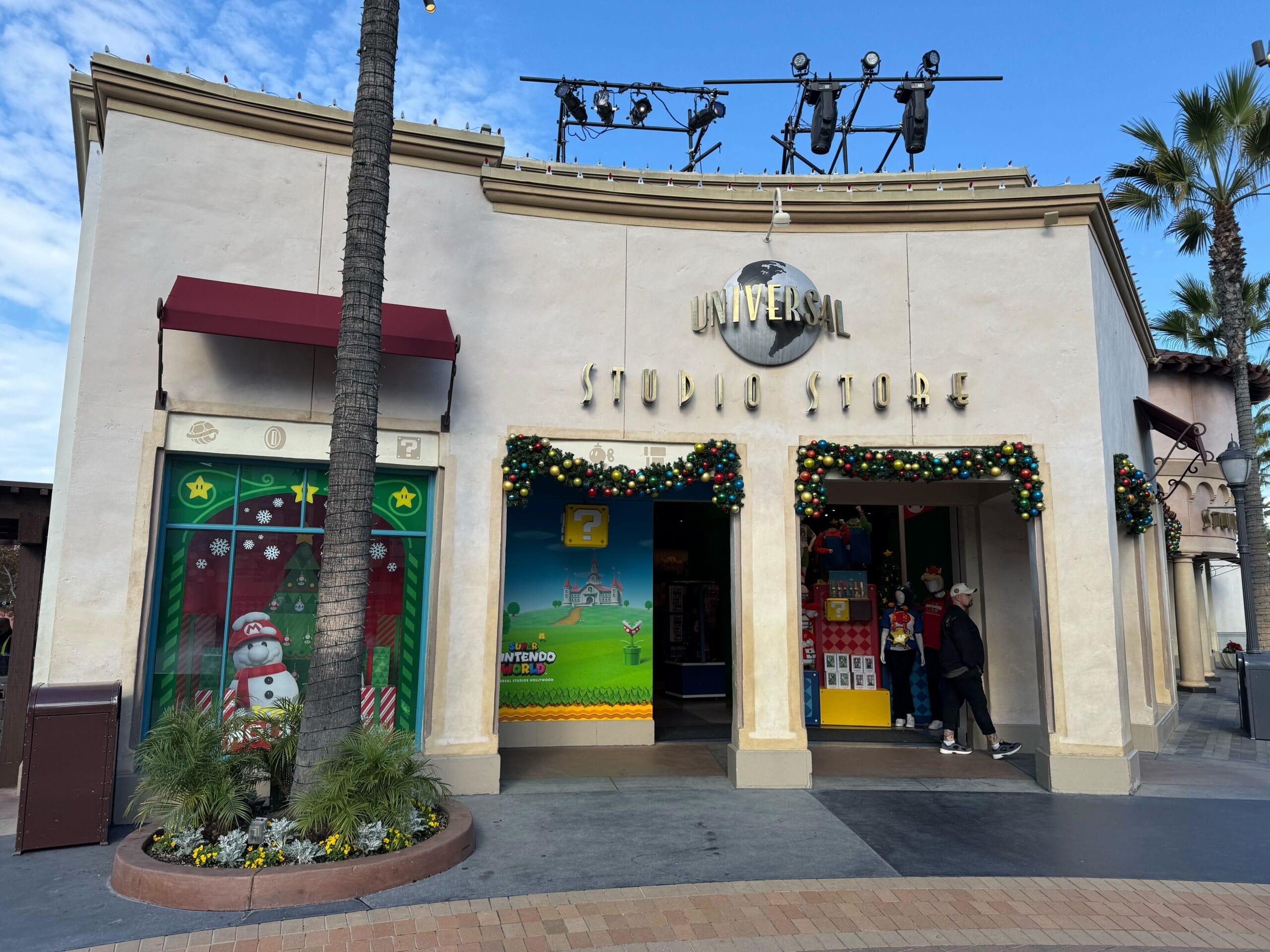 The Universal Studio Store has garland around its doorways. Being the home of Super Nintendo World merchandise, the garland is adorned with brightly-colored red, blue, and yellow baubles.