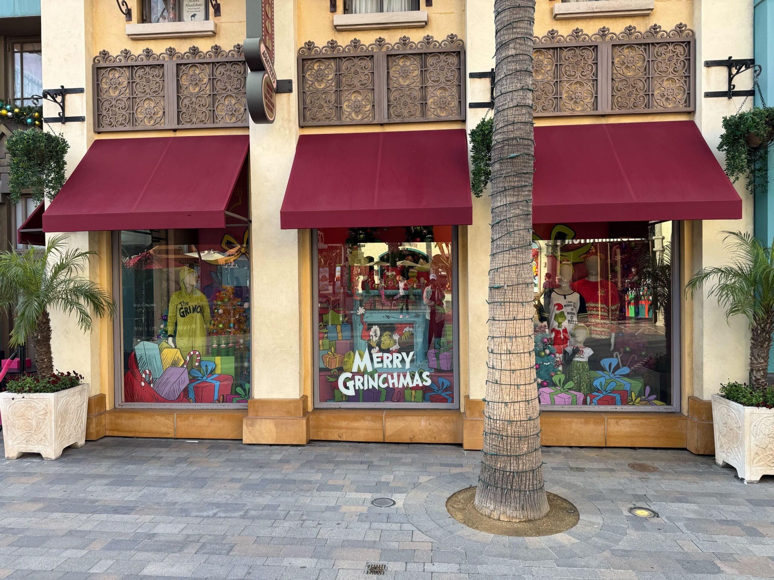 Universal Studio Store has Grinchmas decals around its columns and in the windows.