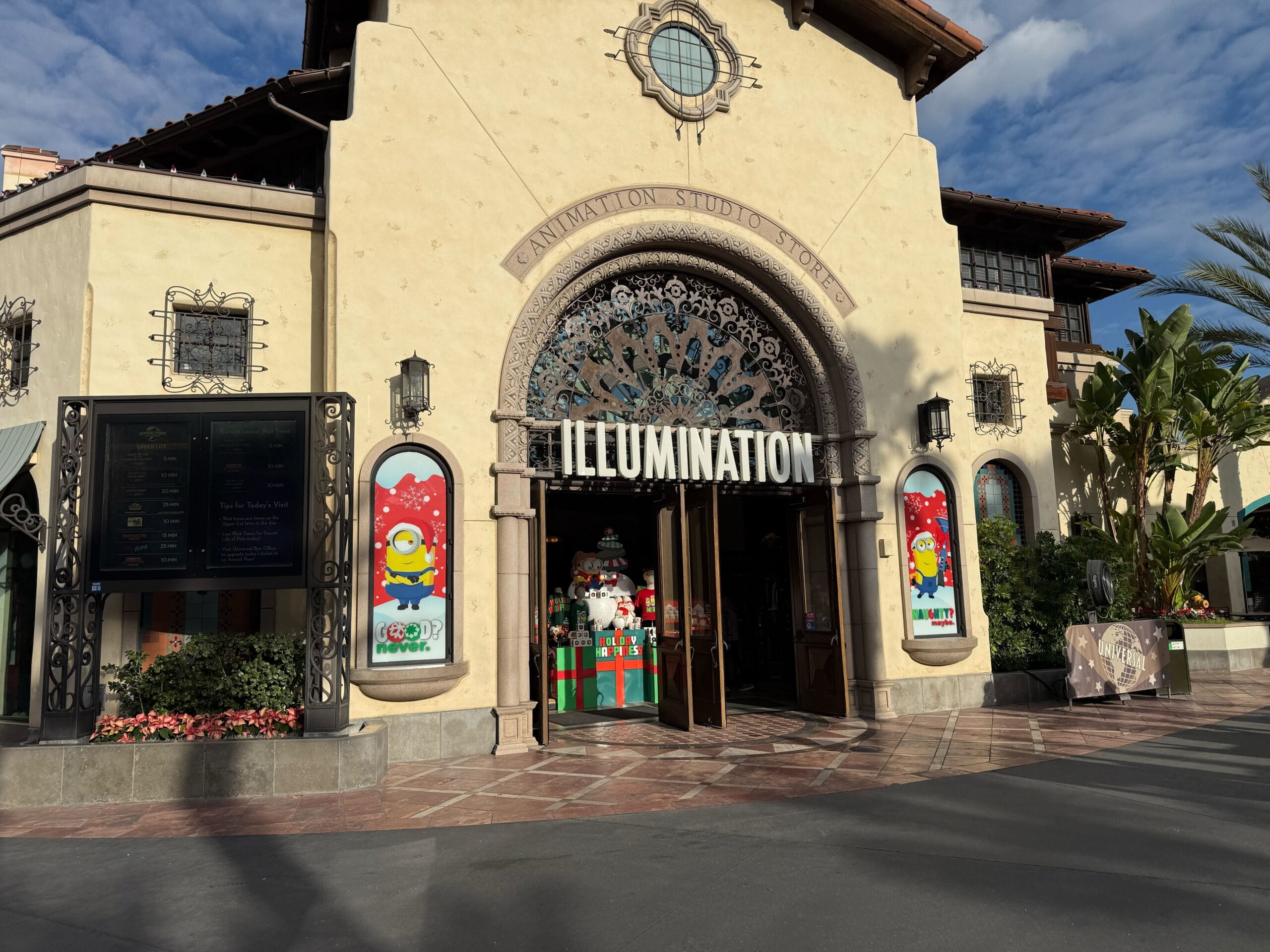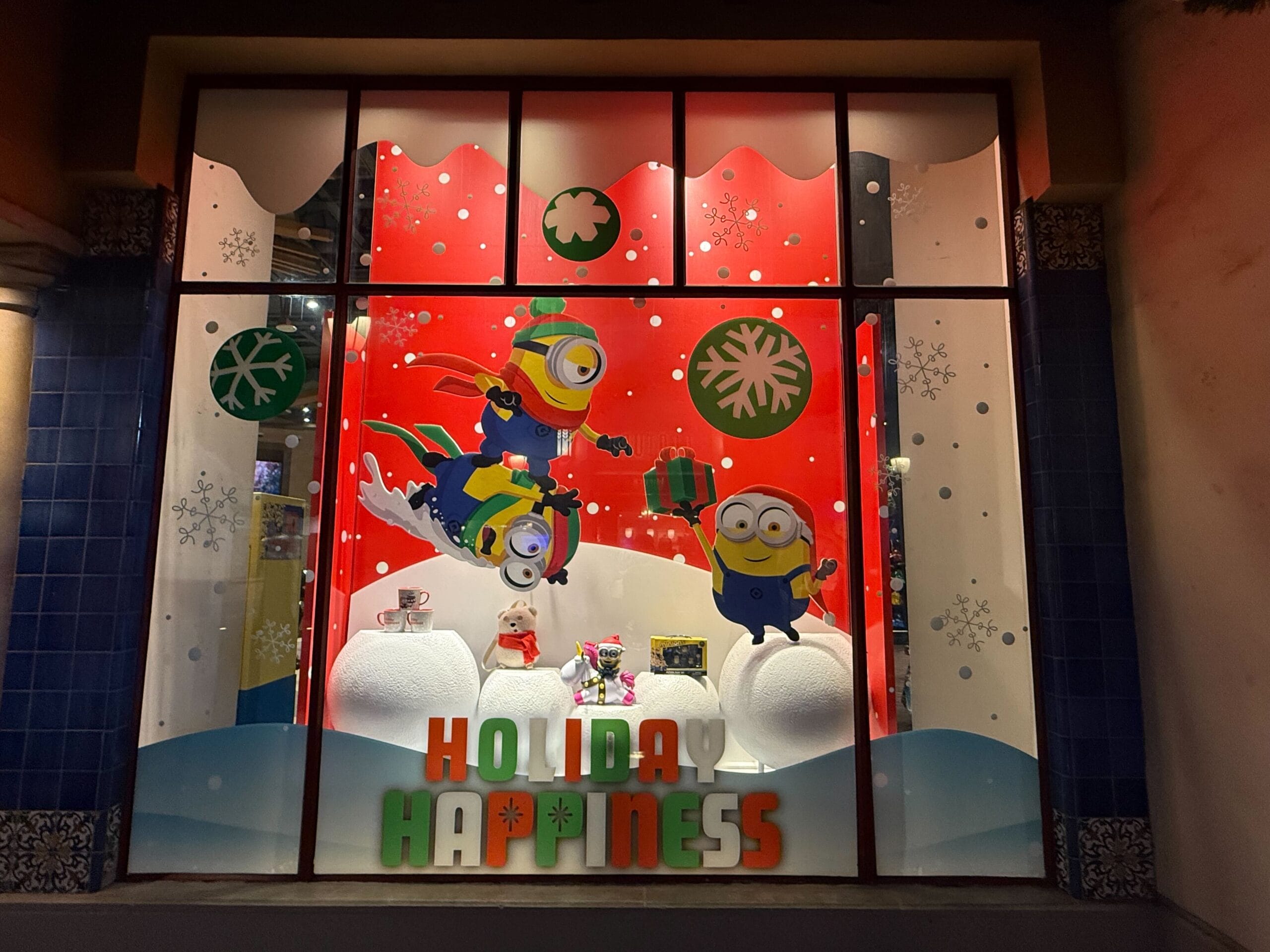 At the Illumination store, holiday Minion decals are in the windows to either side of the entrance. They read, “Good? Never” and “Naughty? Maybe.” Christmas present displays are inside.