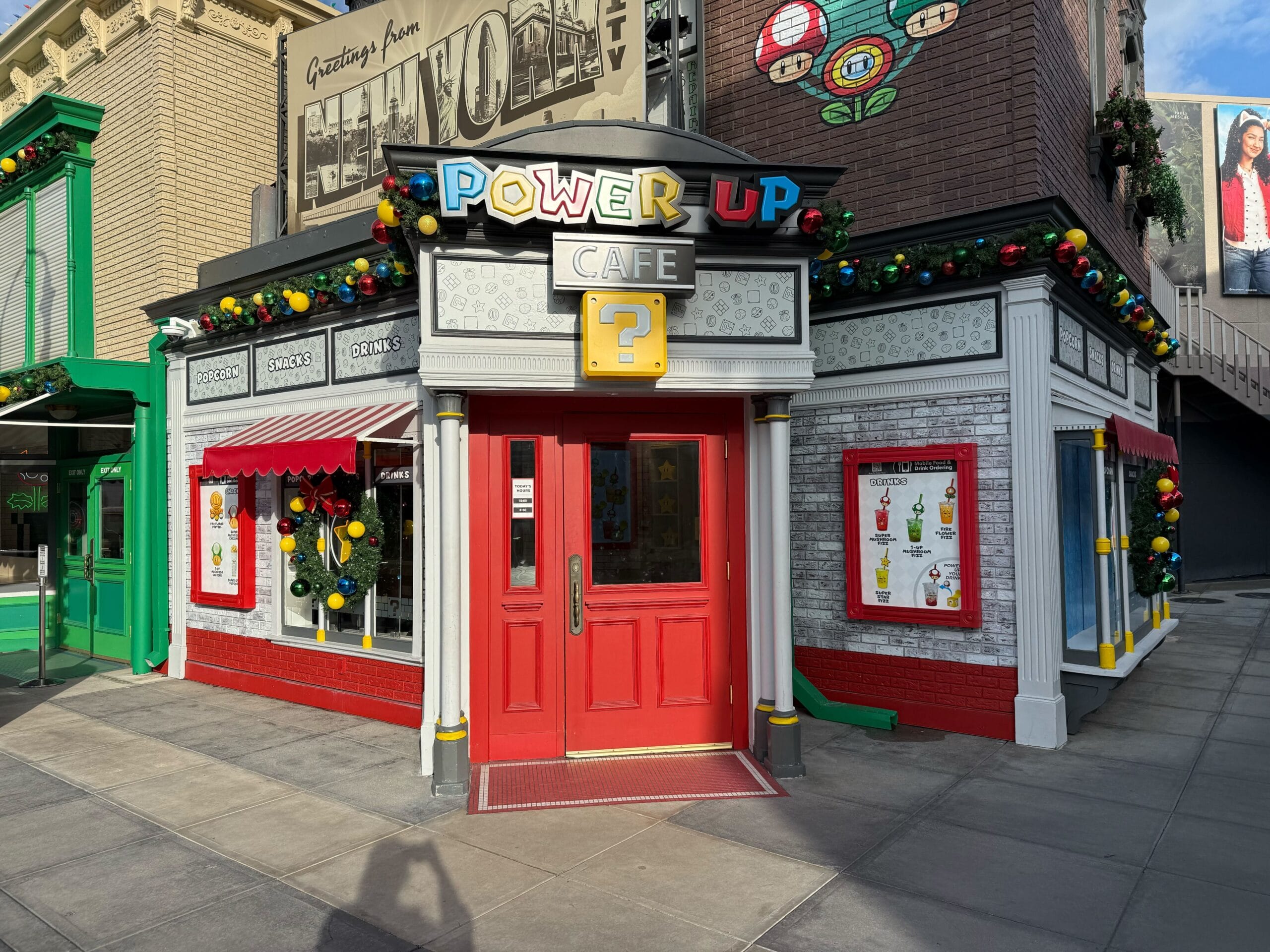 The Power-Up Cafe has colorful garland around its roof and wreaths on the windows.