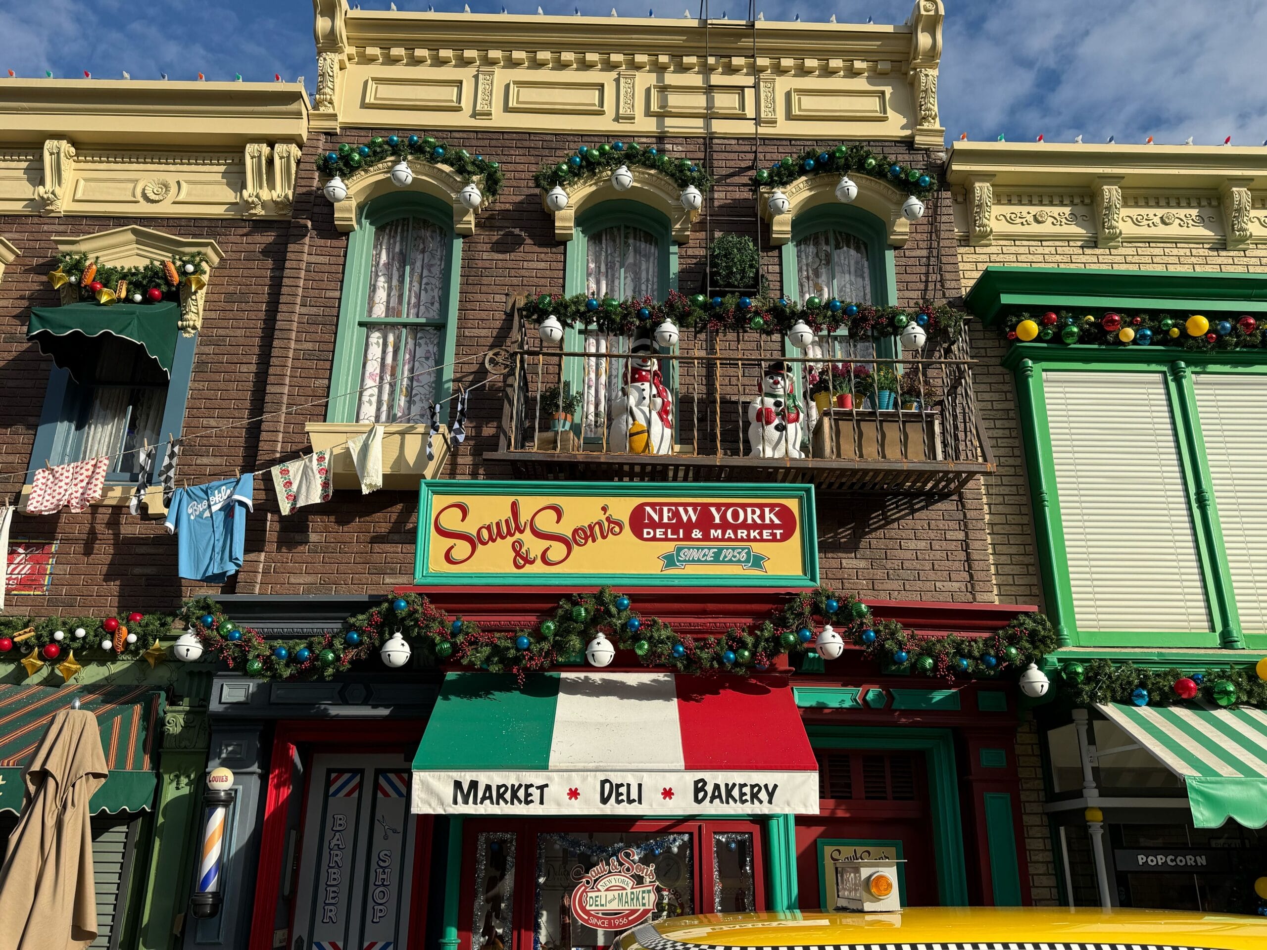 More decorations are throughout the streets of New York. A pair of plastic snowmen are on a balcony. Garlands across this deli feature big white bells. The Manhatten Market facade has garland decorated with golden stars and hot dogs, plus a Christmas tree out front.