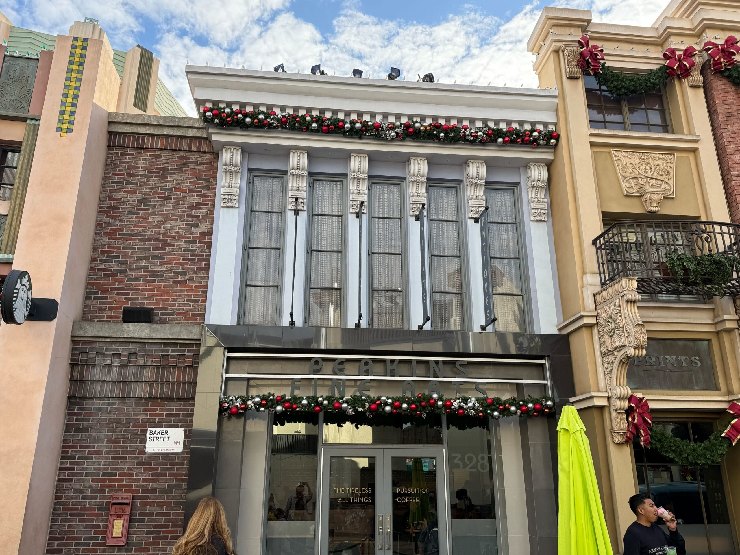 The Perkins Fine Arts facade on Baker Street has garland with red and silver adornments. Next door are plain green garlands attached with big red bows.