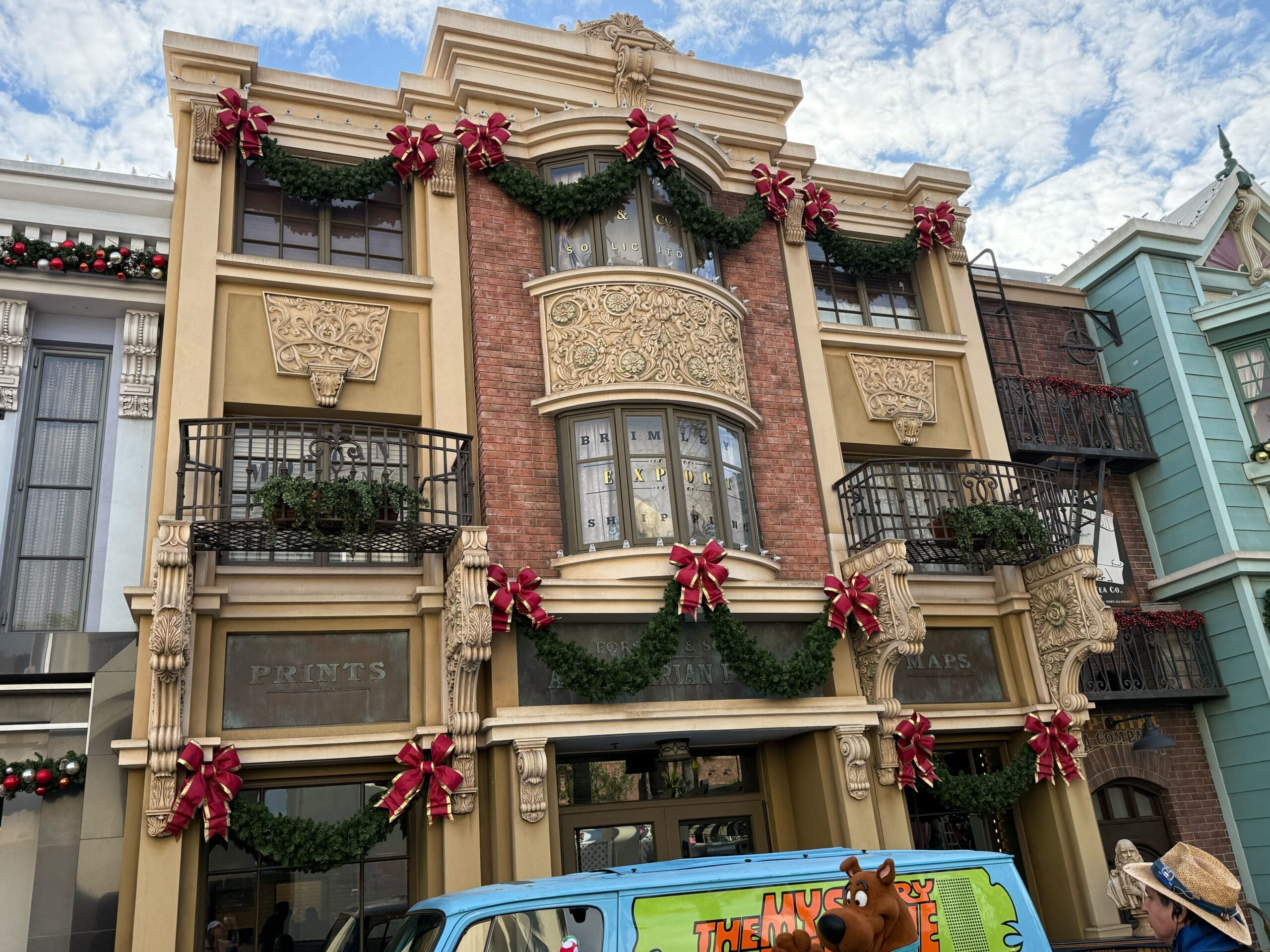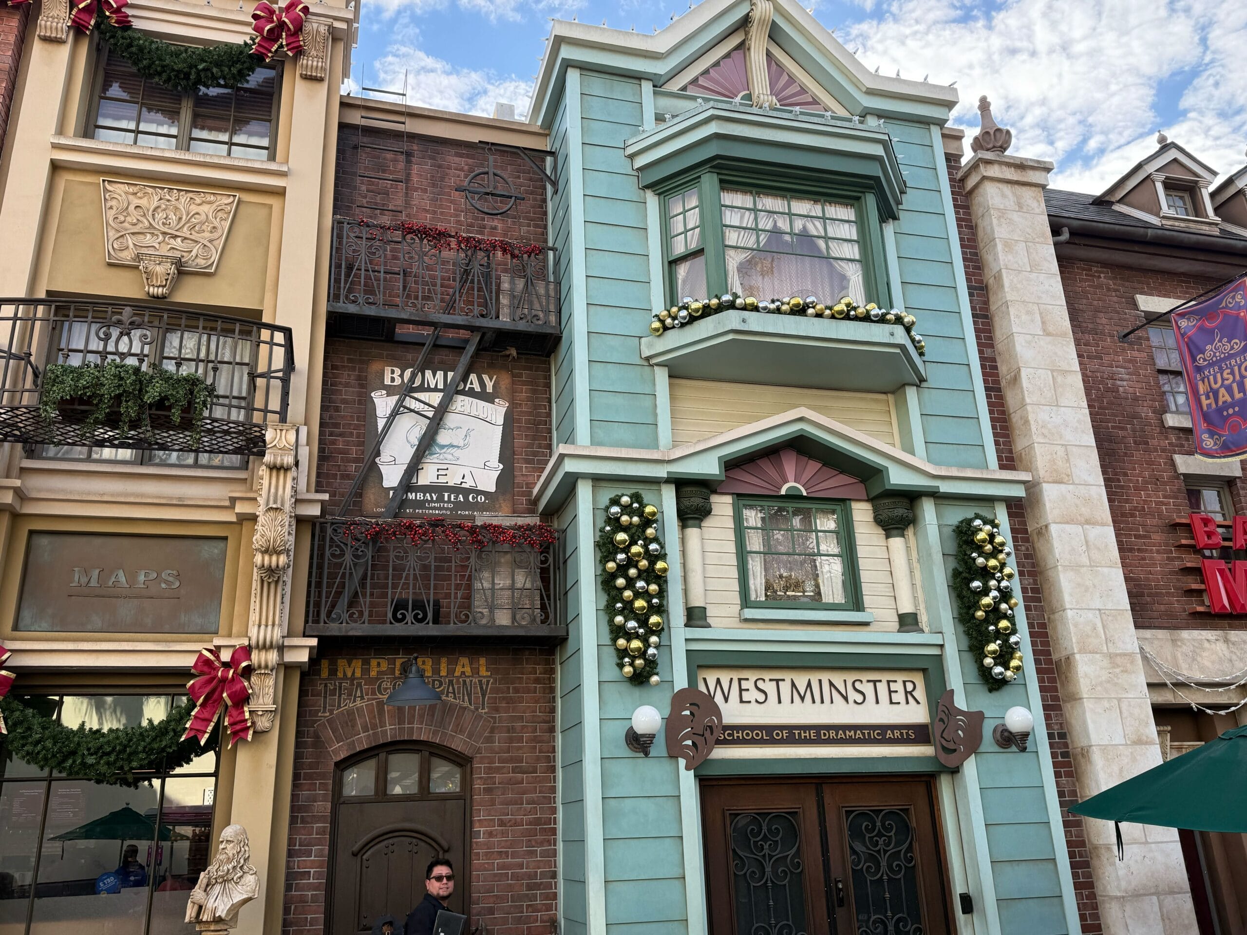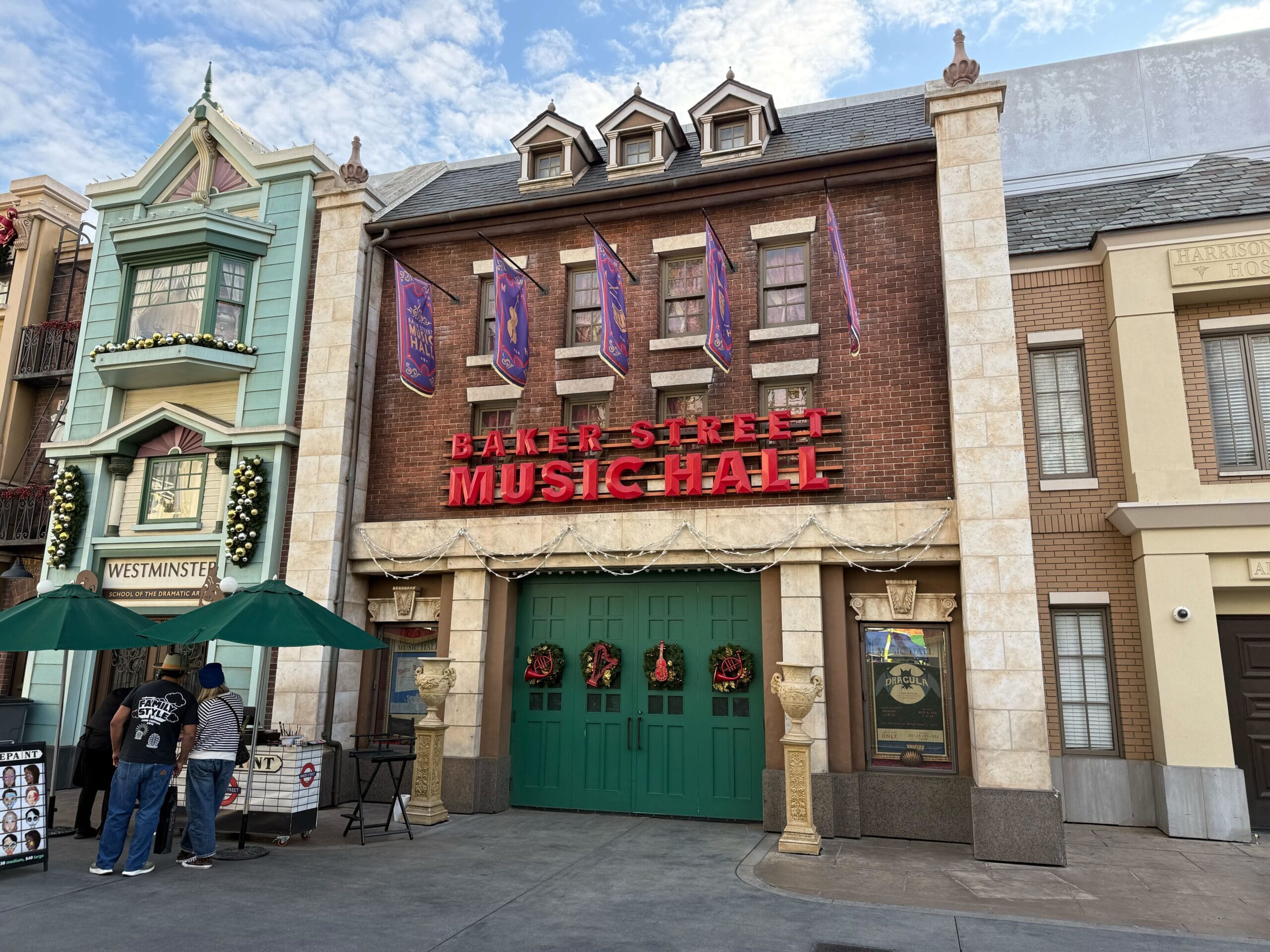 The Westminster School facade has garlands full of silver and gold ornaments. And the Baker Street Music Hall has wreaths on its barn doors. Each wreath features a different red musical instrument.