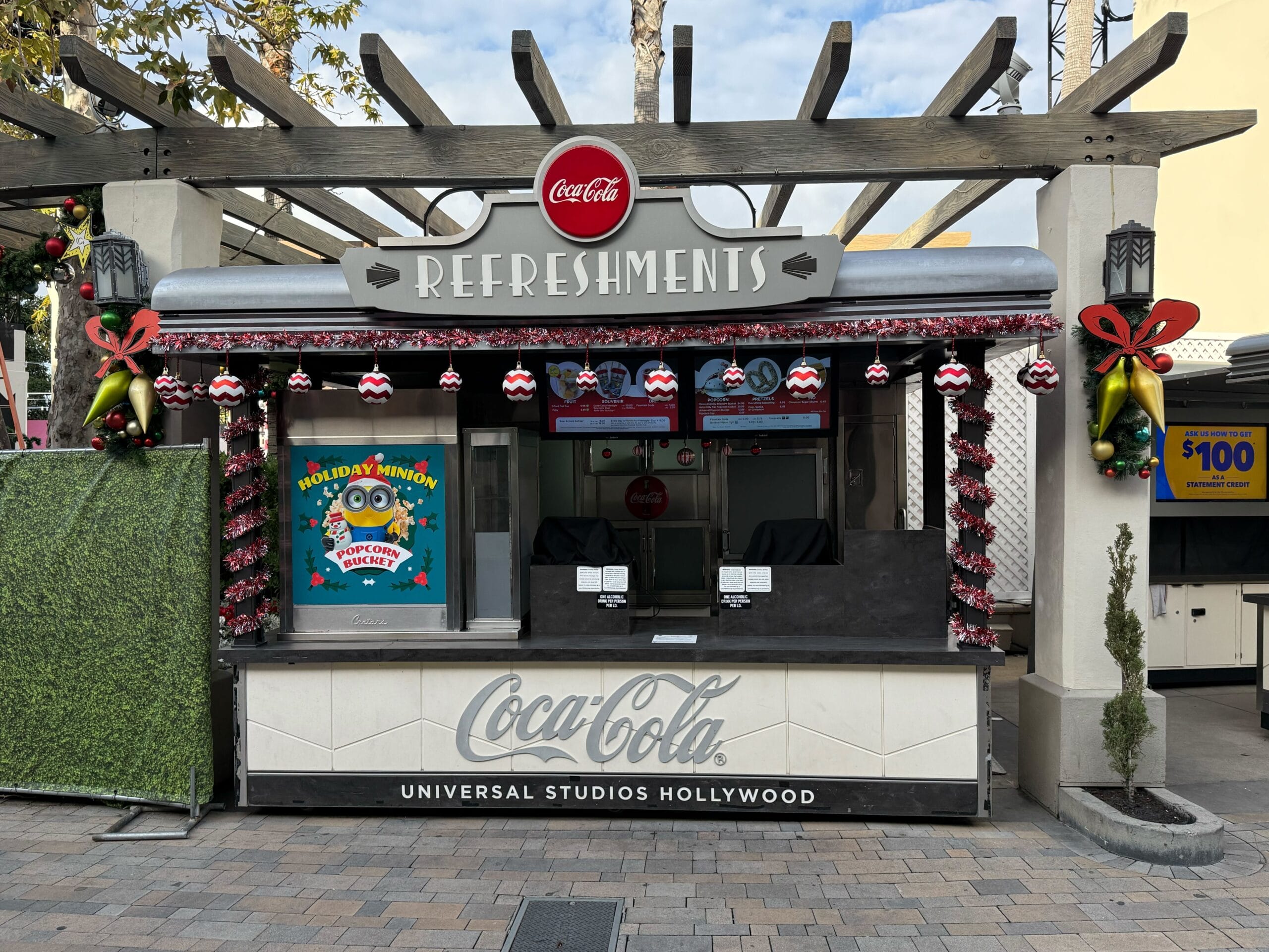 Red and silver tinsel is wrapped around the supports of the Coca-Cola Refreshments stand. Matching ornaments hang from the overhang.