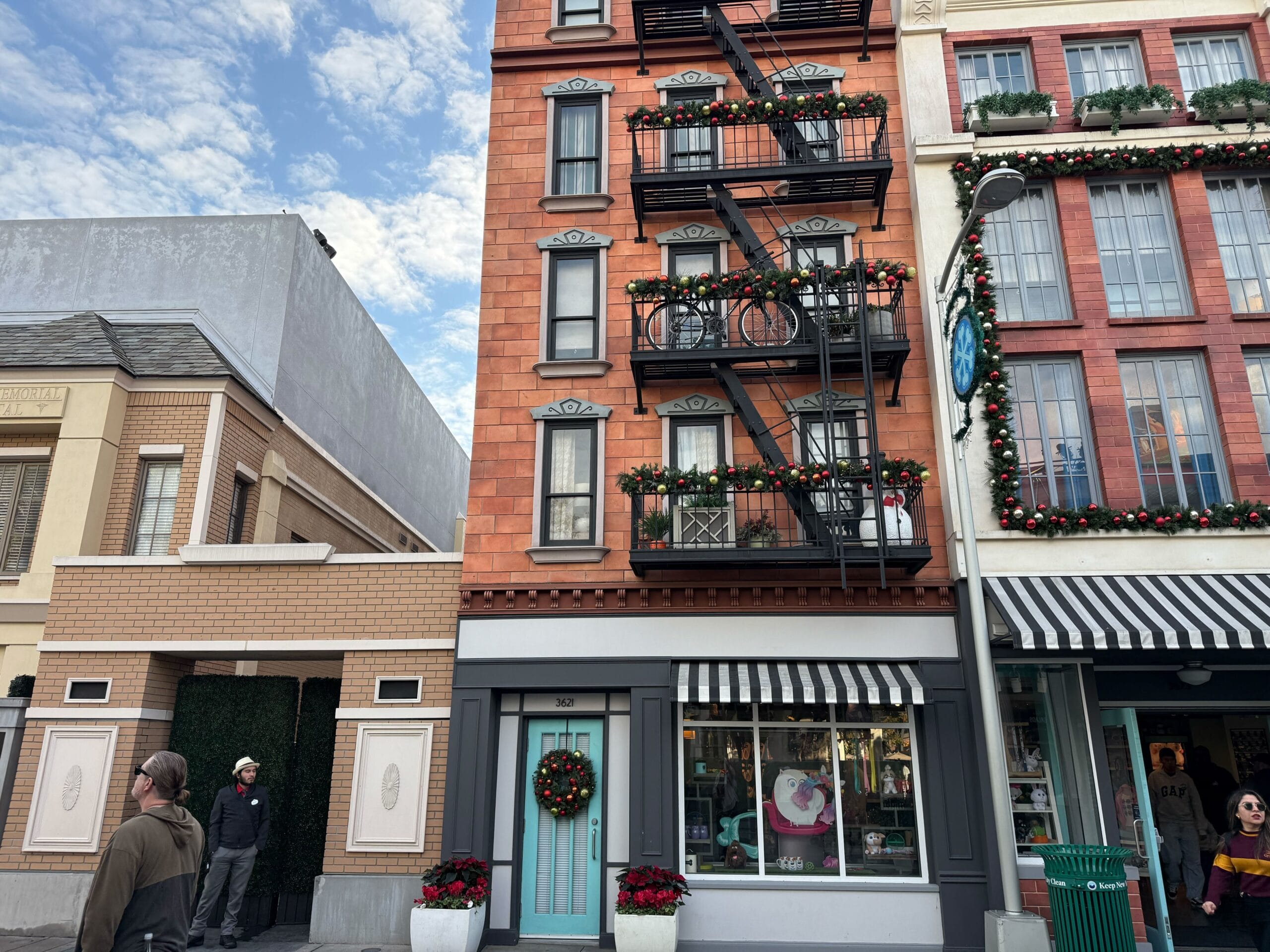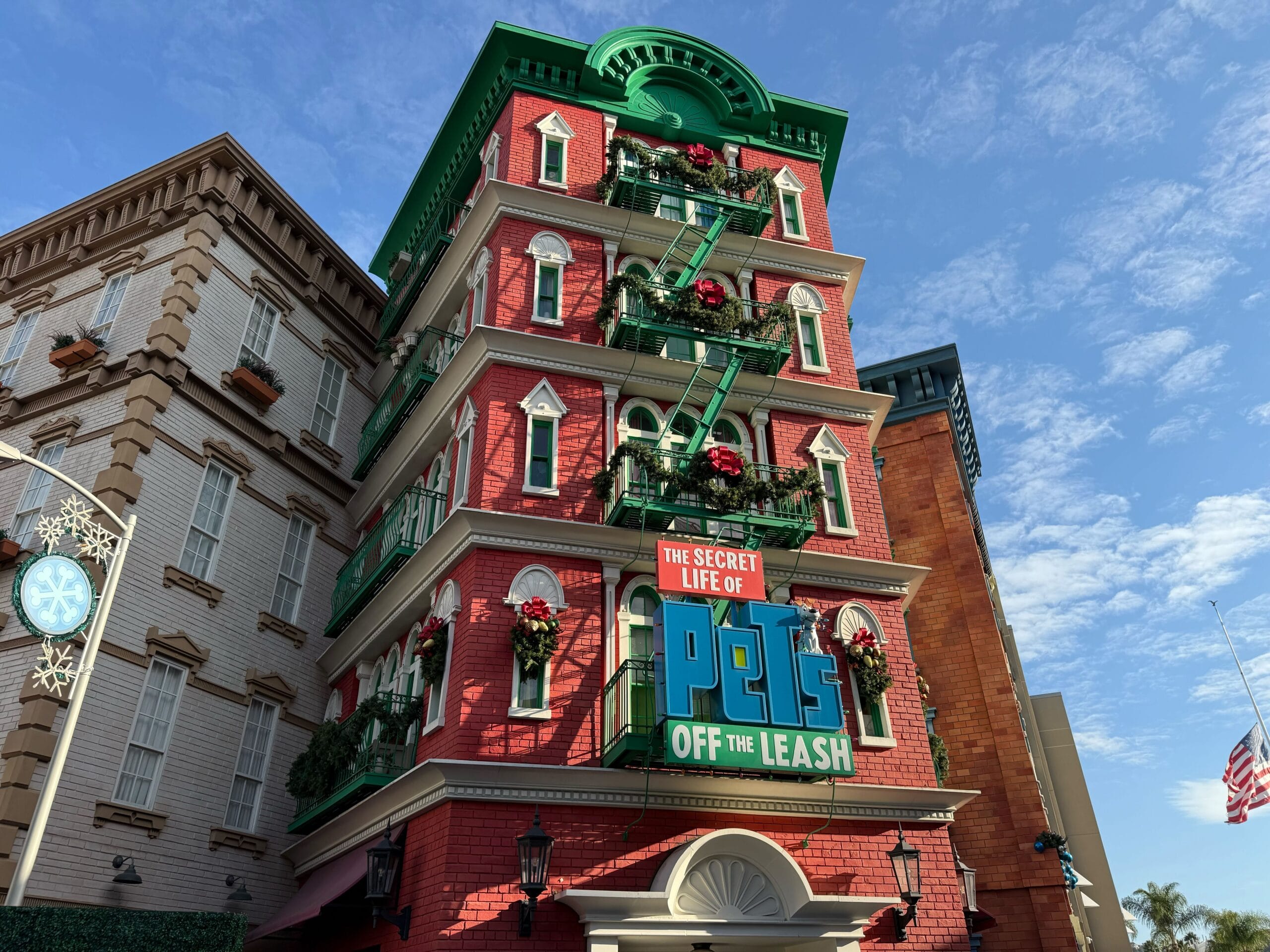 The facade of The Secret Life of Pets: Off the Leash has garlands across its fire escape. There are decorations on the lower windows. These all have big red bows.