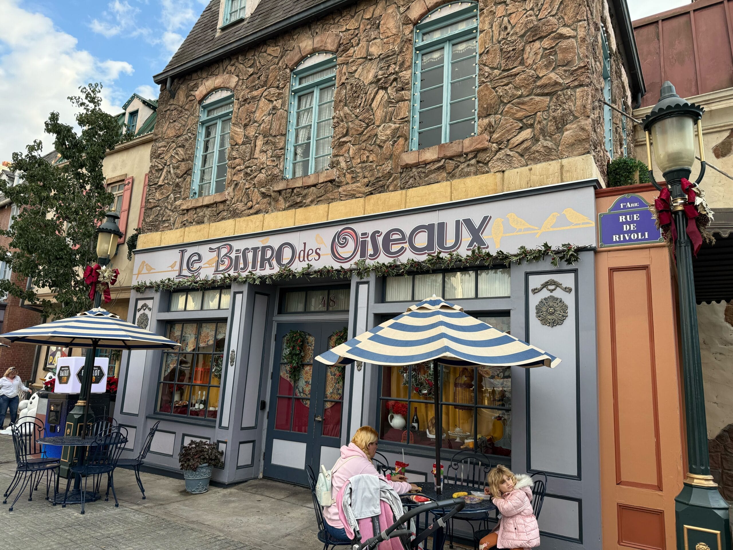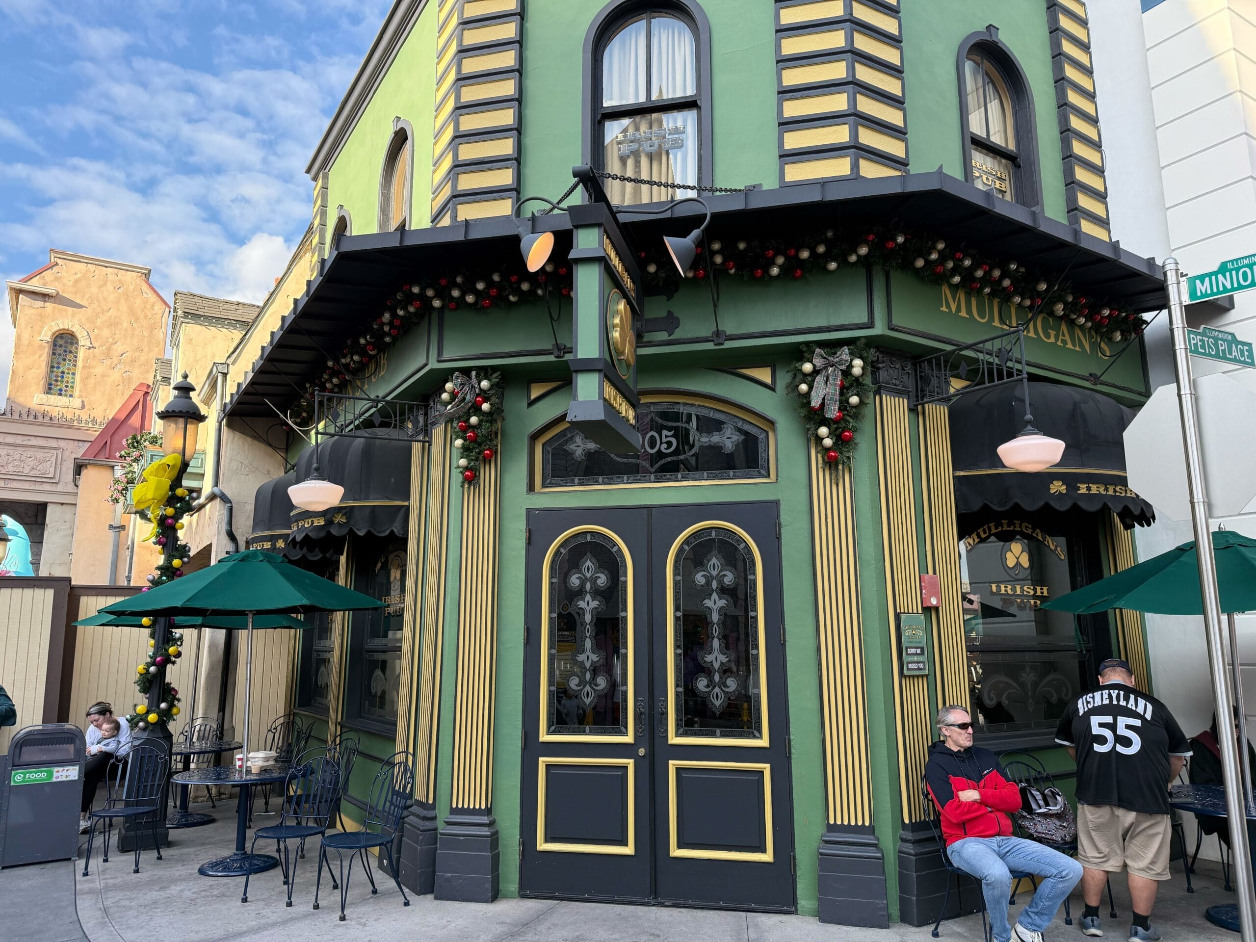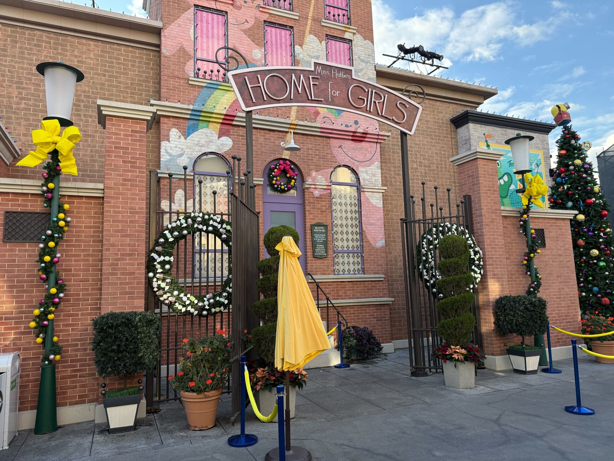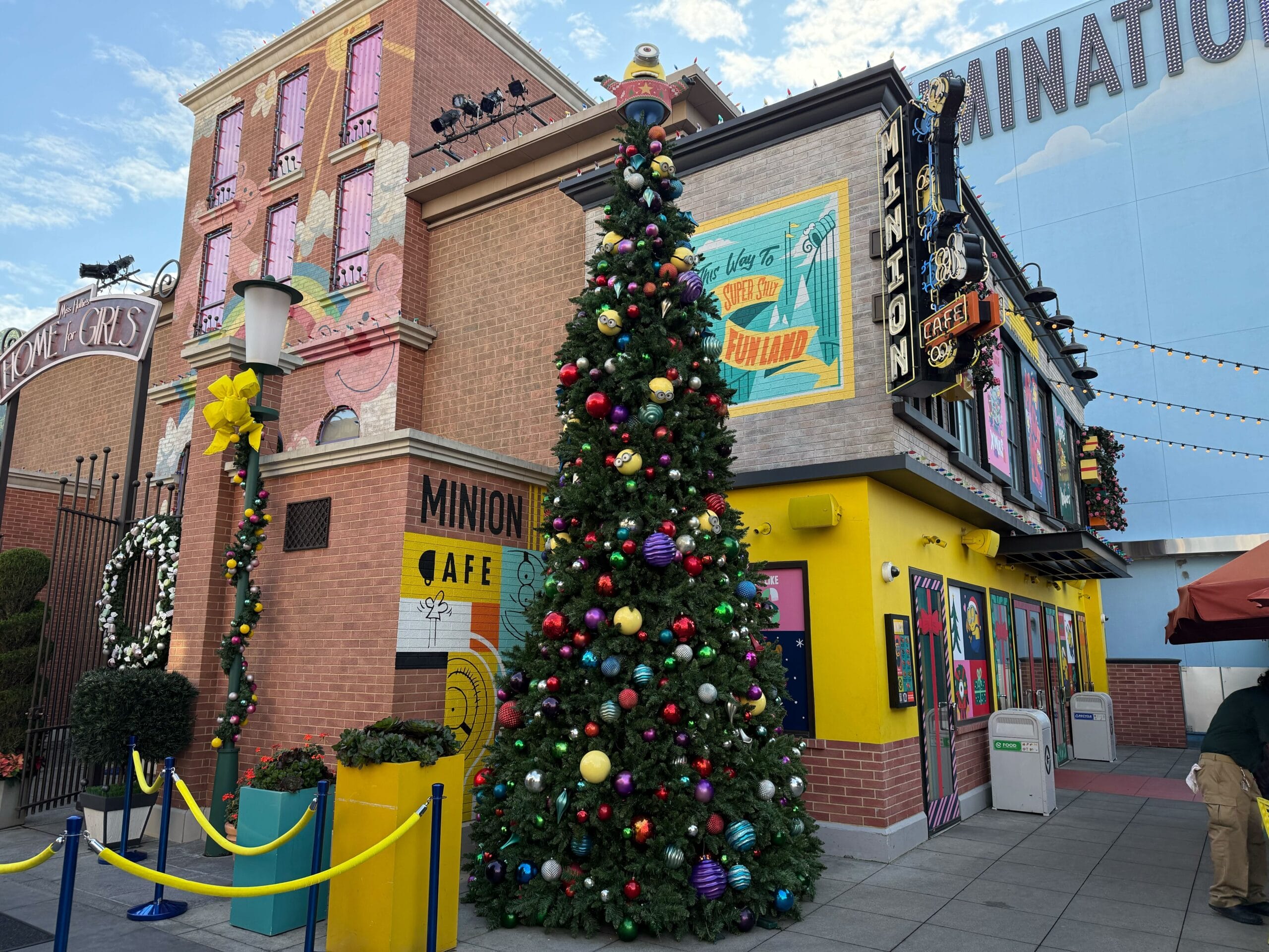 A Christmas tree on the corner next to Minion Cafe is full of colorful ornaments. It’s topped with a Minion wearing a Christmas sweater.