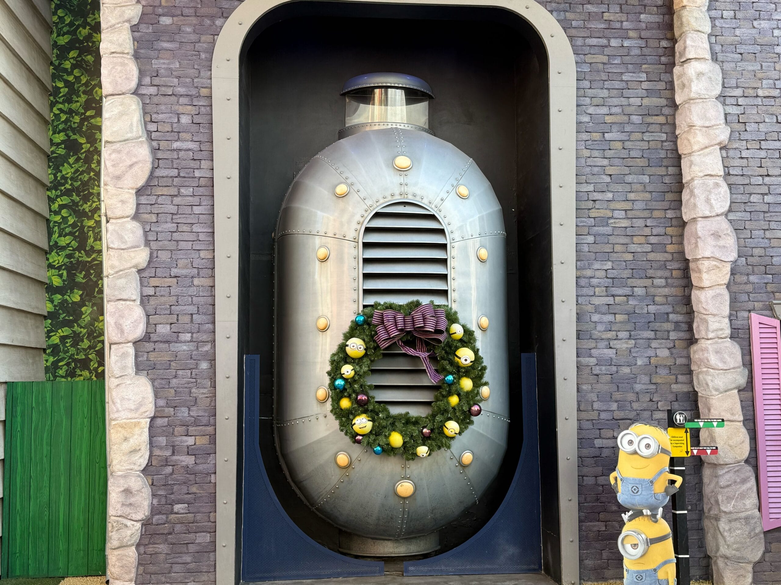 Outside Despicable Me Minion Mayhem is a wreath featuring Minion ornaments.