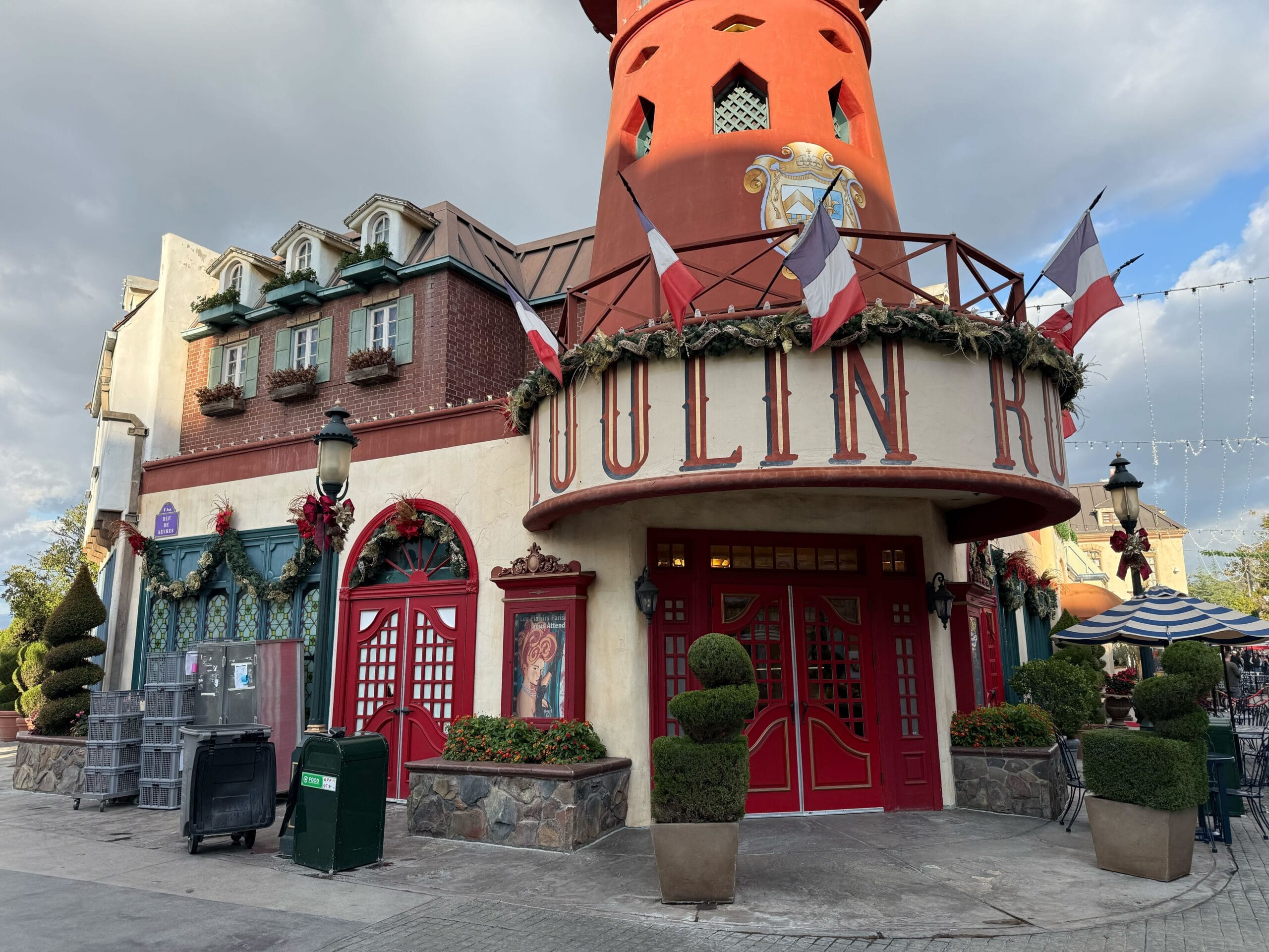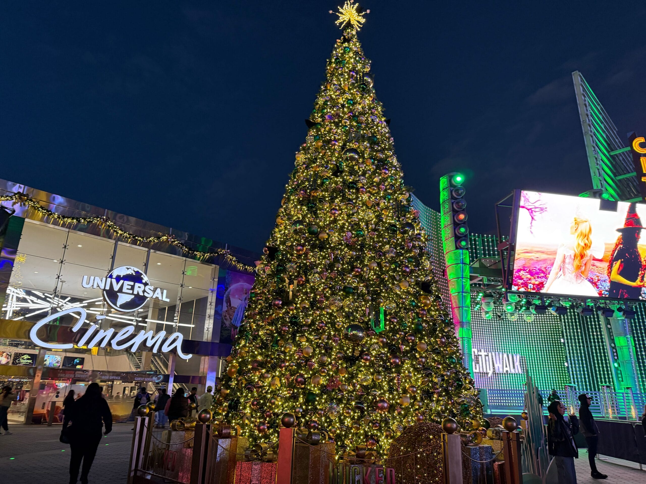 And of course, there’s a giant Christmas tree. It’s located outside the cinema and features a pink and green color scheme in honor of Wicked: For Good. The green “W” logo glows near the center of the tree. The star on top resembles Glinda’s bubble wand.