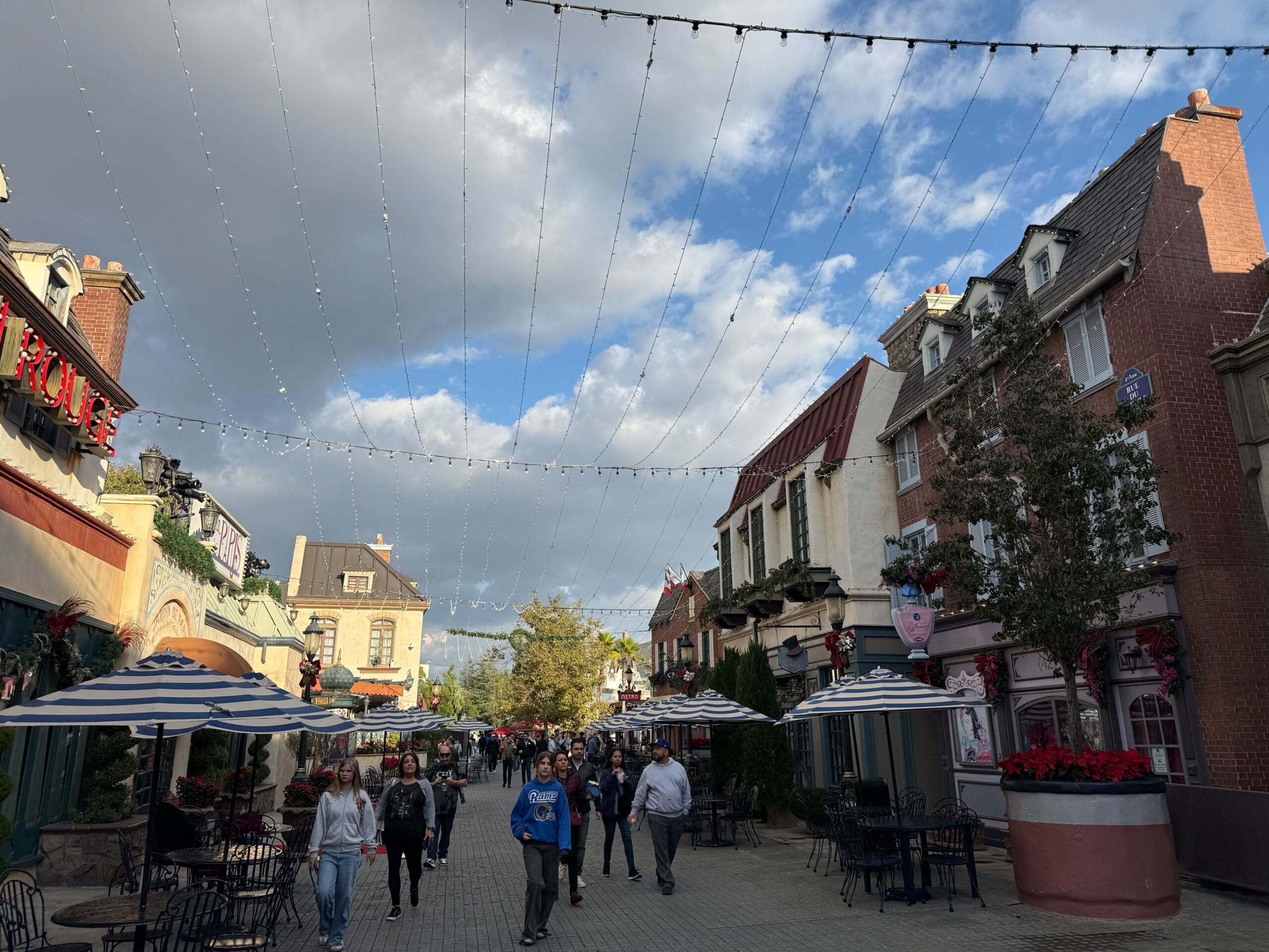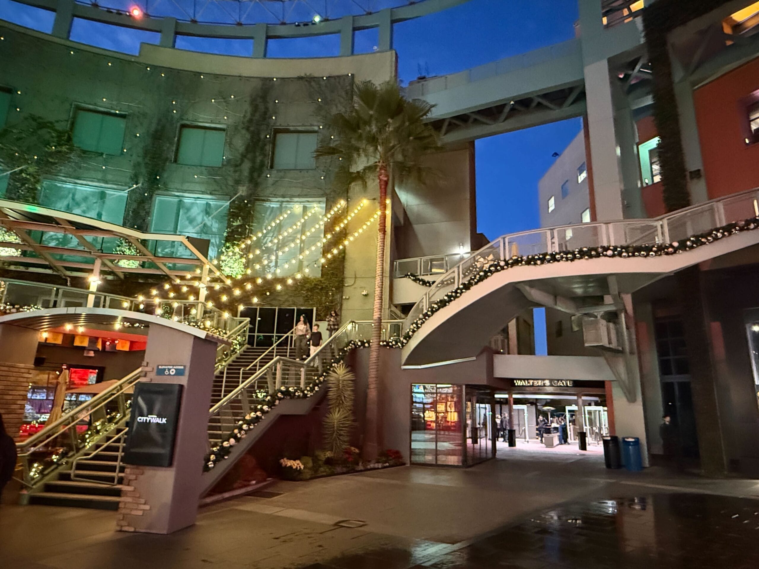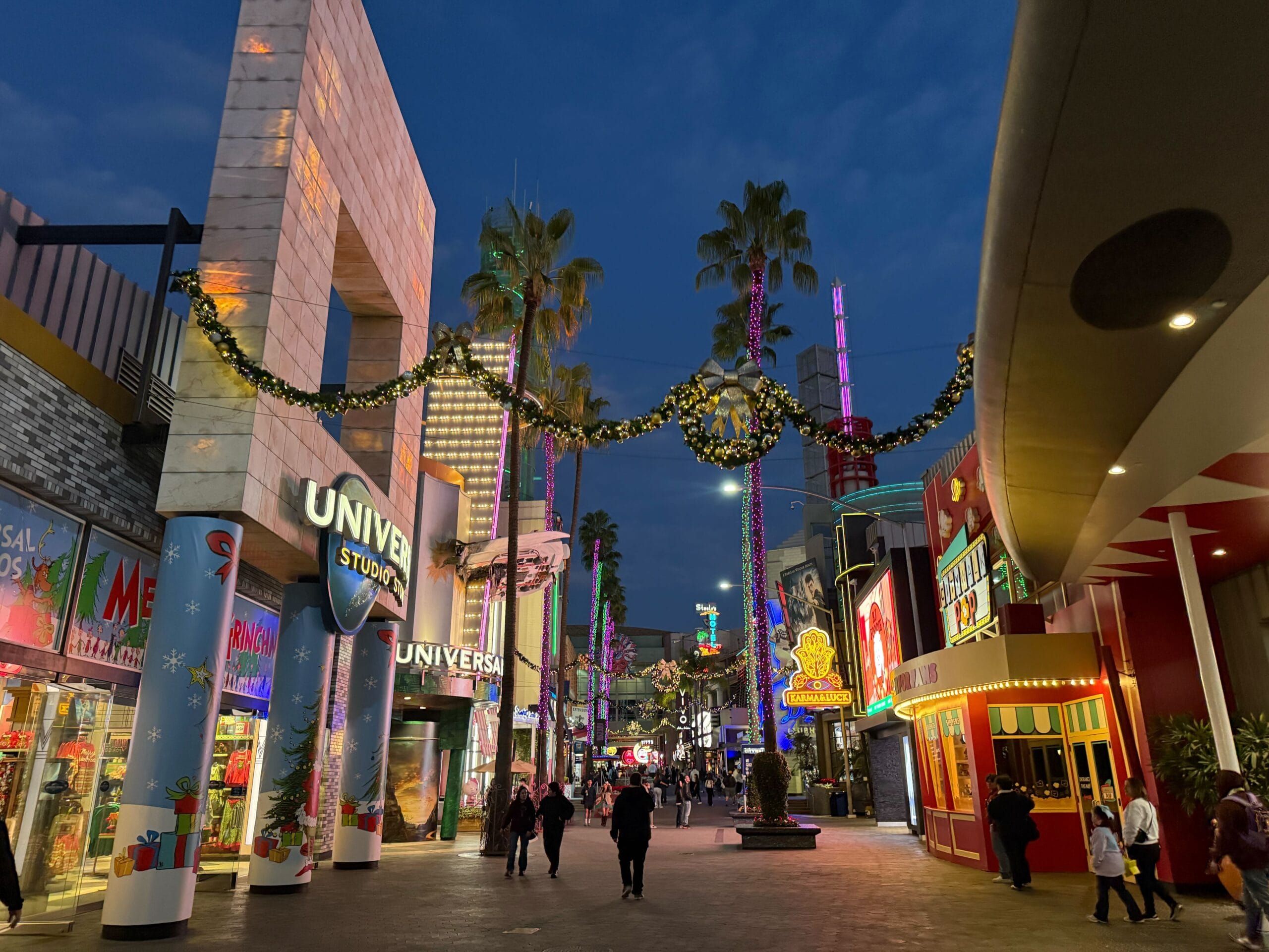 We caught CityWalk all aglow in the evening. Garland is hung above the sidewalk, with wreaths in the center. The palm trees are wrapped with green and purple lights.