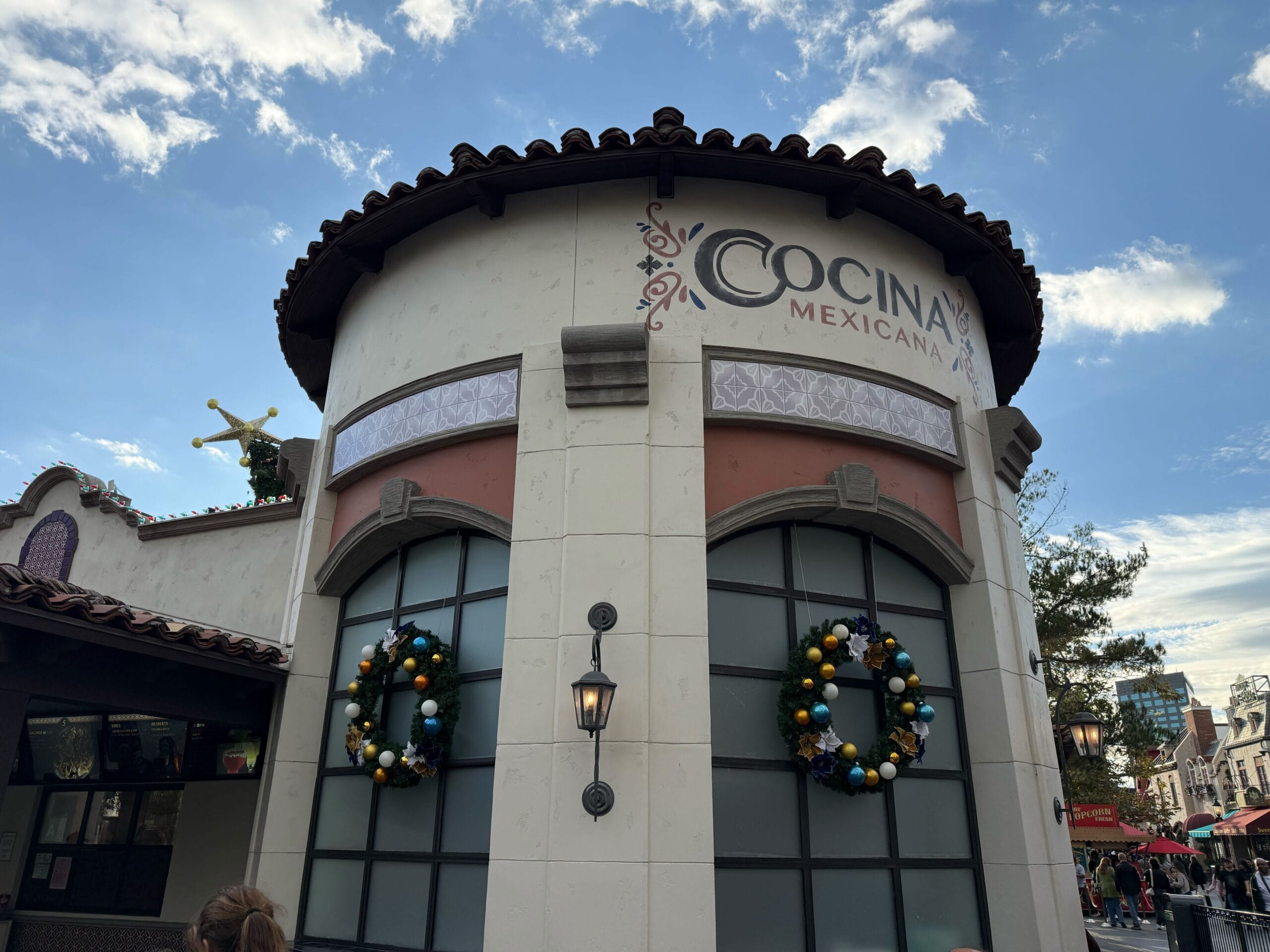 Cocina Mexicana has wreaths featuring white, orange, gold, and blue ornaments plus sparkling flowers.
