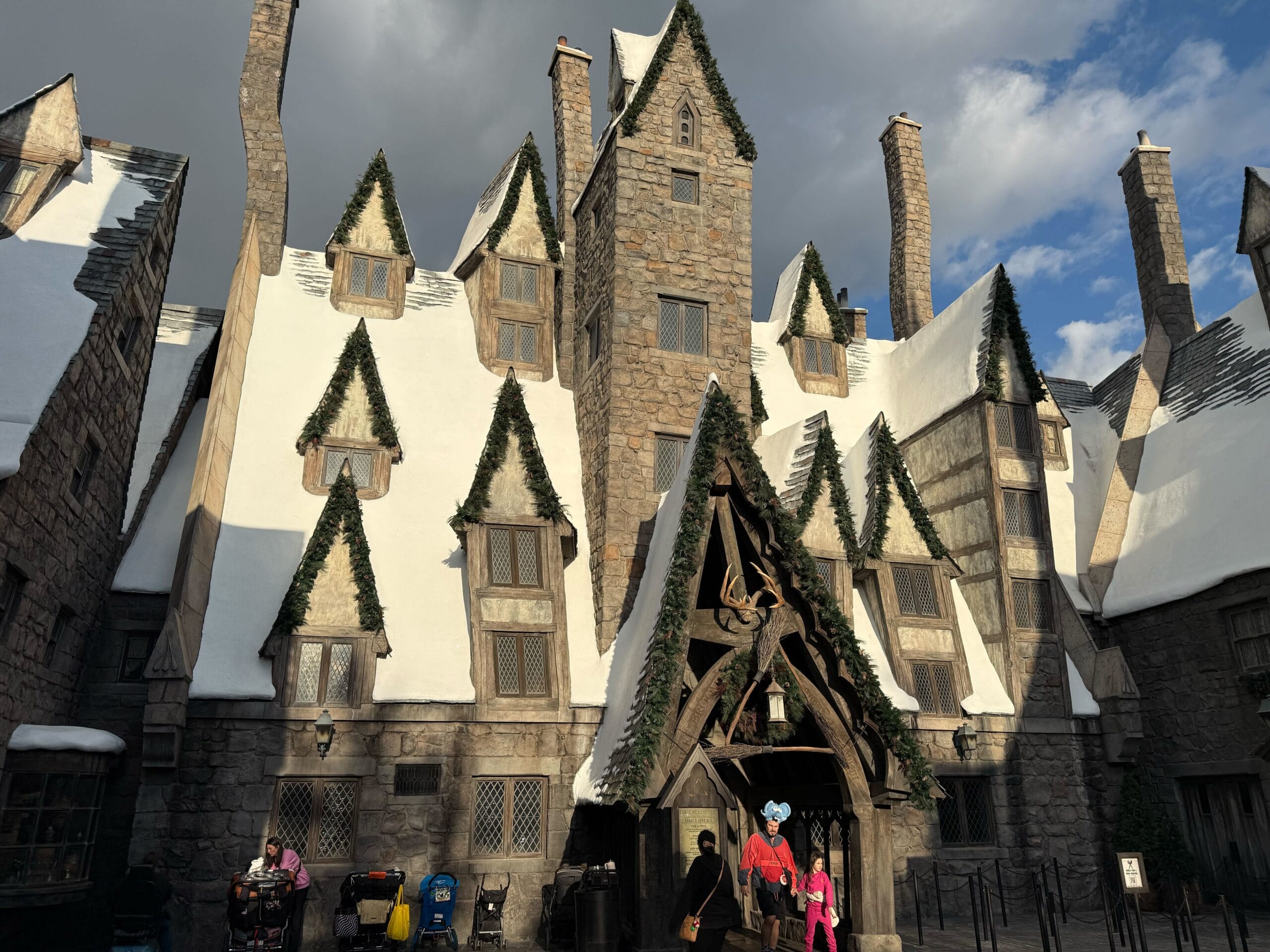 The entrance of The Three Broomsticks has garland, as do all of its gable roofs. A wreath hangs behind the trio of broomsticks above the entryway.