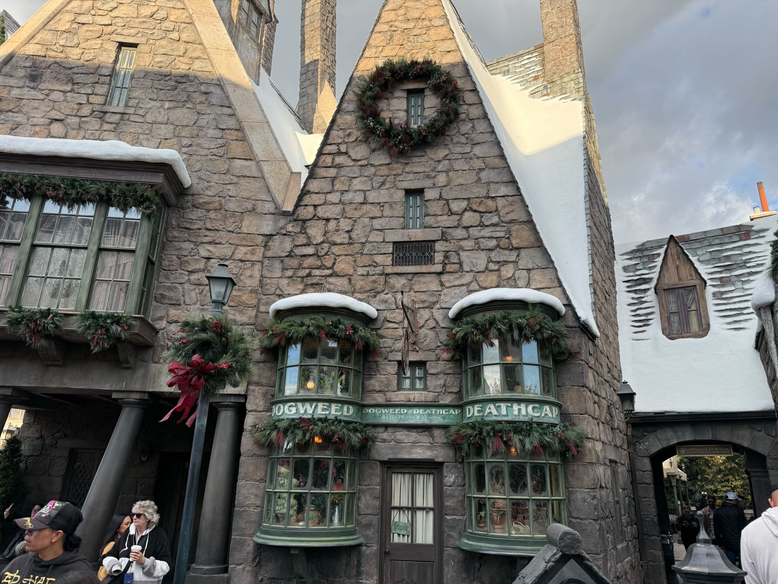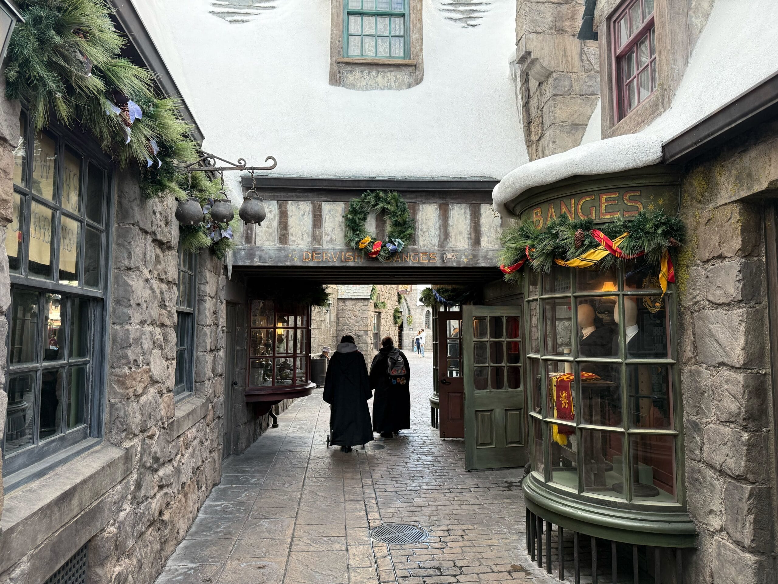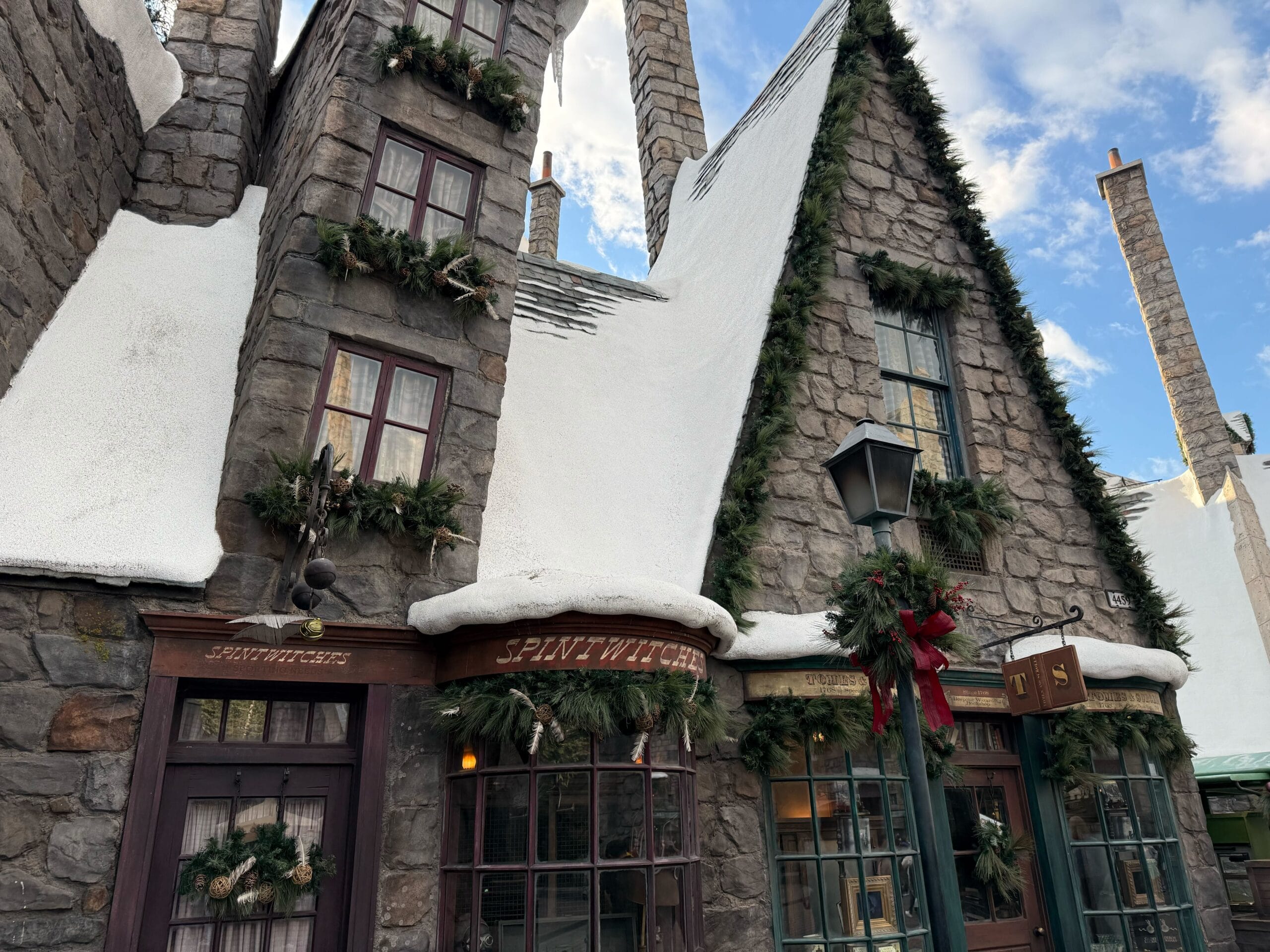 The Spintwitches sports shop features Golden Snitch decorations in its garlands and wreath. The neighboring Tomes and Scrolls bookshop has simpler decorations with no extra adornments.