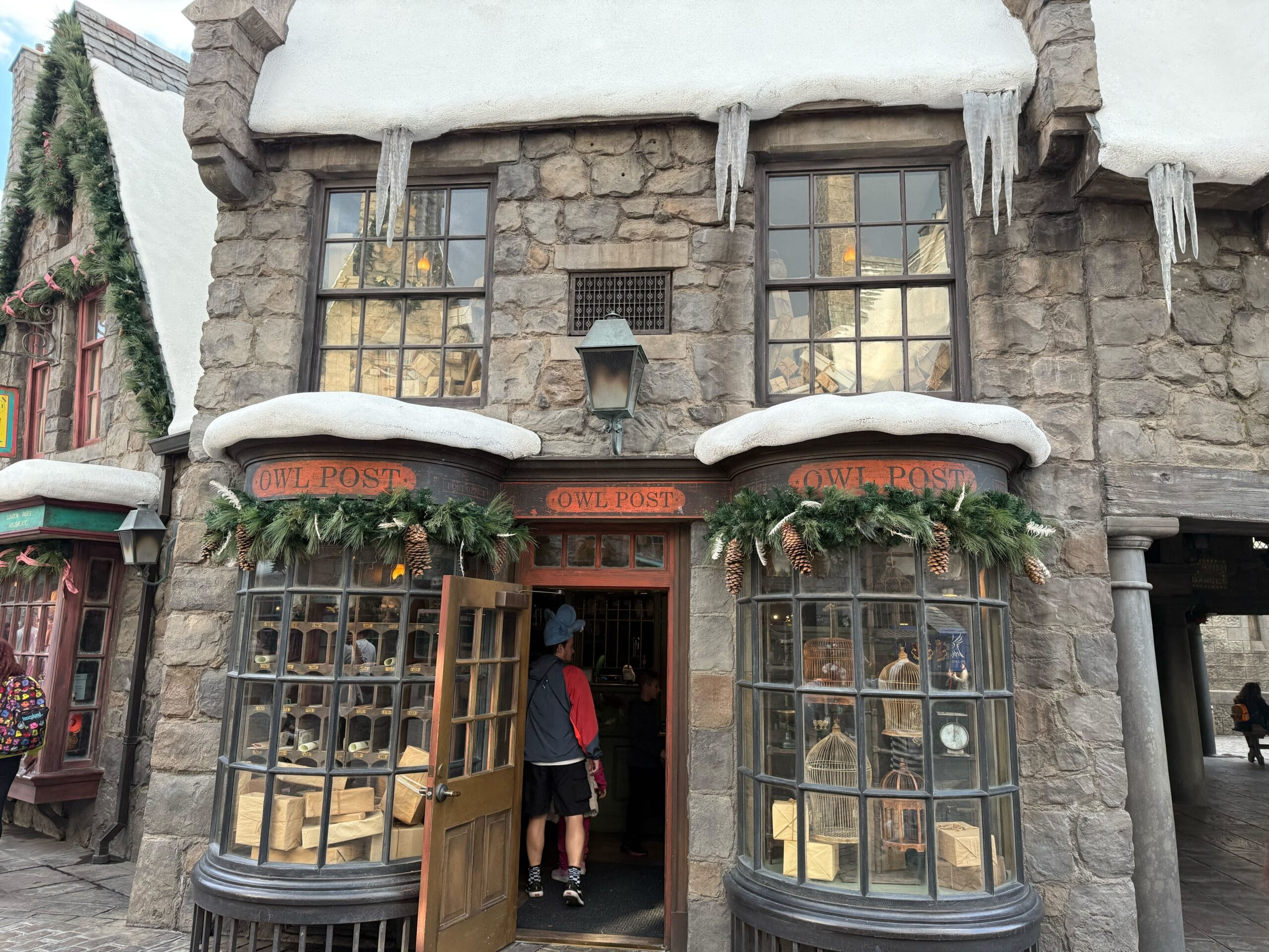 Garland hangs above the other Studio Store door. Inside are more small trees and holiday signs alongside holiday Harry Potter merchandise.