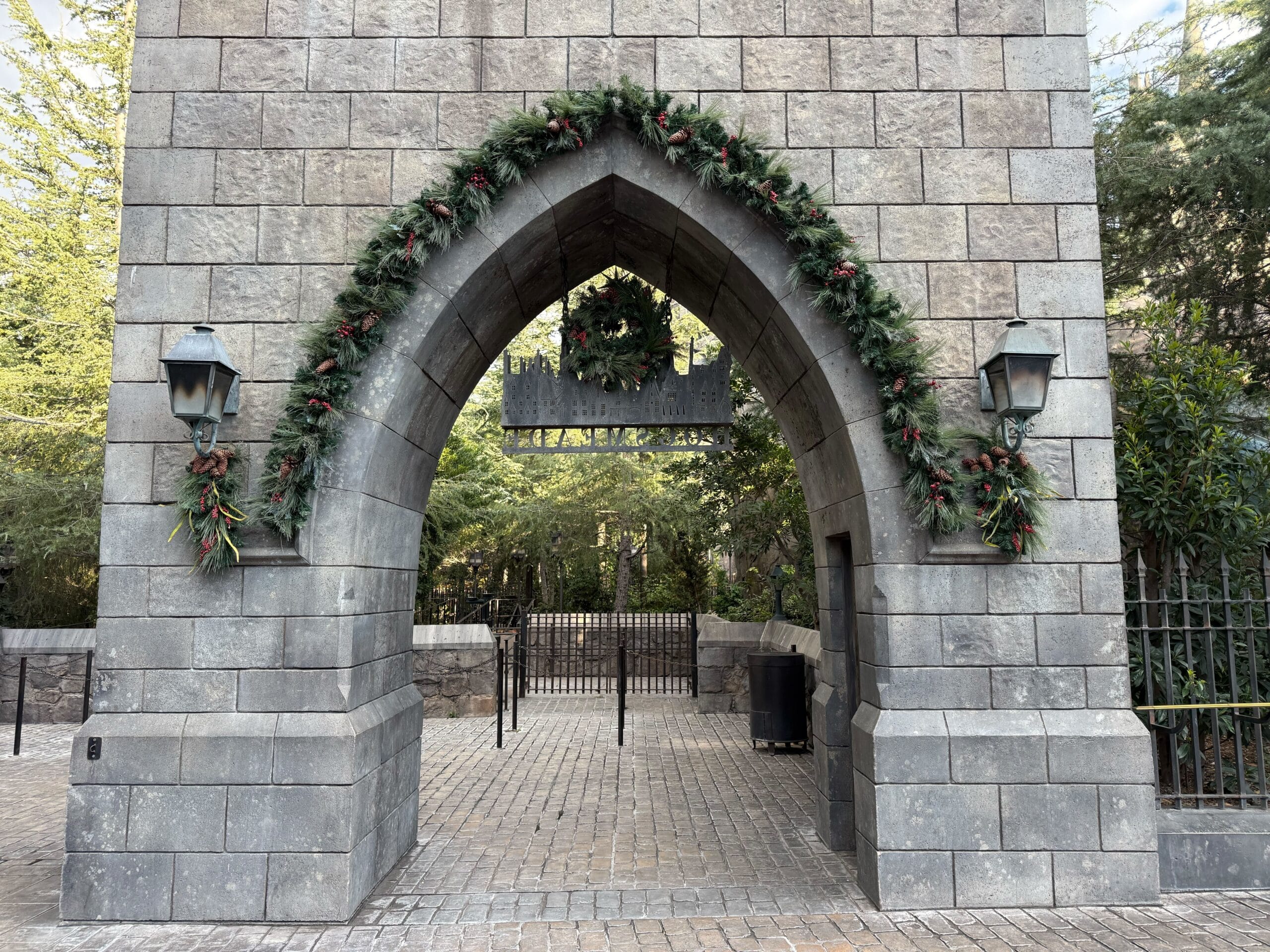 There are garland decorations on the columns of the Hogwarts entrance gate. These are topped with red flowers.