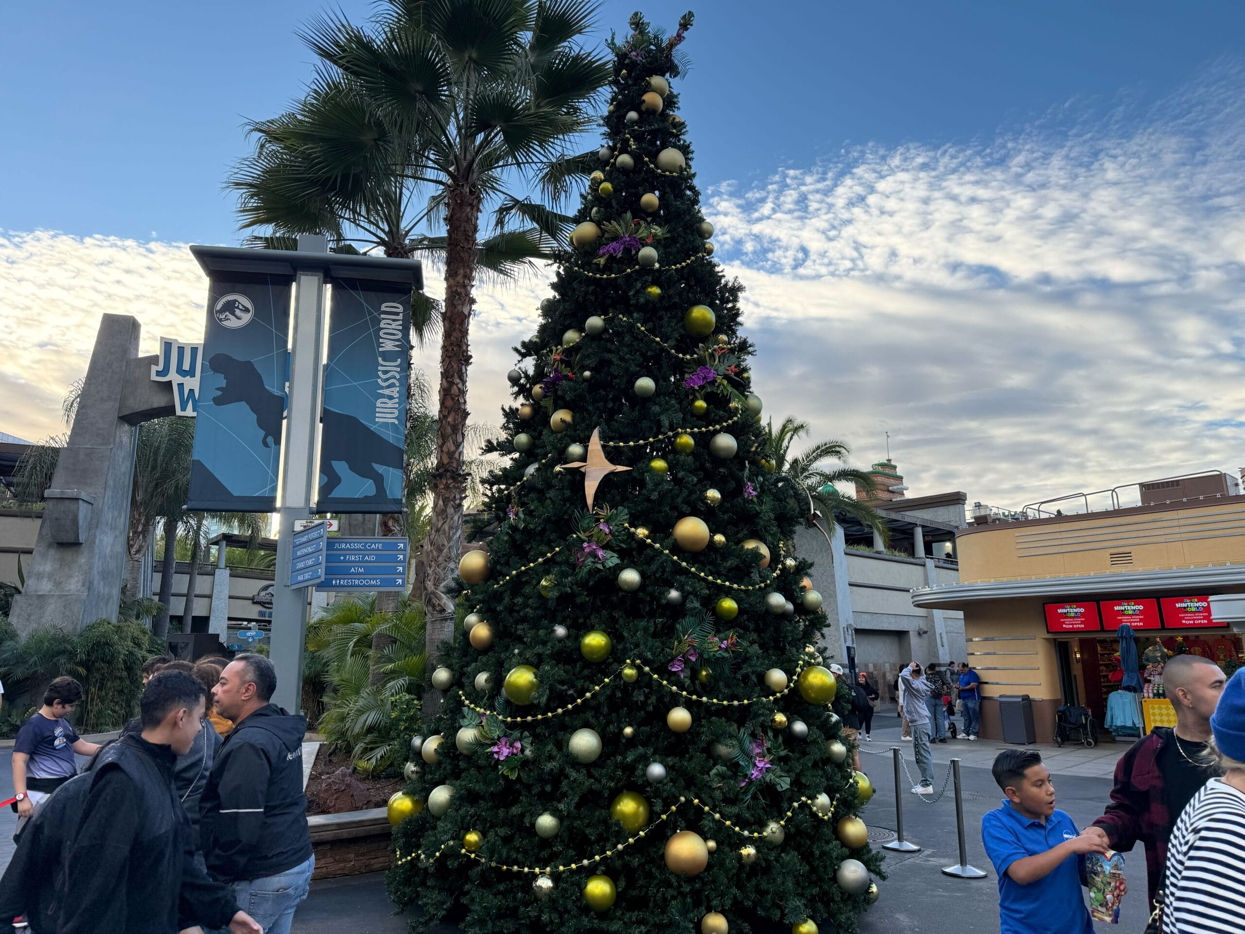 A big tree greets guests on the Lower Lot as they enter Jurassic World. Though the tree mostly features standard baubles, there are also tropical flowers and pteranodon decorations.