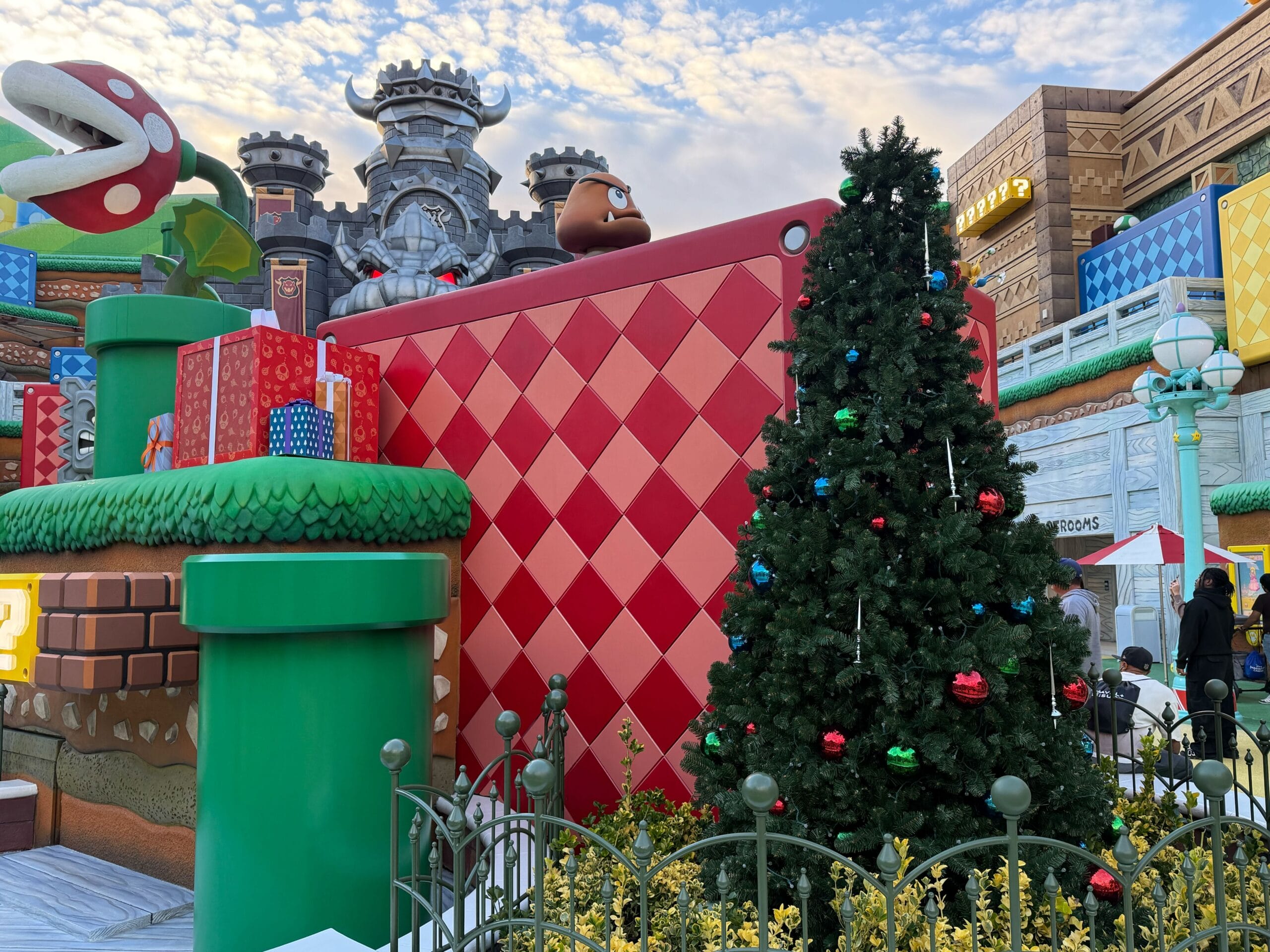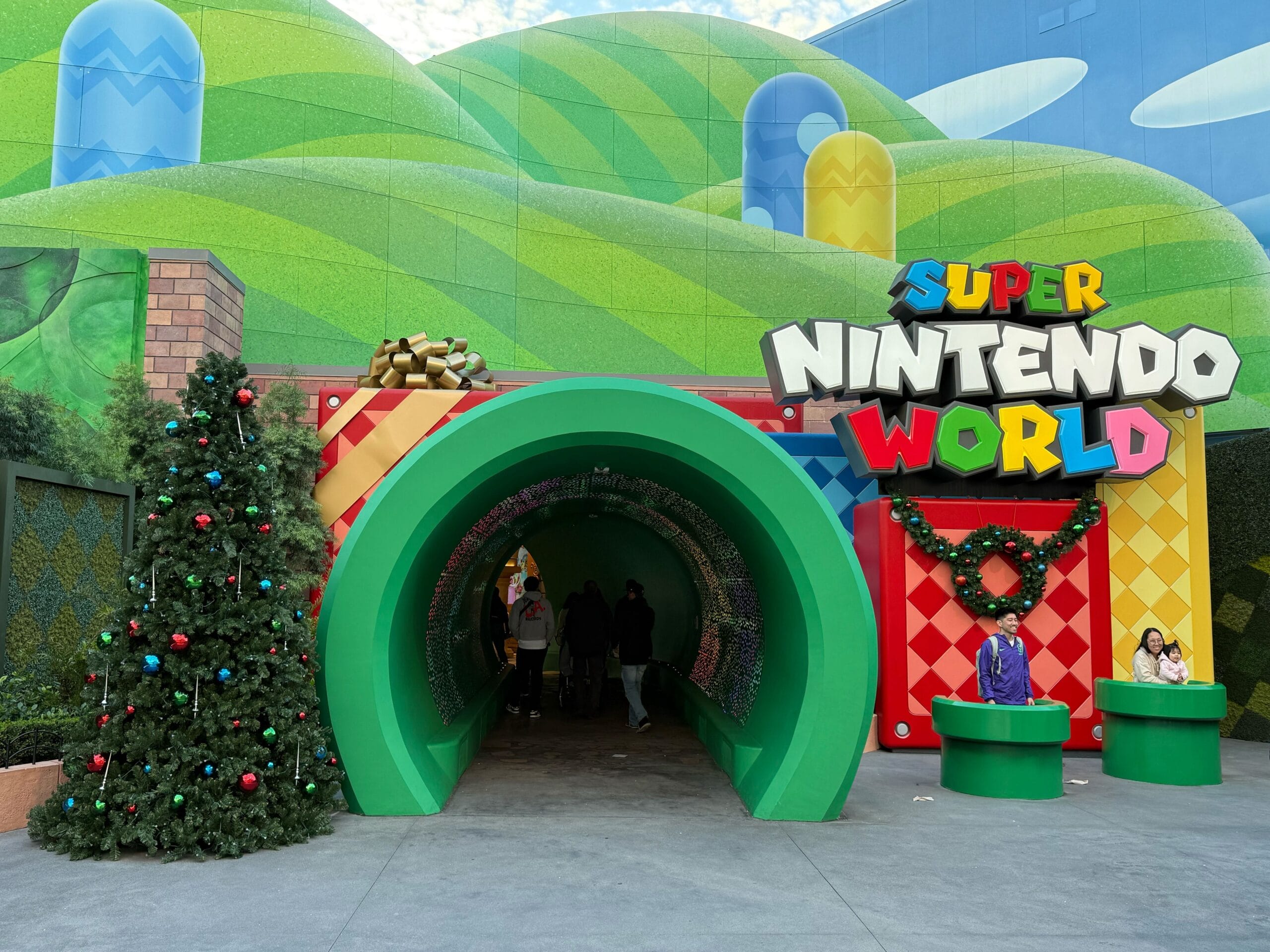 Super Nintendo World has a Christmas tree out front with red, green, and blue baubles. One of the blocks behind the green warp pipe has been turned into a giant gift box with gold ribbon. A wreath and garland hang below the Super Nintendo World sign.