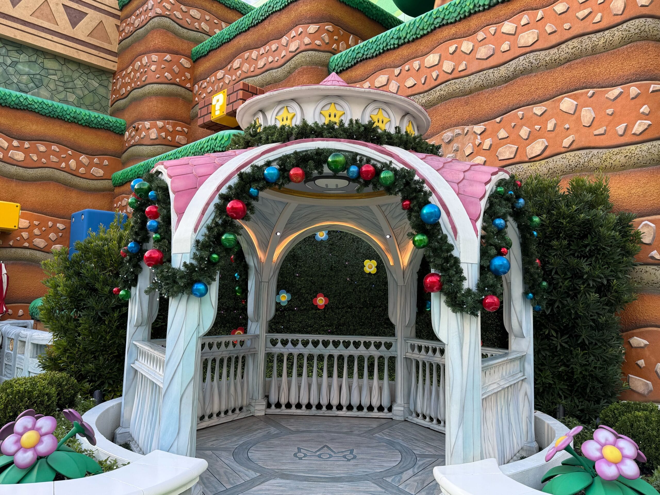 Princess Peach’s gazebo is decorated with big ornaments hanging from garland.