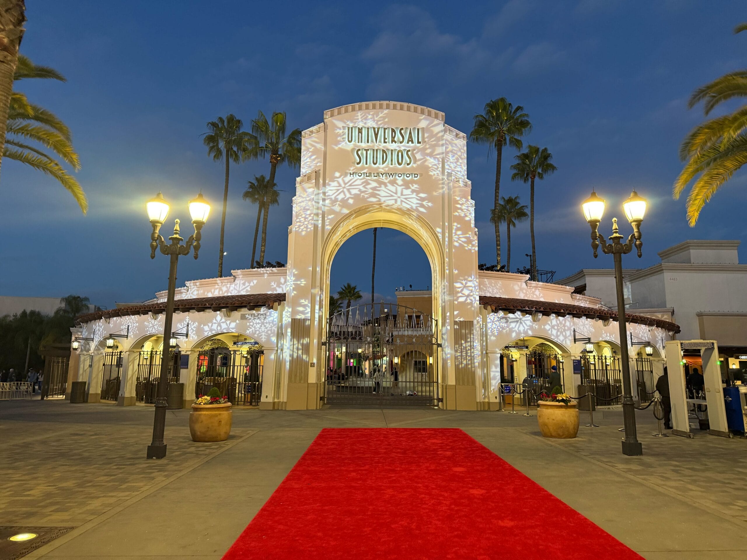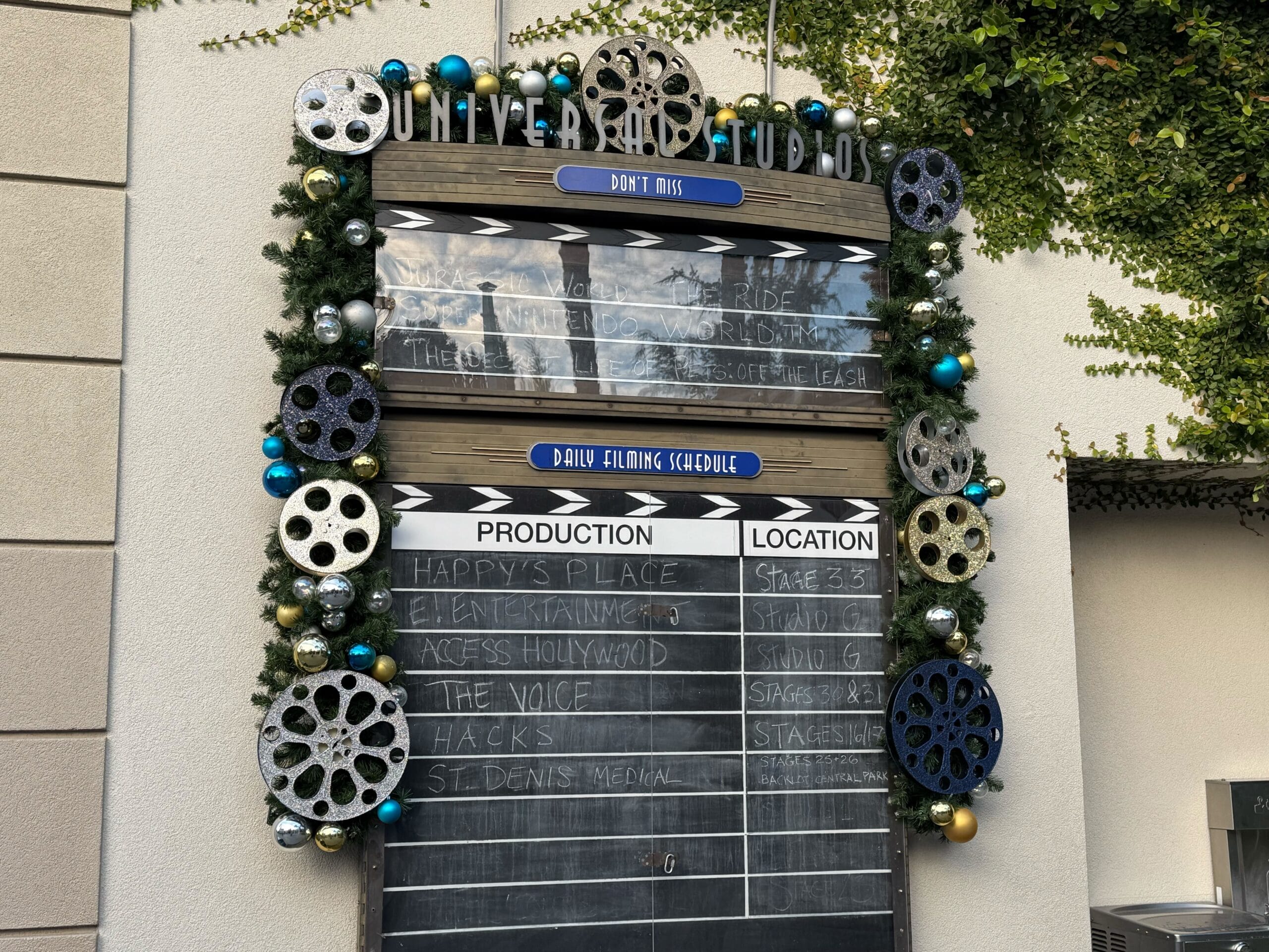 The entrance archway to the World-Famous Studio Tour has garland behind its sign. It’s adorned with blue, silver, and gold ornaments.