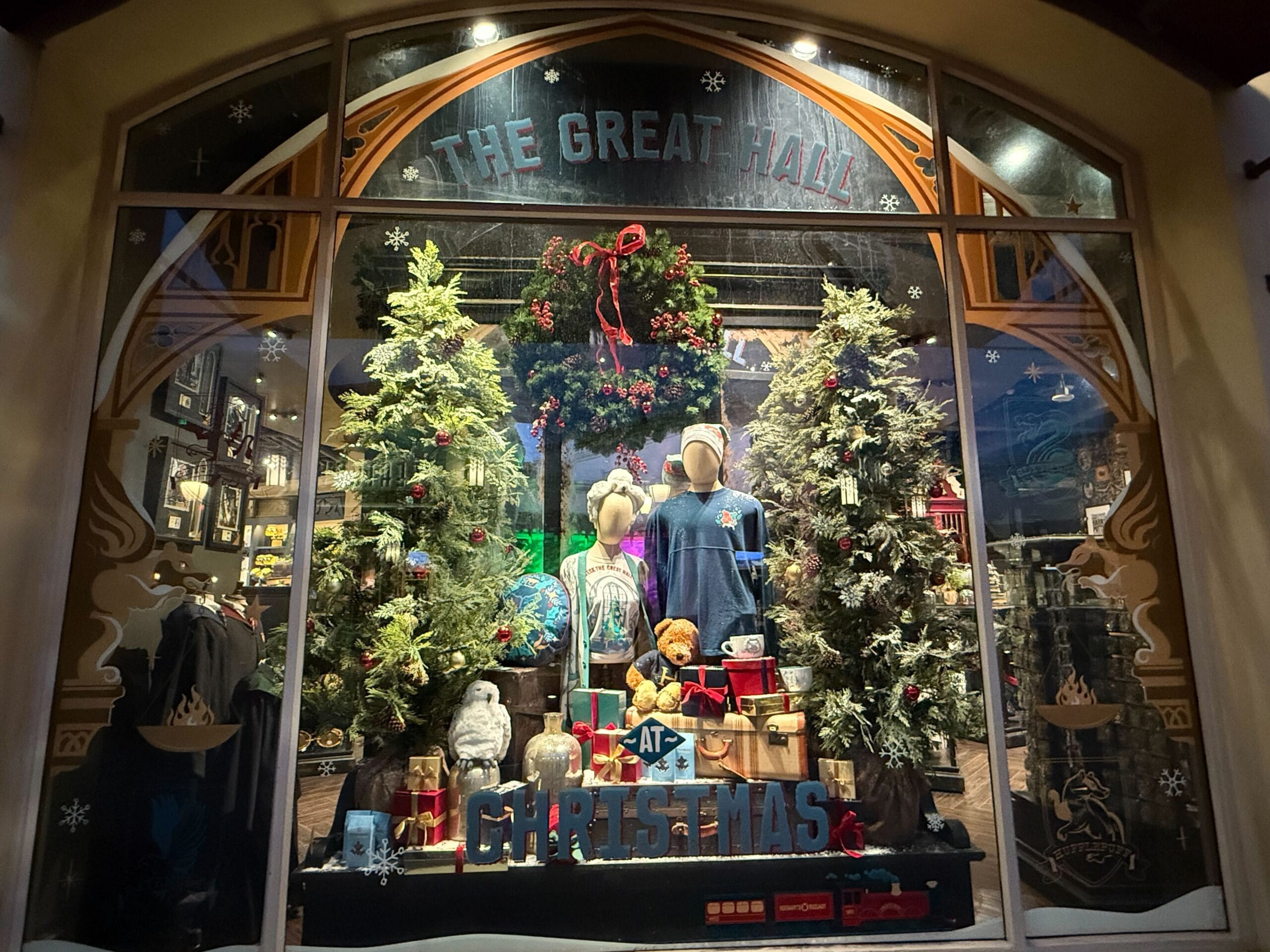 Another Studio Store window features Harry Potter merchandise framed by Christmas trees and a wreath. Decals make the window look like the Great Hall.