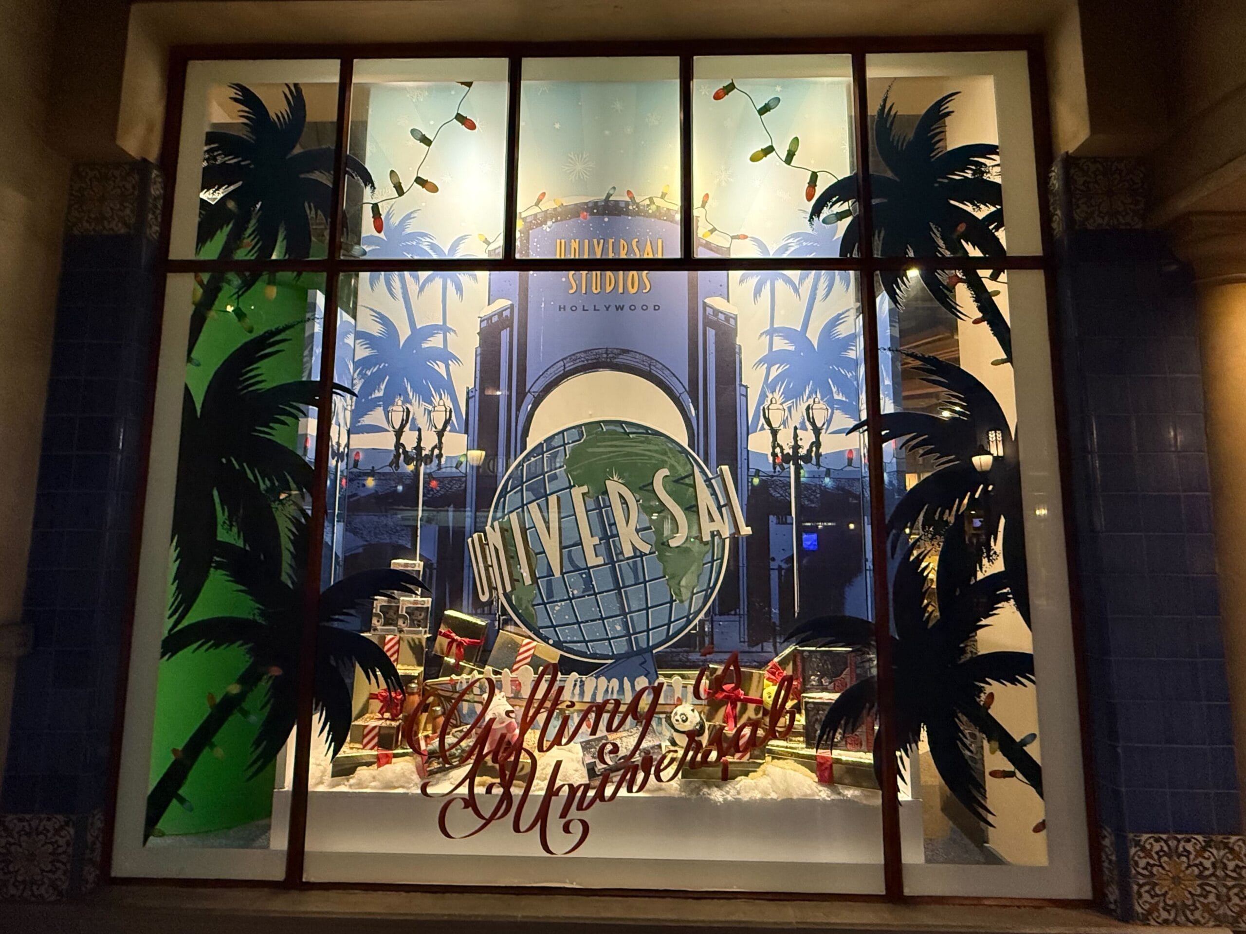 “Gifting is Universal” is on this window with palm tree and string light decals. Christmas presents are inside the window, in front of a Universal Studios Hollywood background.