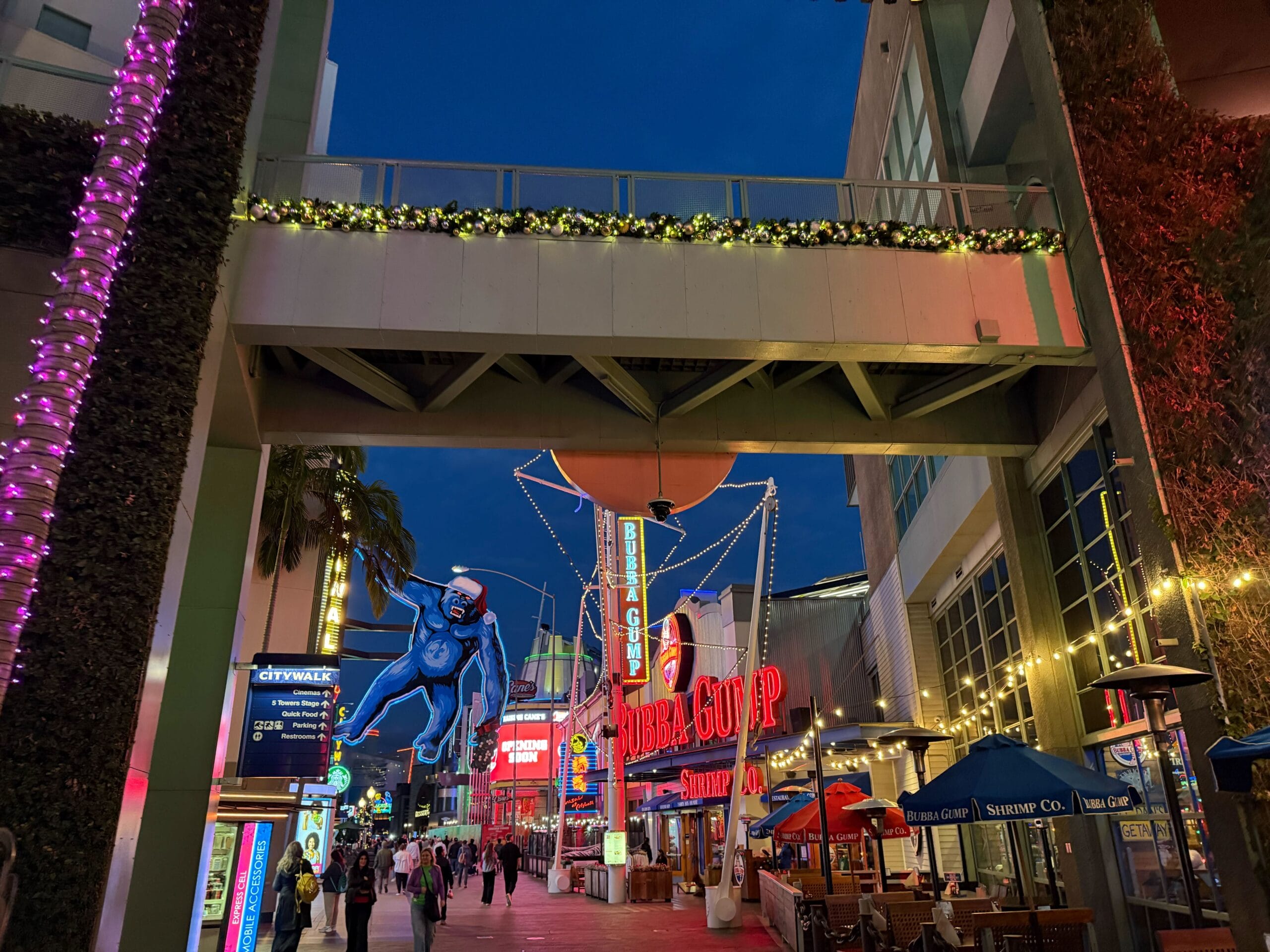 Garland lines the stairs and second-story near the center of CityWalk. The King Kong sign wears a Santa hat.