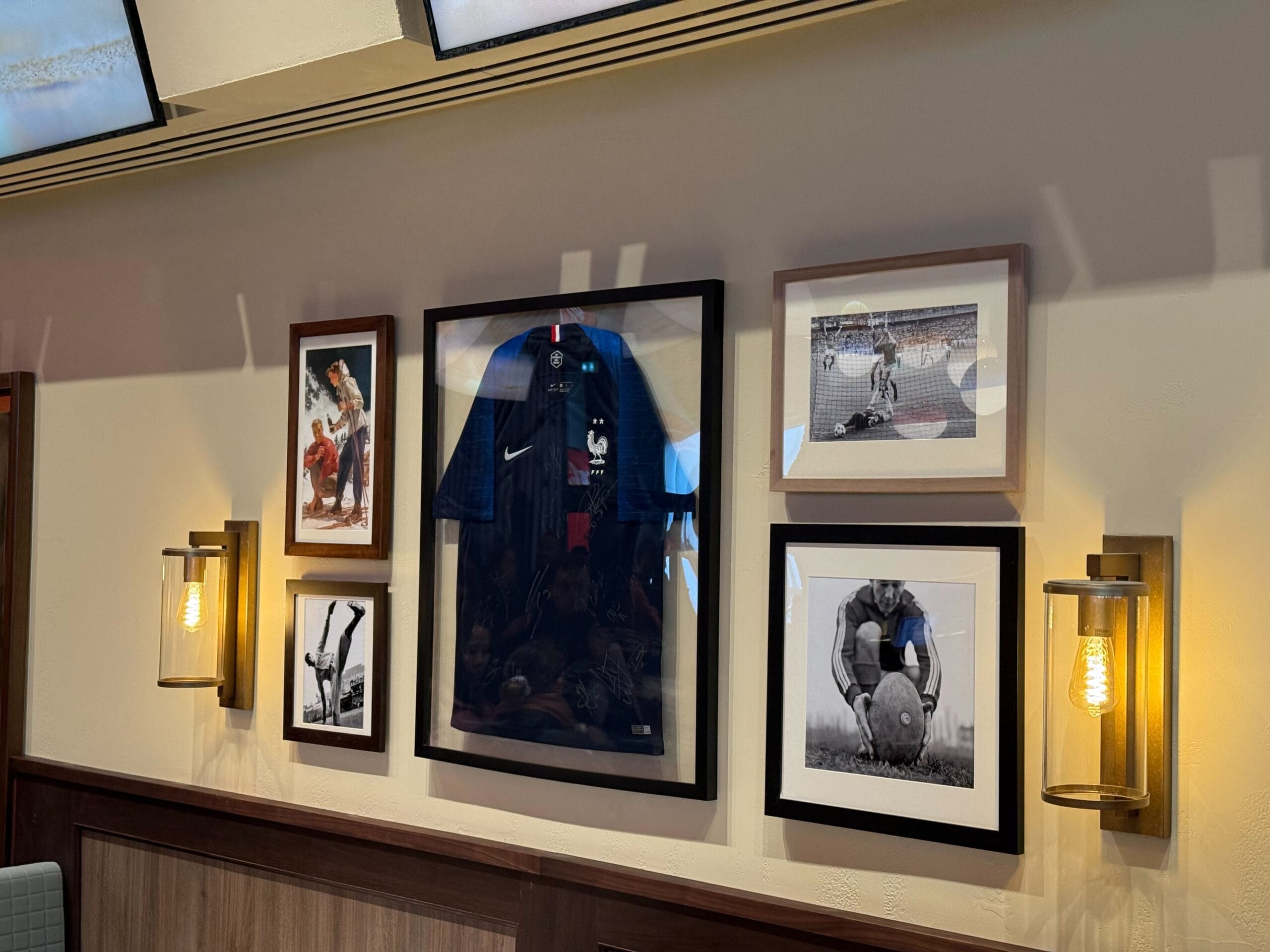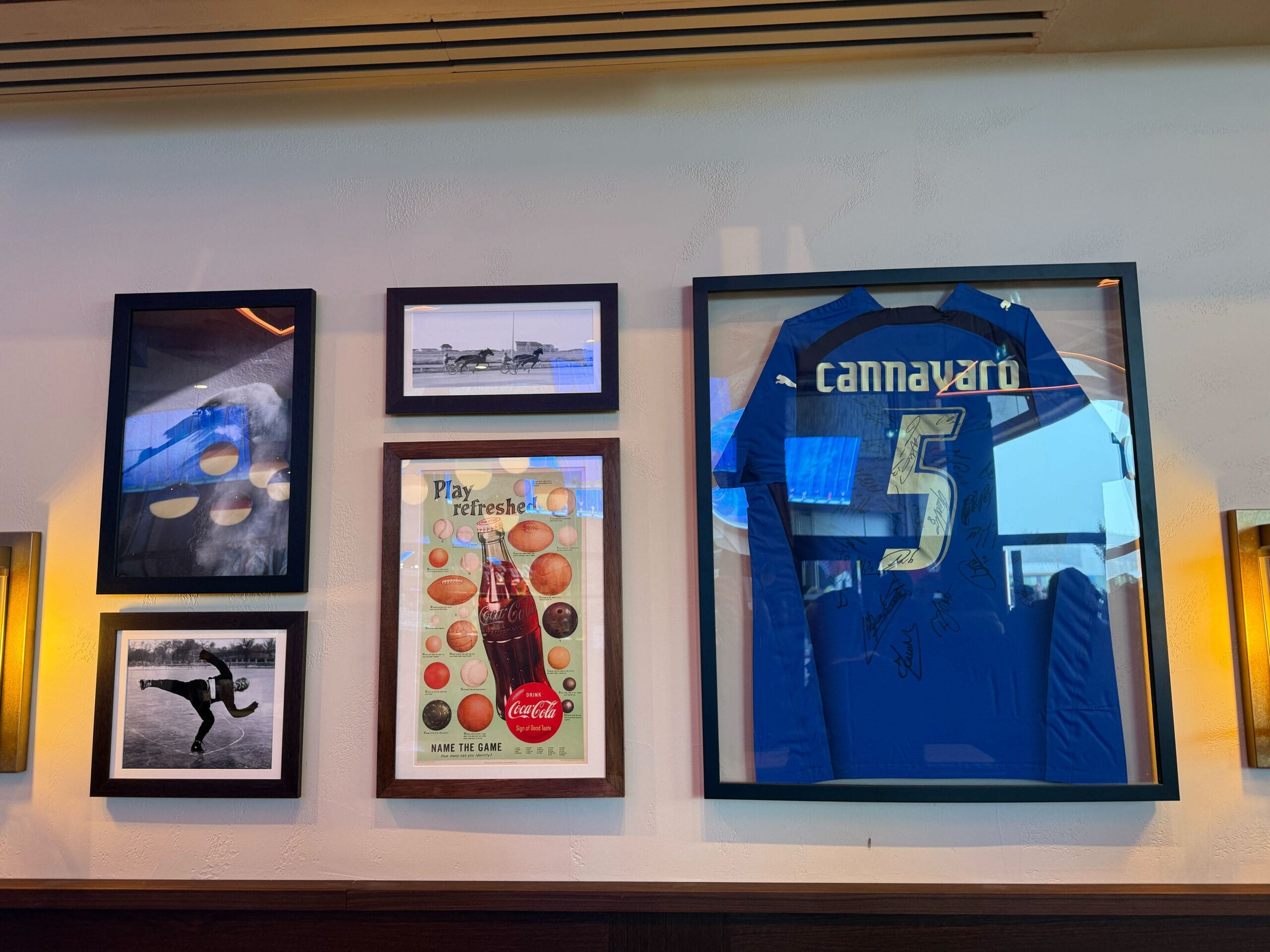 The back room has the same design scheme as the main dining room, with television sets and its own collection of framed memorabilia.