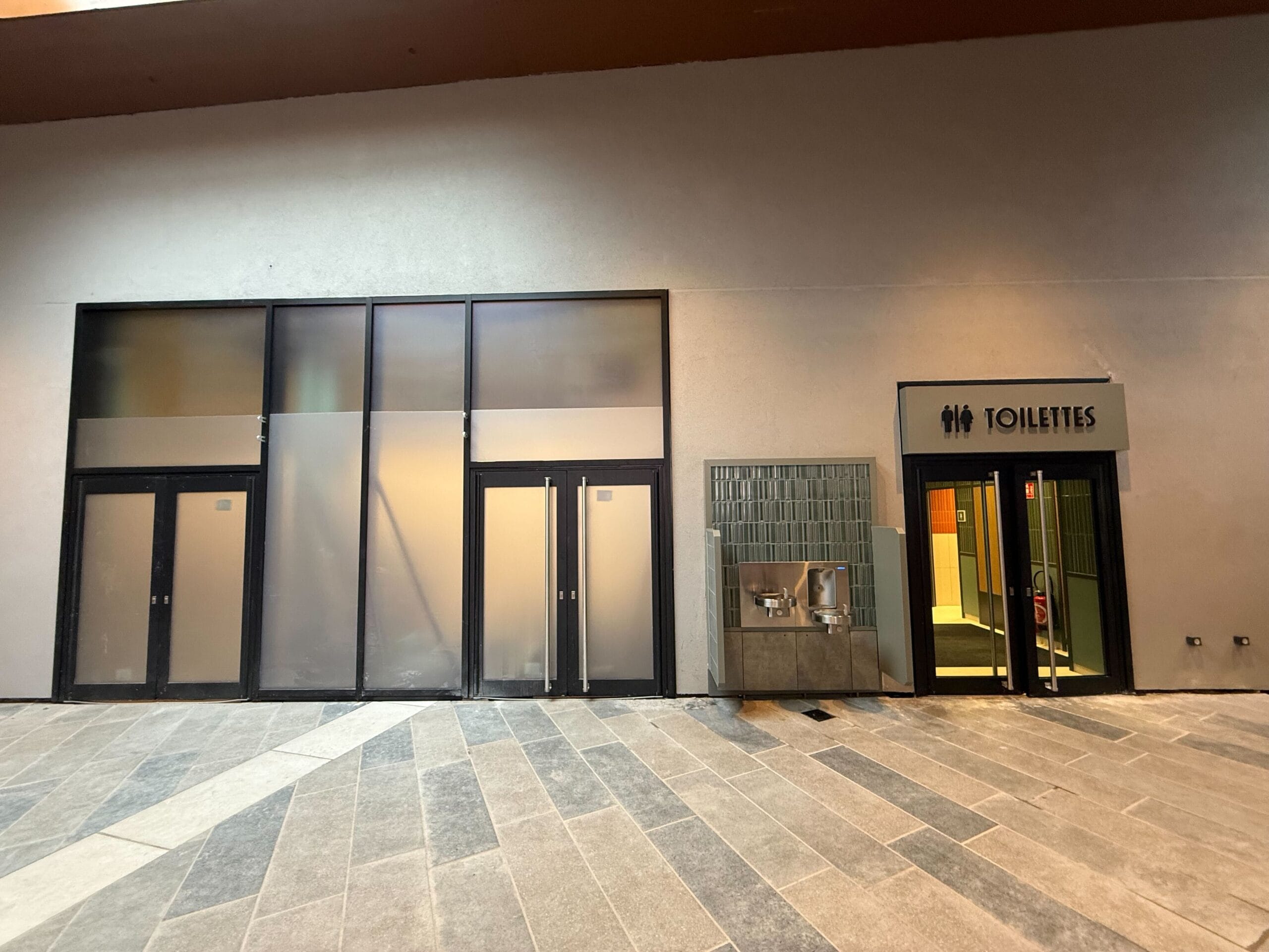 The terrace has both padded booths and counter-height tables. There are also adjacent restrooms.