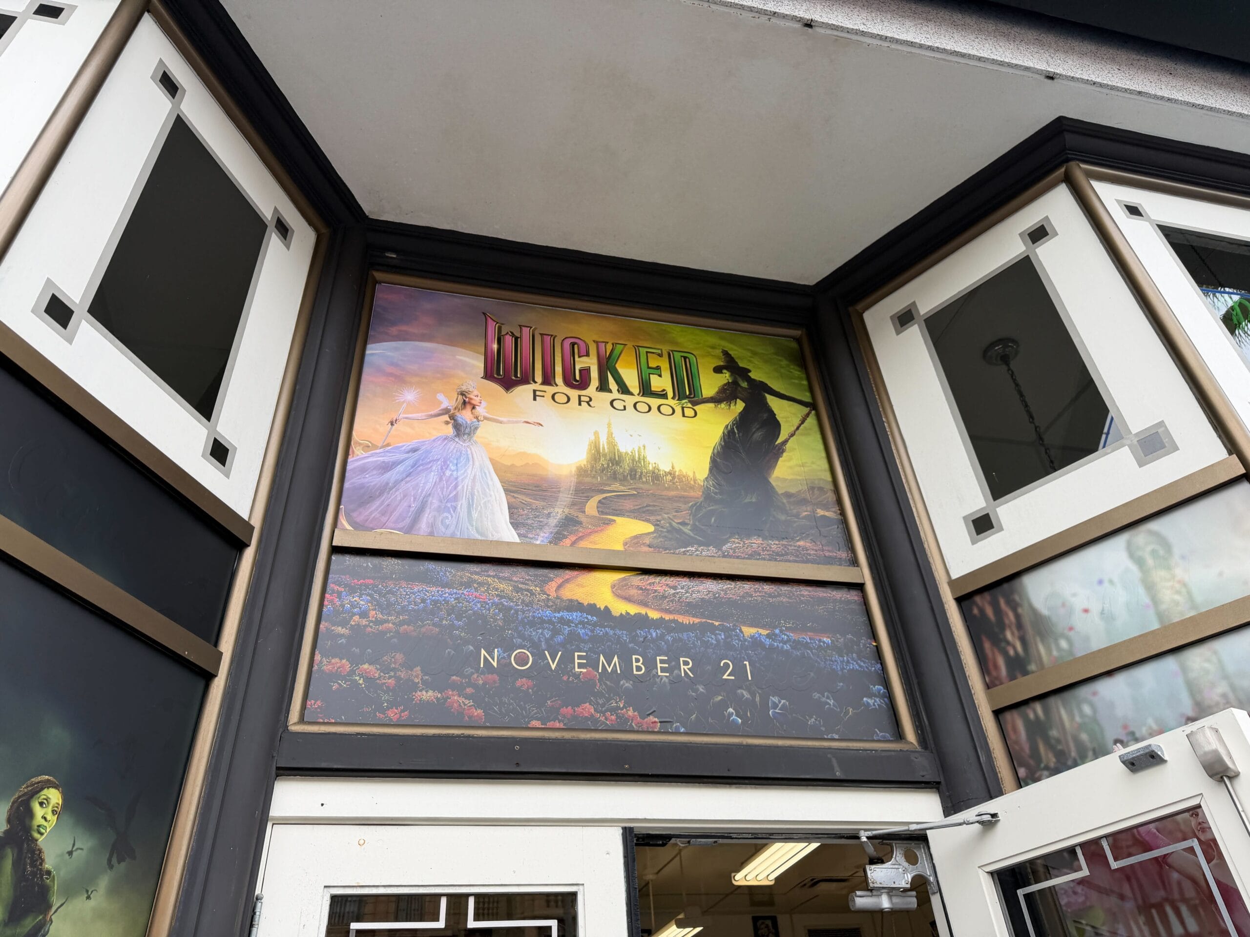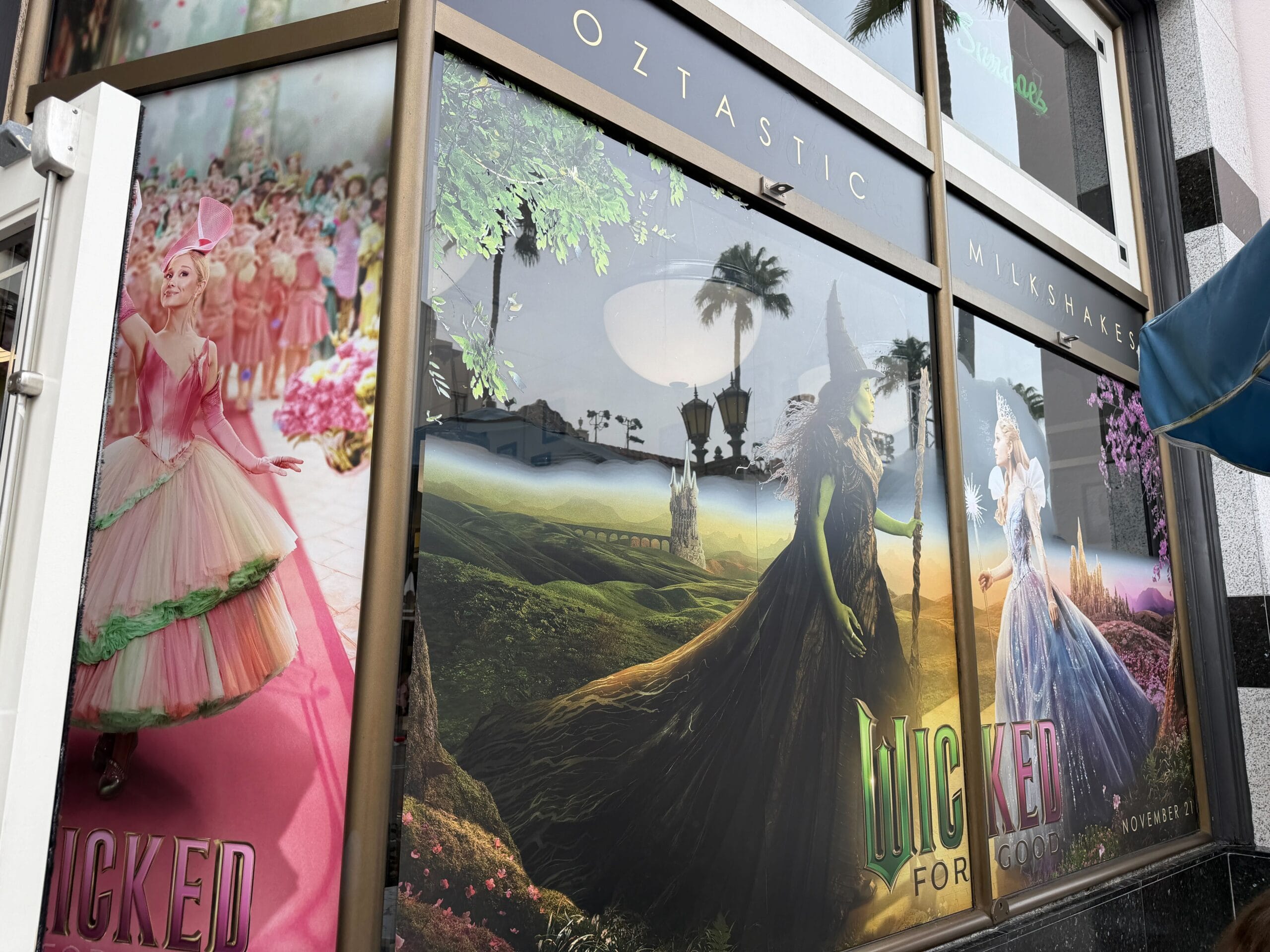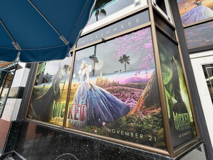The location currently serves a Wizard Elixir Shake and The Yellow Road Shake in celebration of the Upcoming Wicked: For Good film. In addition, window wraps have been added to the windows. Each side of the entrance has a large version of the film’s poster. There are also individual posters of Elphaba and Glinda on either side.