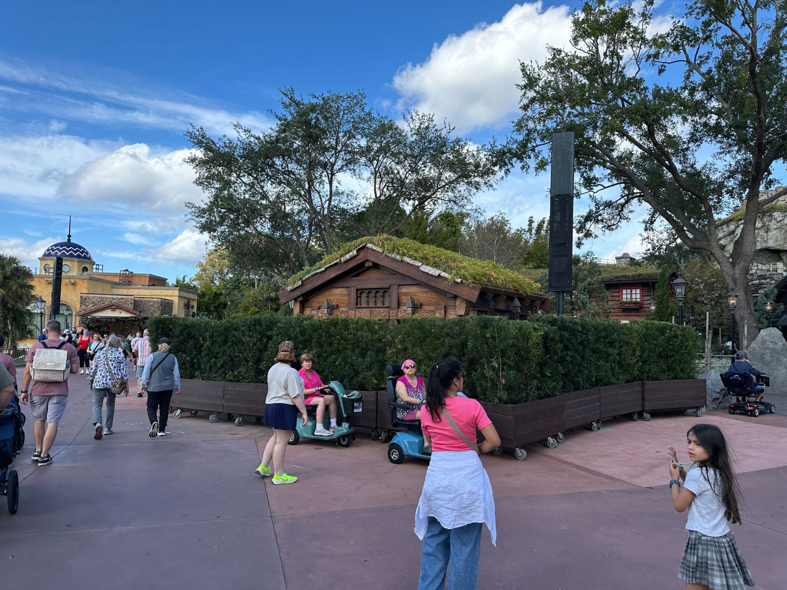 Construction walls are gone now, replaced by rolling planters, giving us a better look at the brand-new building. It doesn’t take up much more space than the old cart but is more themed and provides better cover for Cast Members.