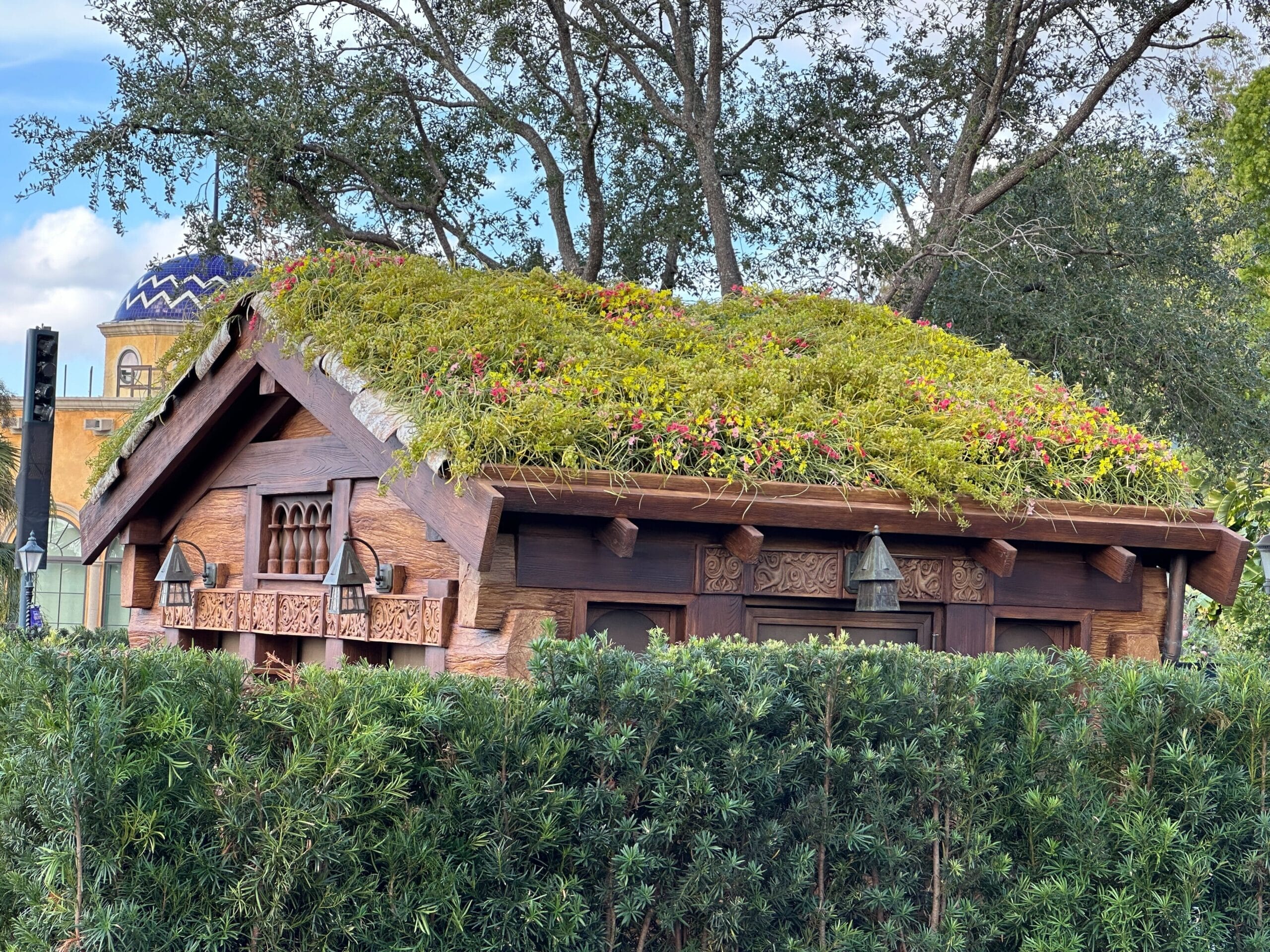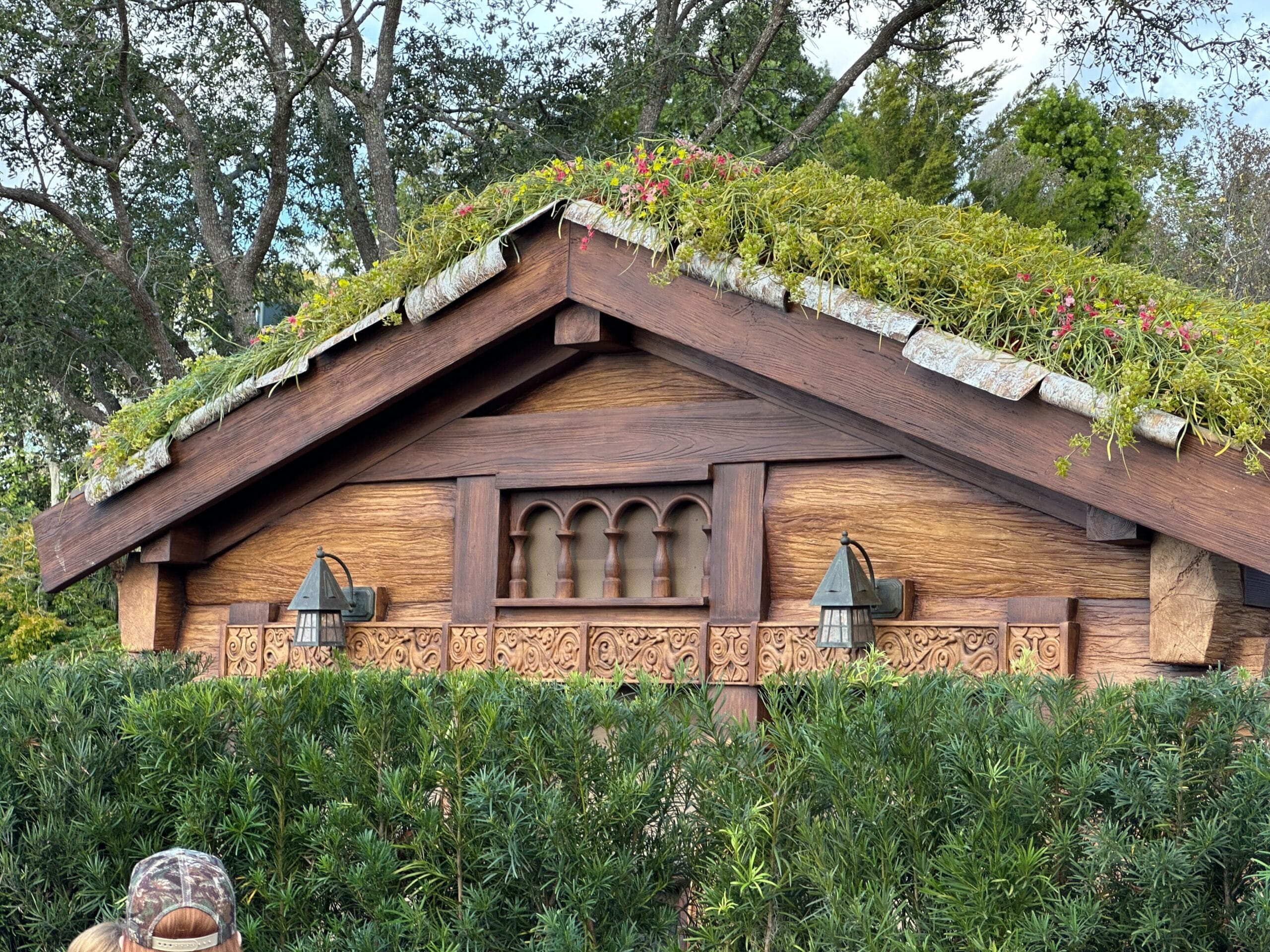 It has a foliage-covered roof like other nearby buildings. The building has a wood finish. There are two windows on the front for ordering a pick-up, with lanterns hanging above them. The window frames feature Scandinavian-style carvings.