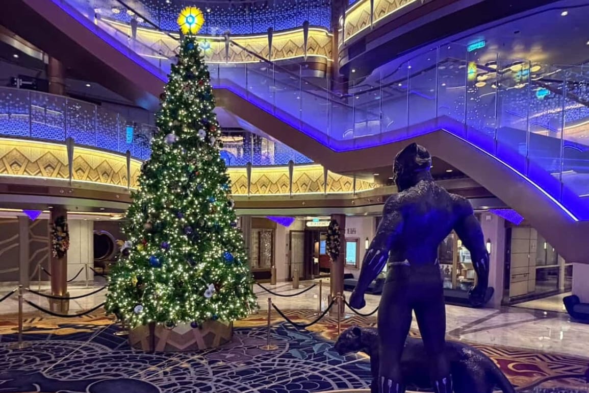 The Disney Cruise Line Instagram posted the shots of the tree next to the T’Challa statue in the Disney Destiny’s Grand Hall: