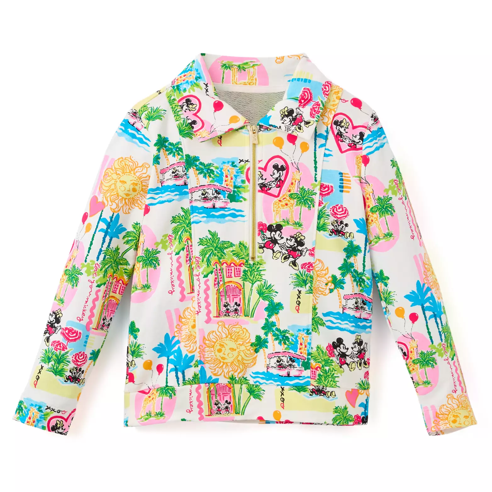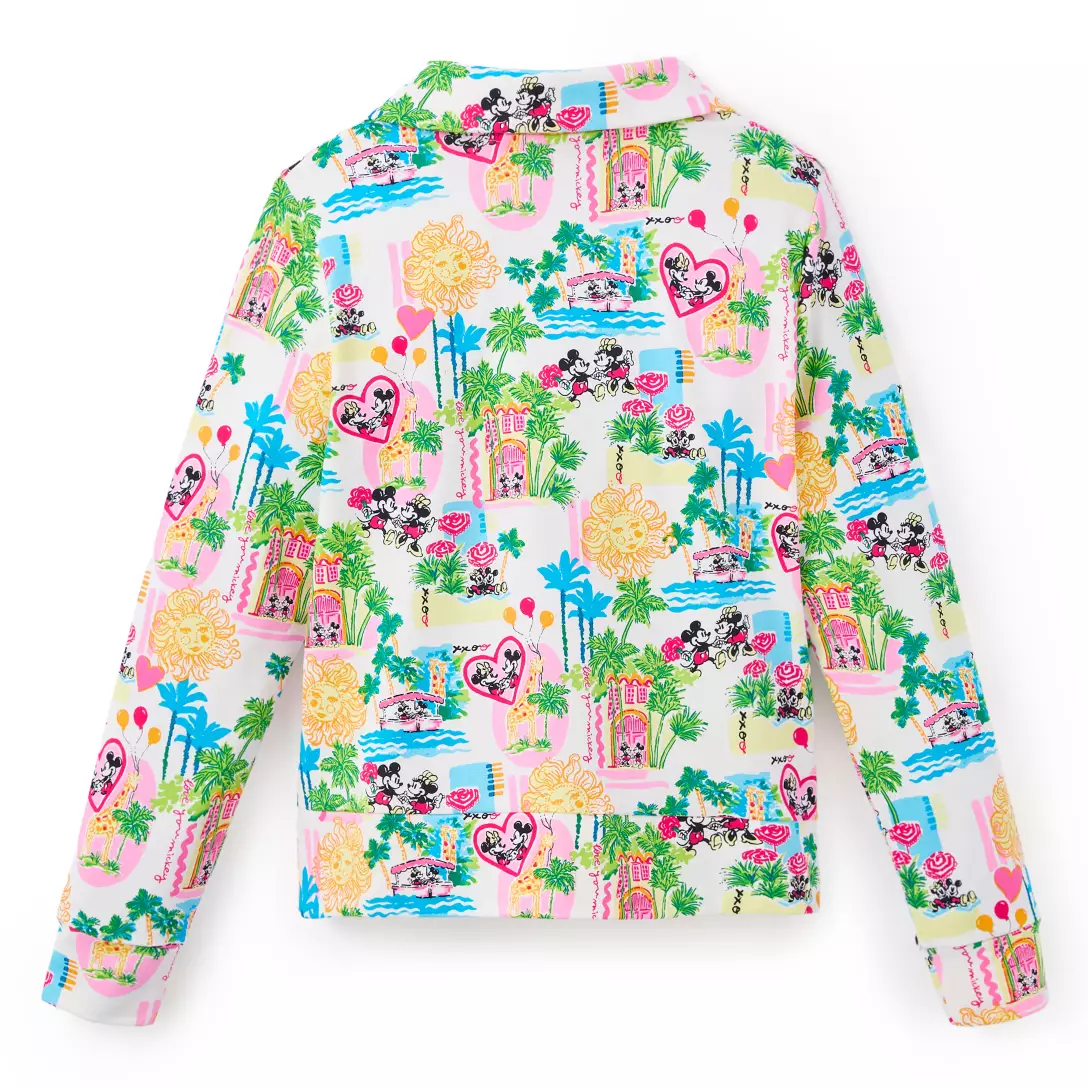 Mickey and Minnie take a romantic jungle cruise on this pullover from Lilly Pulitzer. The colorful allover pattern features the couple enjoying a boat trip where they encounter giraffes. It has a half-zip front and is made from a stretchy French Terry material.
