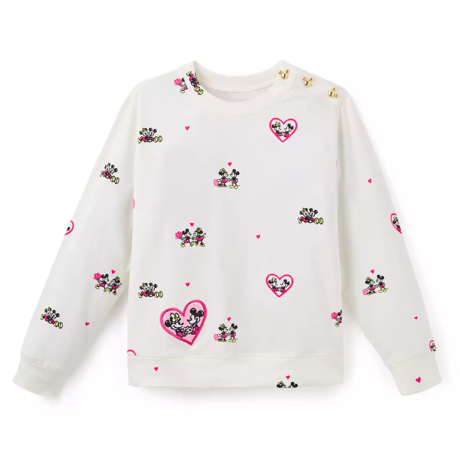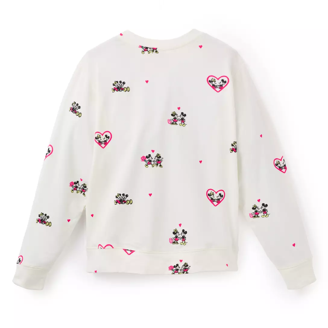 Sweethearts Mickey and Minnie share some touching moments in the allover print on this Ballad Pullover from Lilly Pulitzer. Goldtone Mickey icon buttons on the shoulder add a novel feature while an embroidered heart with the happy couple adds to the romantic theme of this stylish sweatshirt.