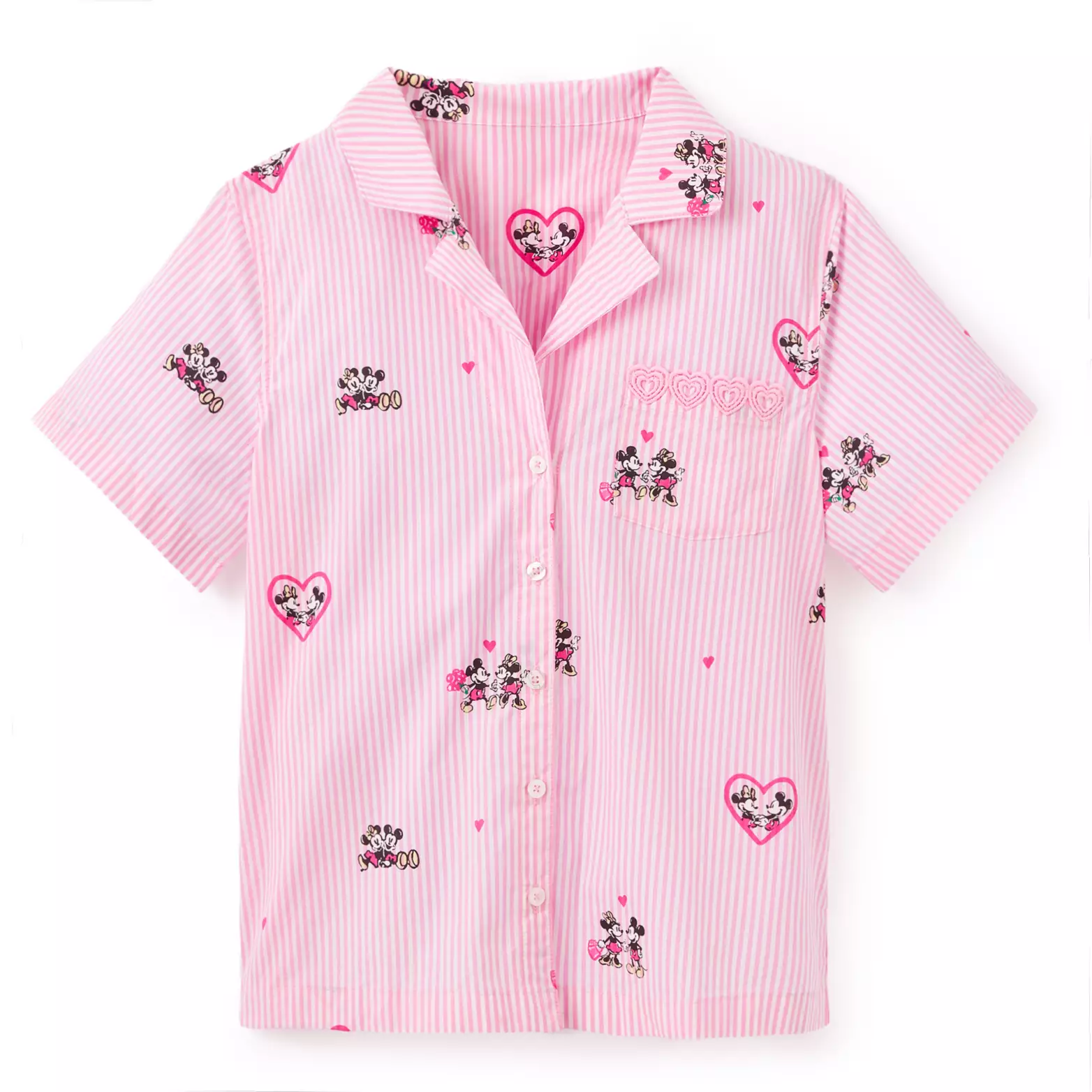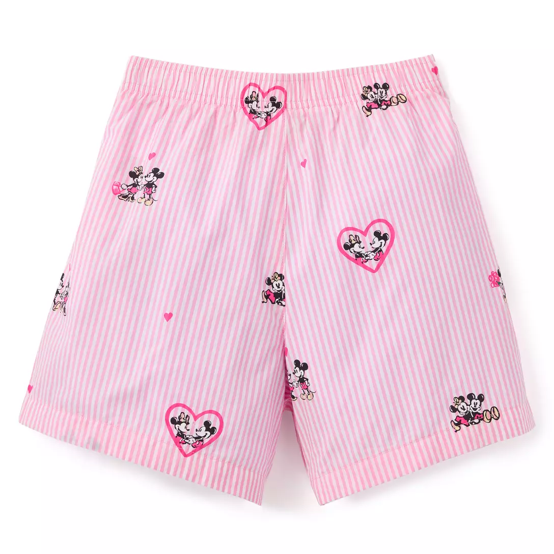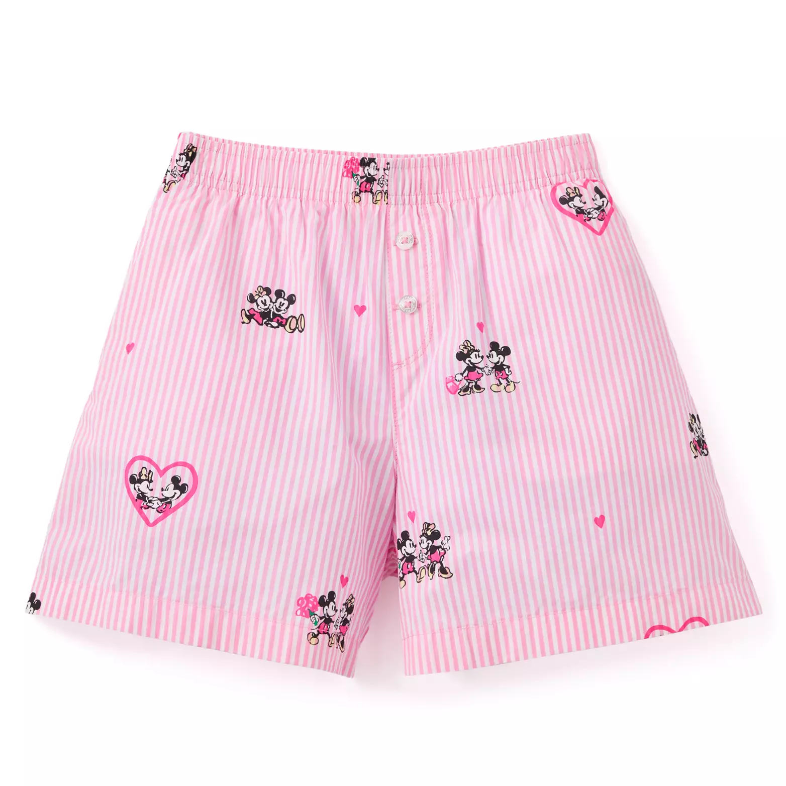 The allover yarn-dye striped design includes an elastic waistband, button faux fly, and front slant pockets. Mickey and Minnie are featured in various poses, including inside hearts.