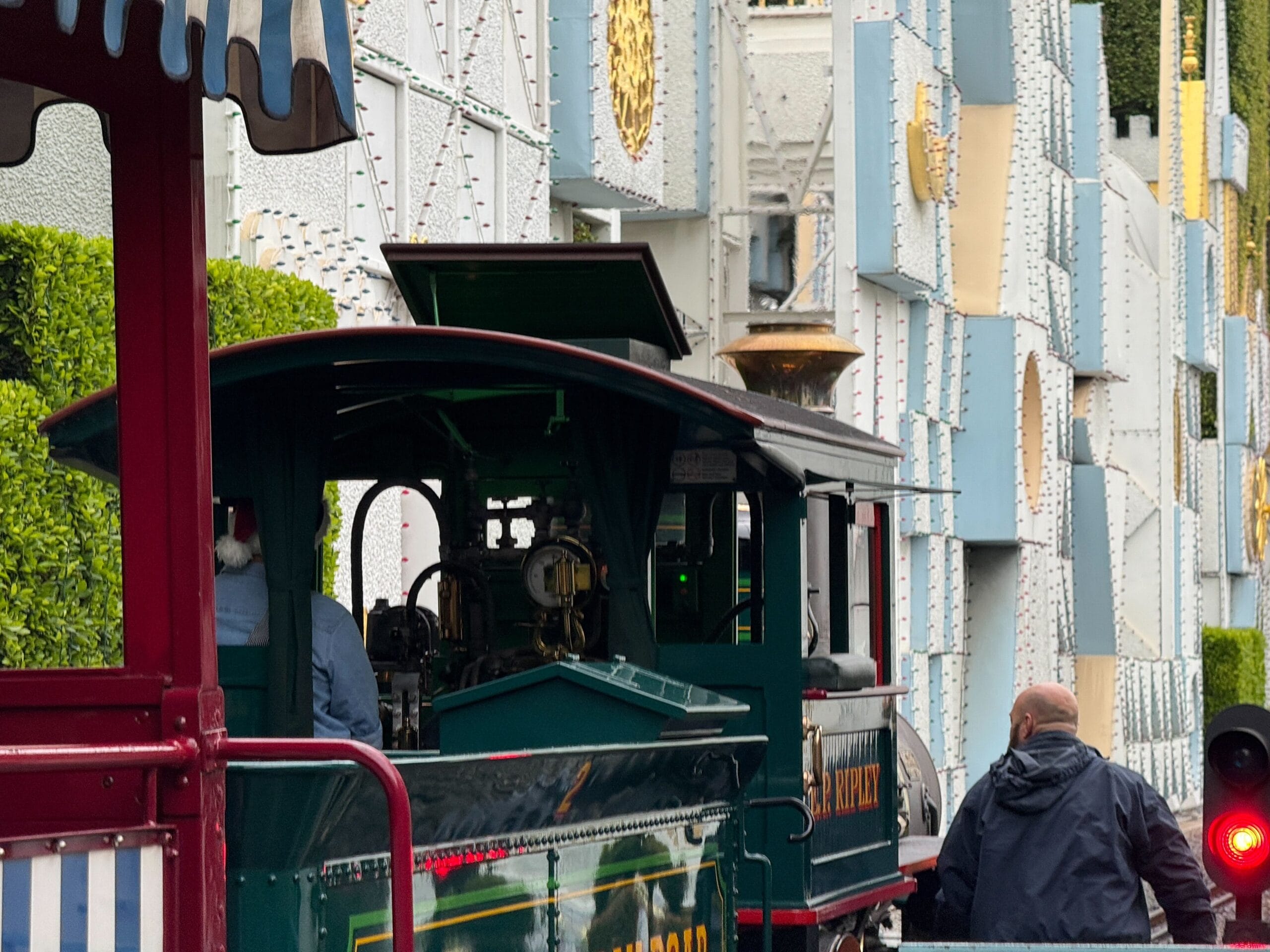 The last engine running this Tuesday was #3, the Fred Gurley, with the Holiday Red (formerly Retlaw 2) train set. Named after the Santa Fe Railway president when Disneyland opened in 1955, this is actually the oldest of the Disneyland Railroad engines, having been constructed in 1894. It entered service at Disneyland in 1958.