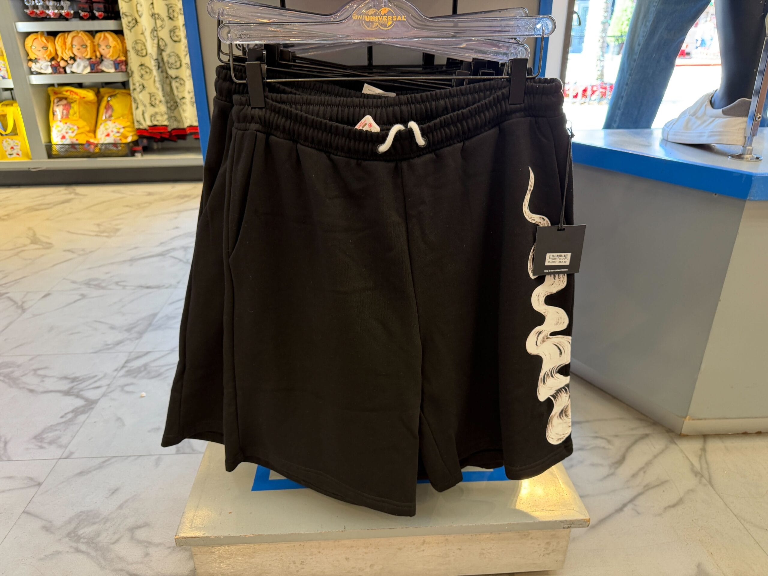 Rounding out the Bride of Frankenstein apparel, these black shorts feature the same streak of iconic white hair along the left leg.
