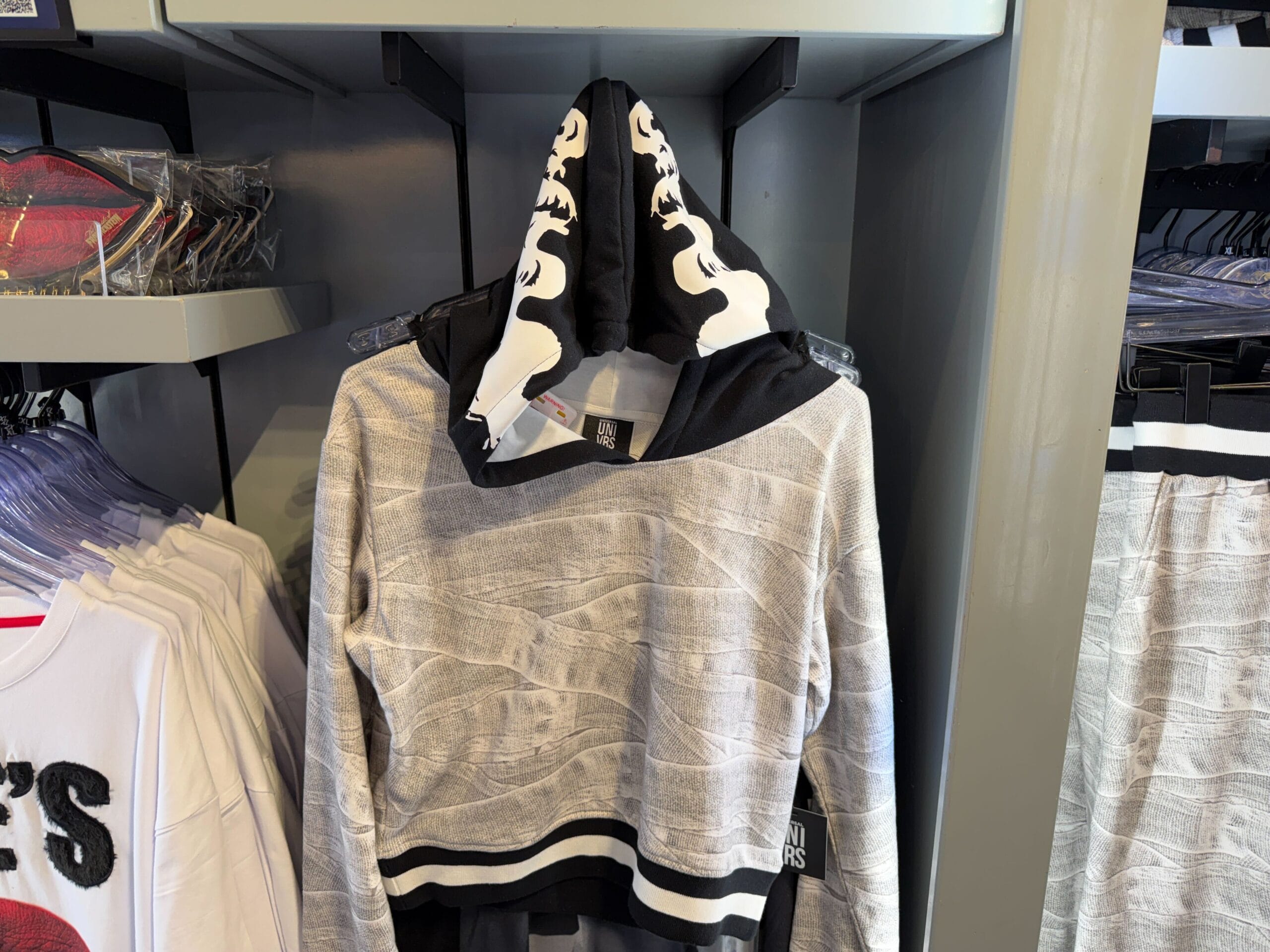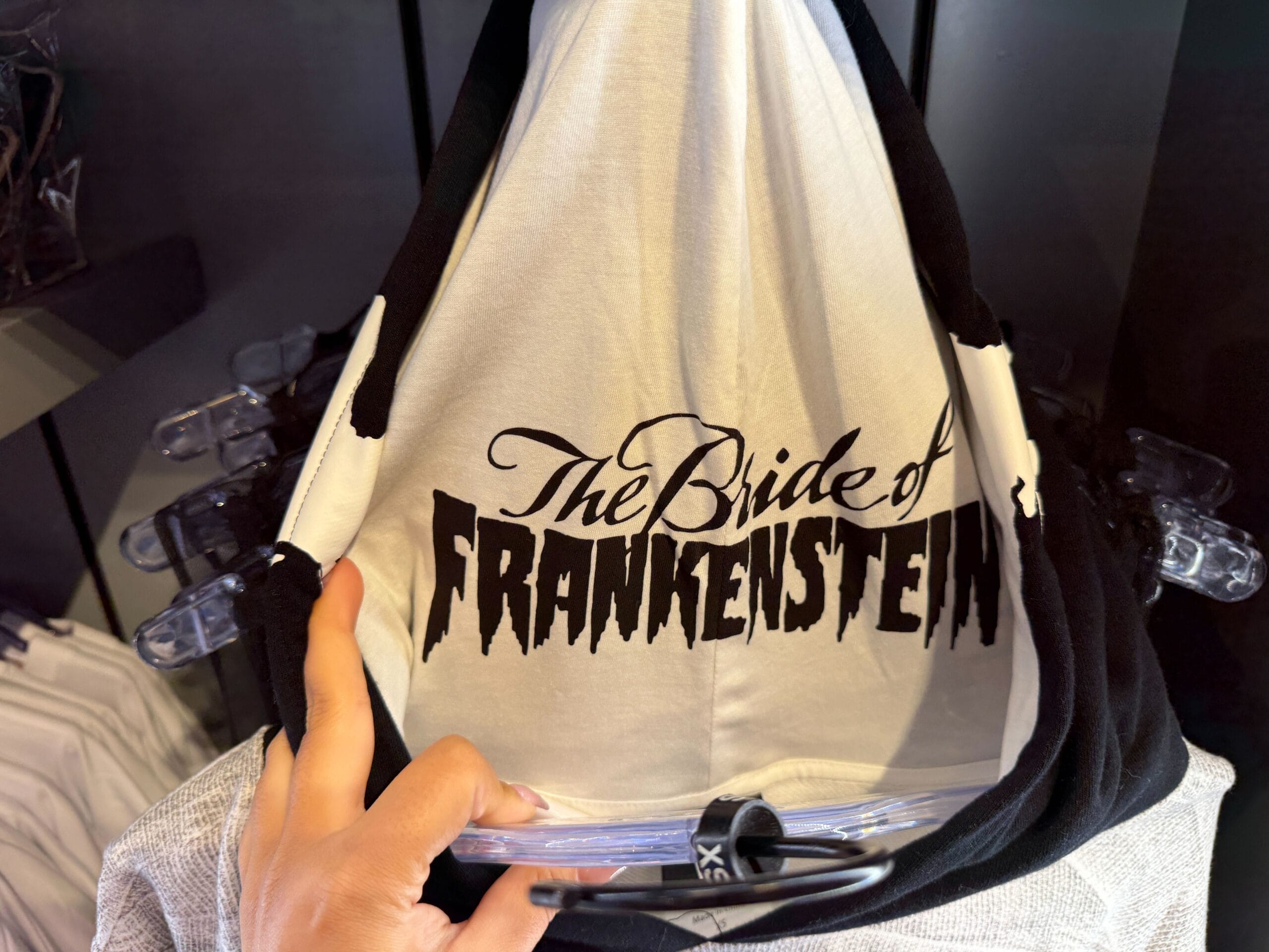 The inside of the hoodie features white fabric emblazoned with “The Bride of Frankenstein”, while the black exterior features a graphic mimicking the wavy streak of white in the Bride’s hair.