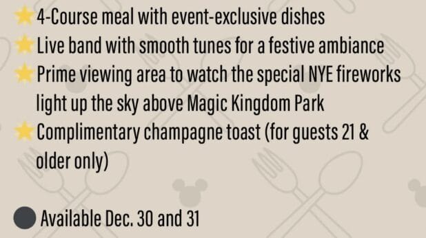 - Fireworks: From a prime viewing area, watch the special New Year’s Eve fireworks light up the sky above Magic Kingdom park. Fireworks viewing will take place at the end of each seating. Fireworks may be cancelled due to inclement weather and are subject to change.