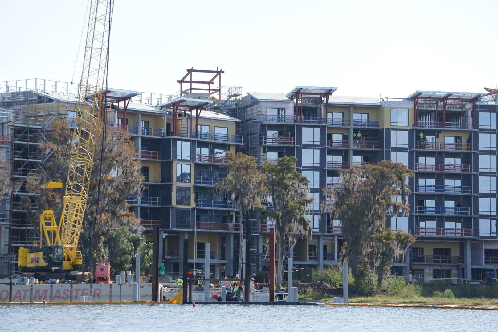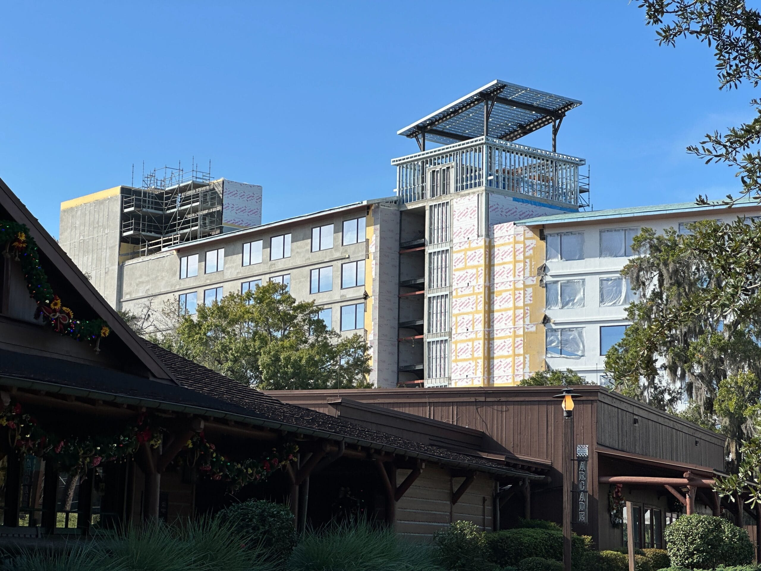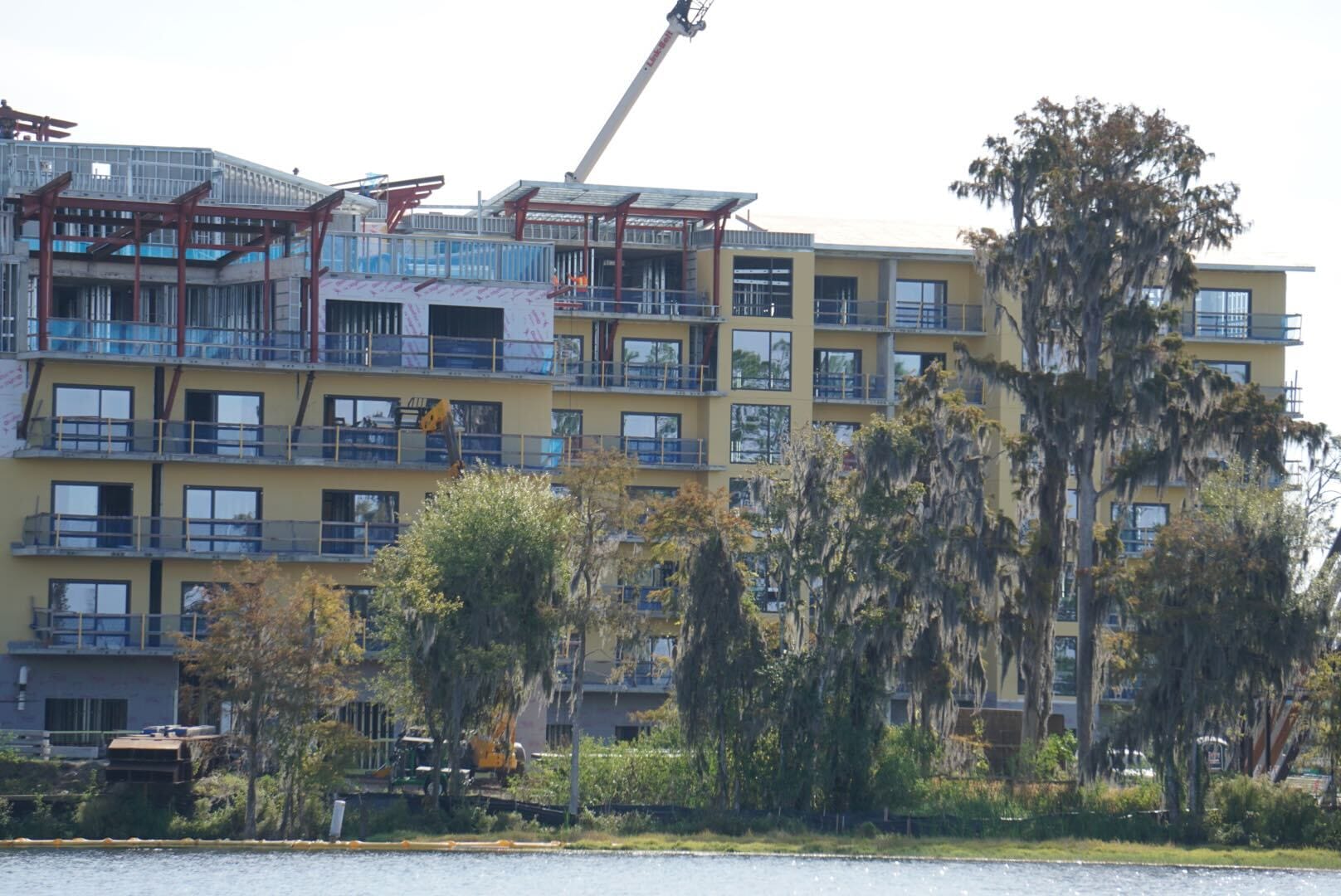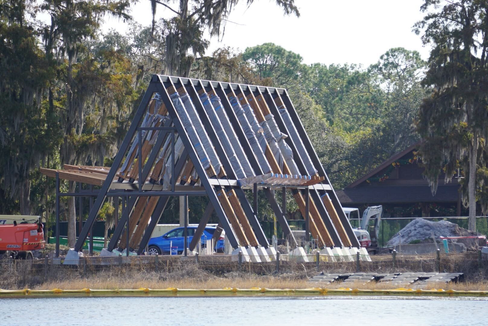 Disney Lakeshore Lodge, a new Disney Vacation Club resort under construction at Walt Disney World, has gained more steel overhangs, roofing, and sheathing.