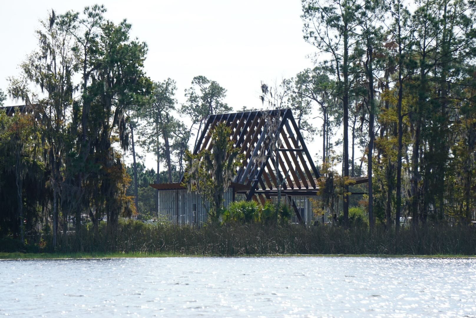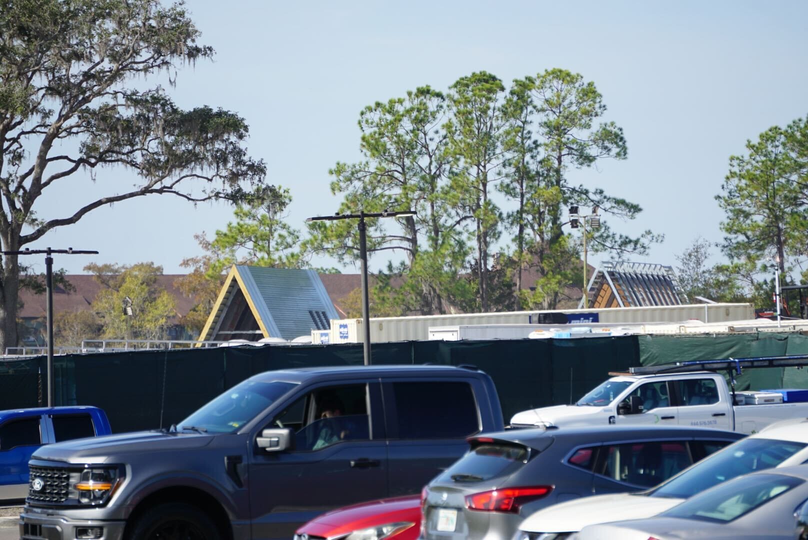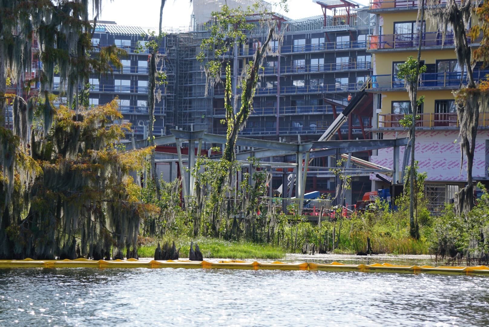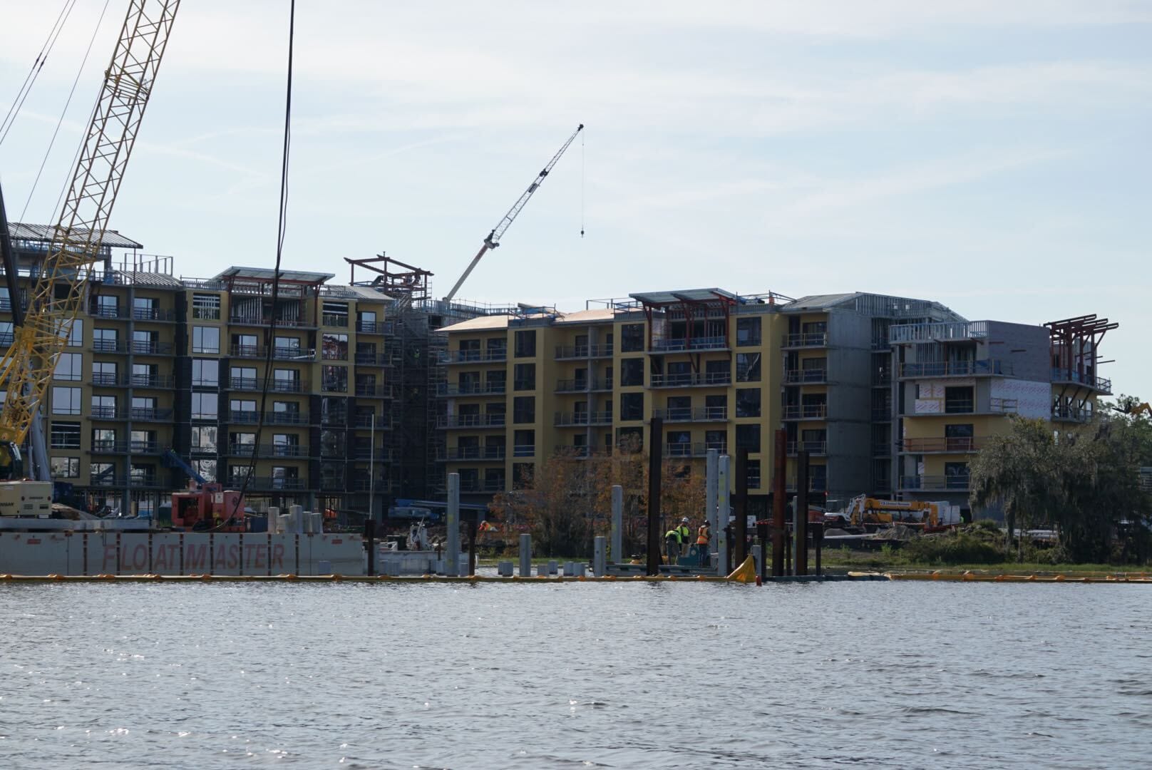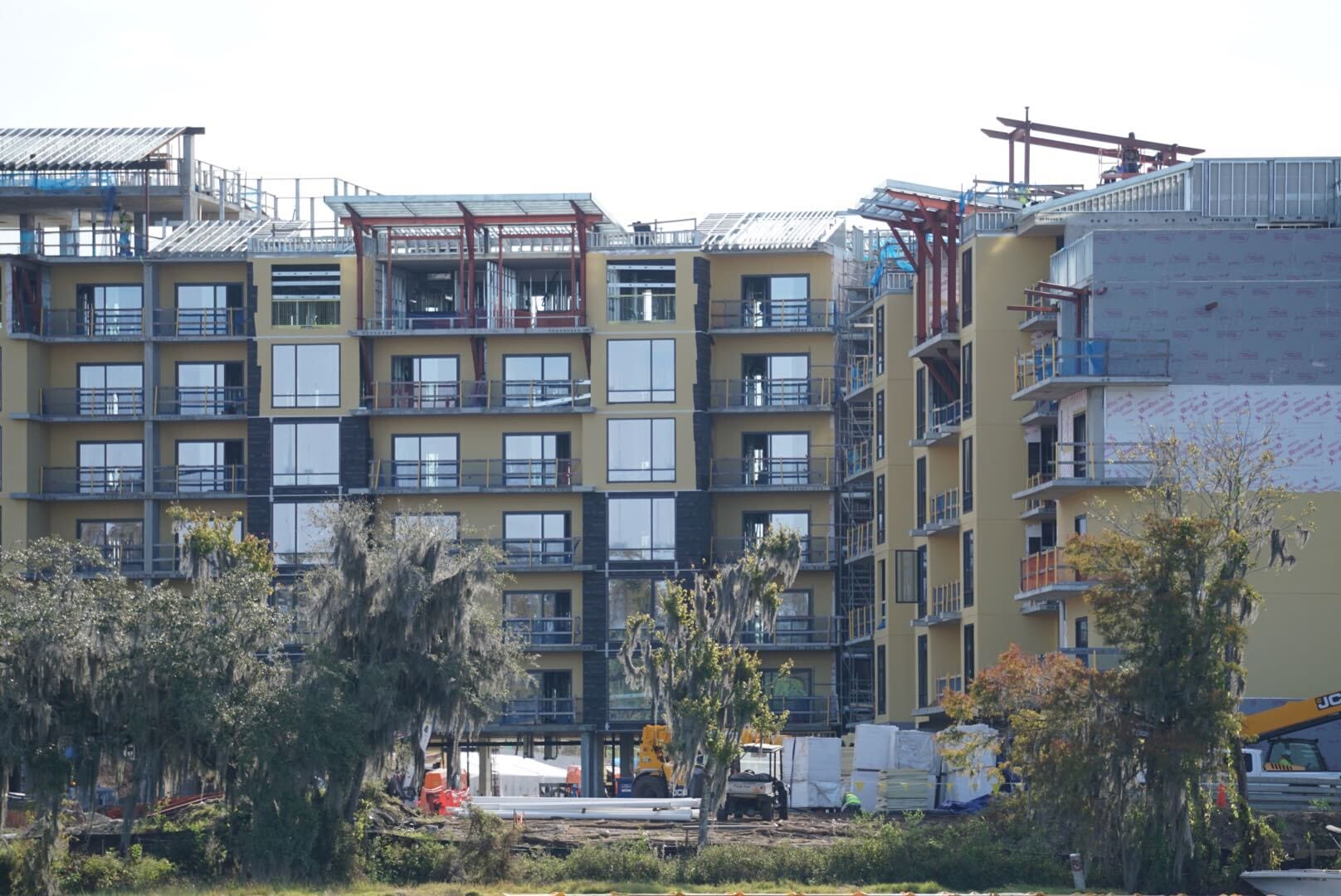Disney Lakeshore Lodge, a new Disney Vacation Club resort under construction at Walt Disney World, has gained more steel overhangs, roofing, and sheathing.