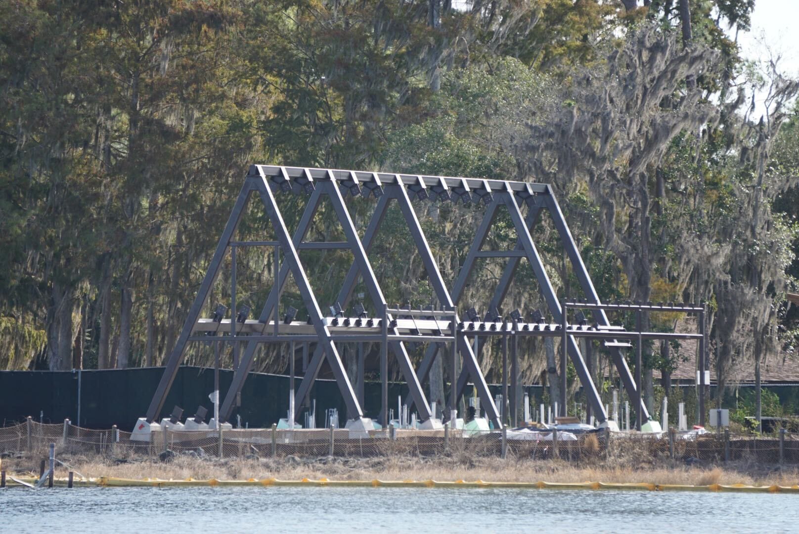 The supports in the water are for a future dock, also clearly visible in bioreconstruct’s aerial photos. Though the supports have been installed, it seems further dock construction has paused while crew members work on the rest of the resort.