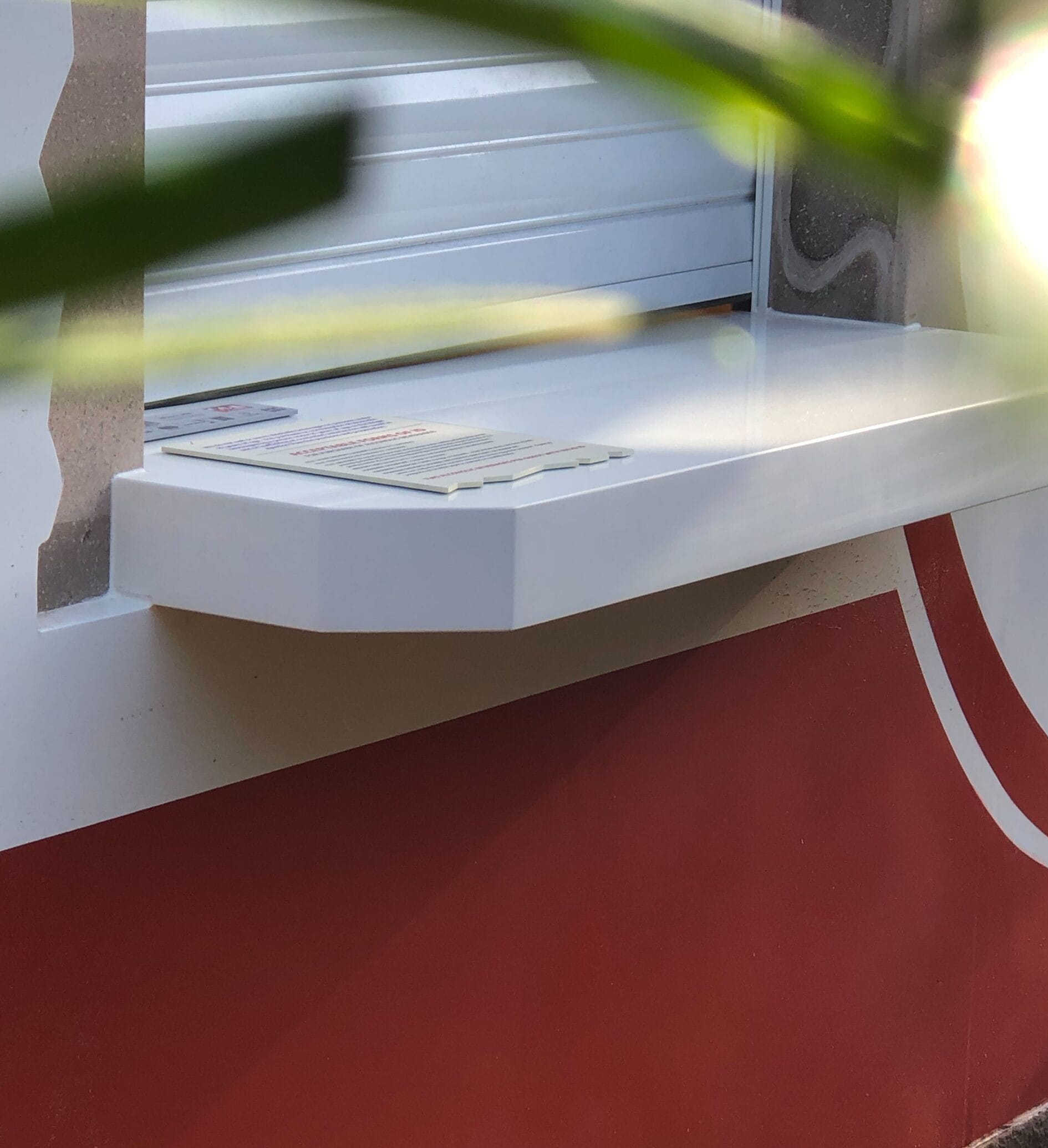 Two (currently) blank signs have been added above two windows of the kiosk. They appear to be designed as pieces of scrap paper with a roughly torn edge at the bottom.