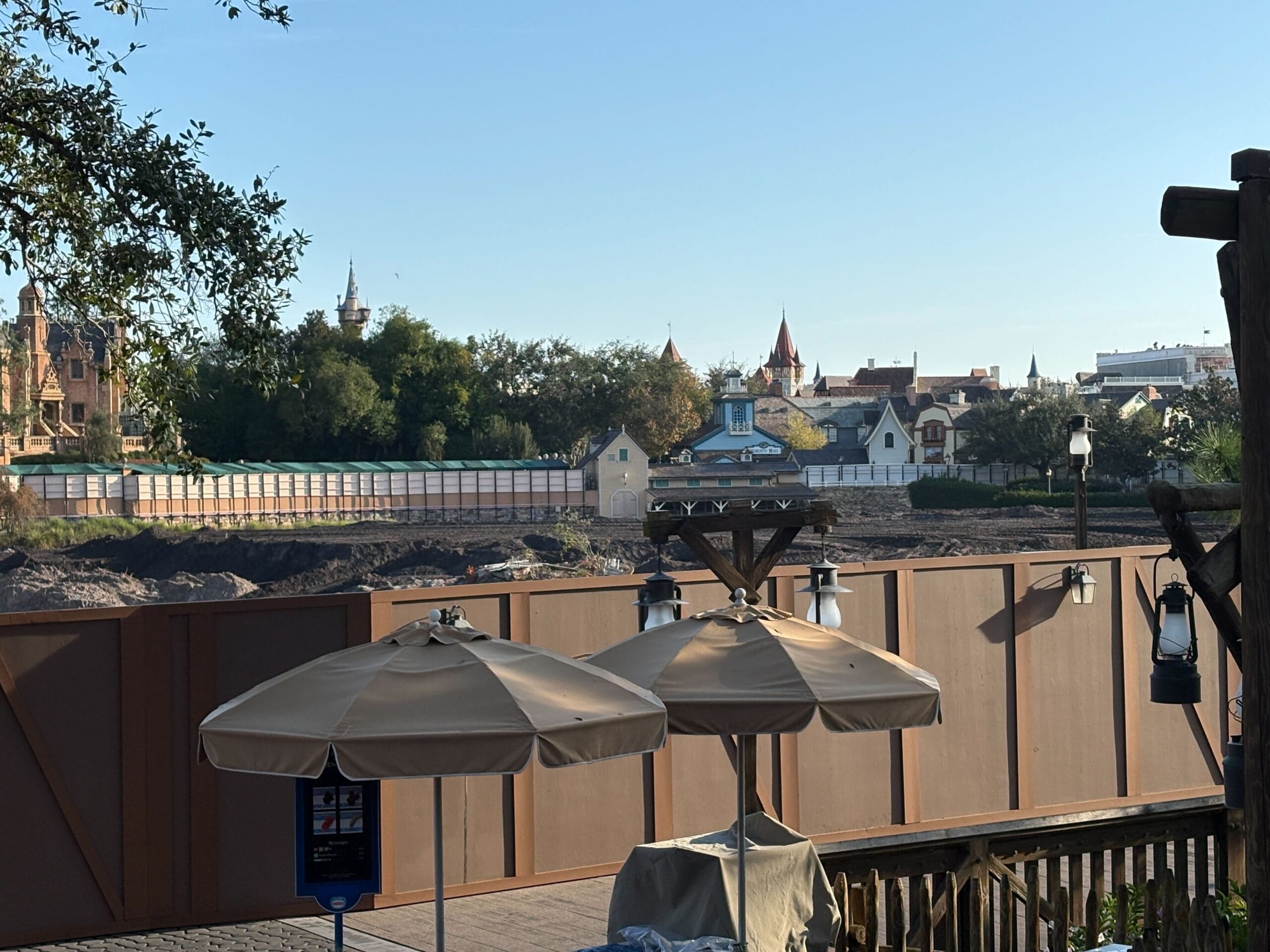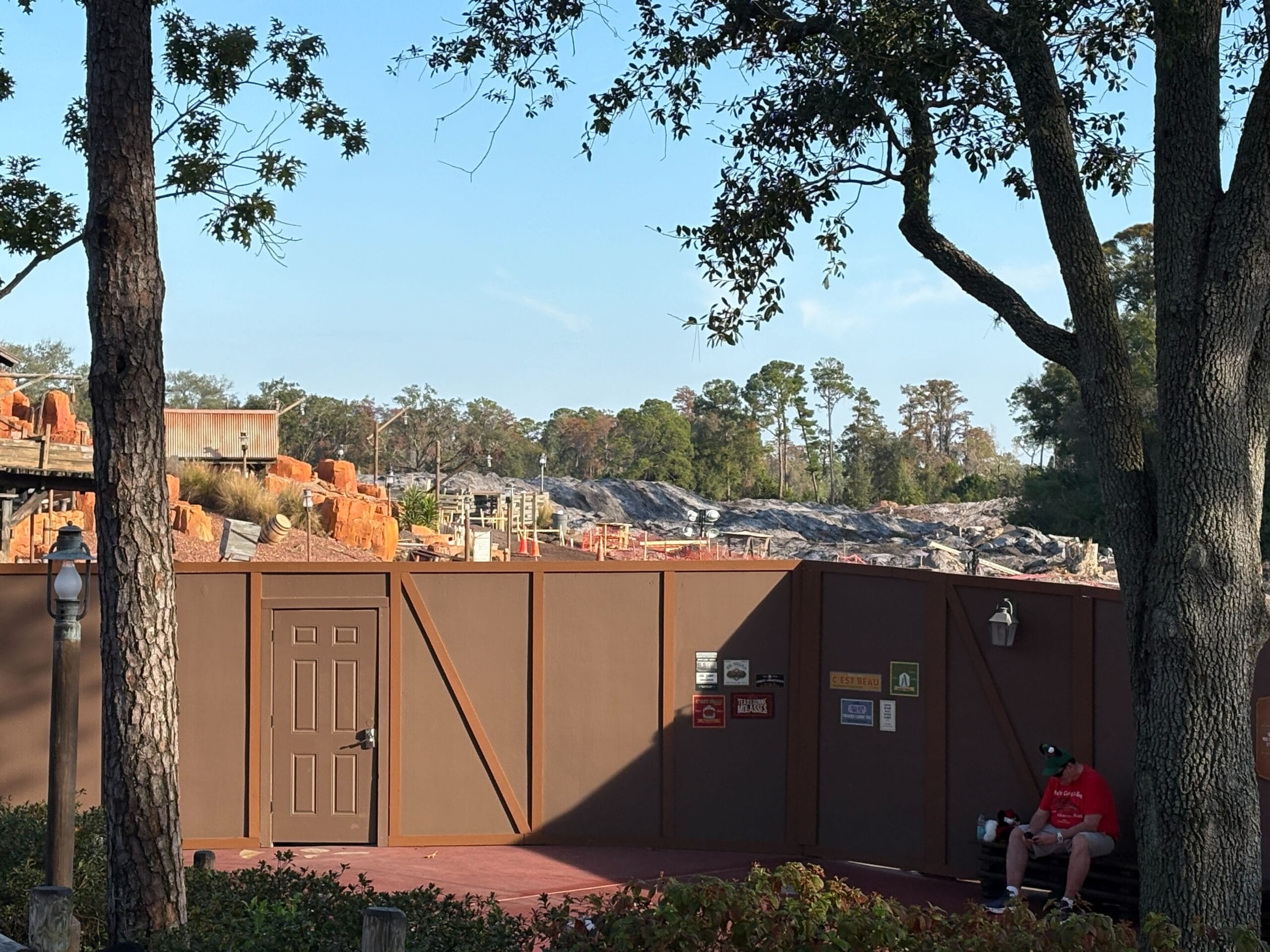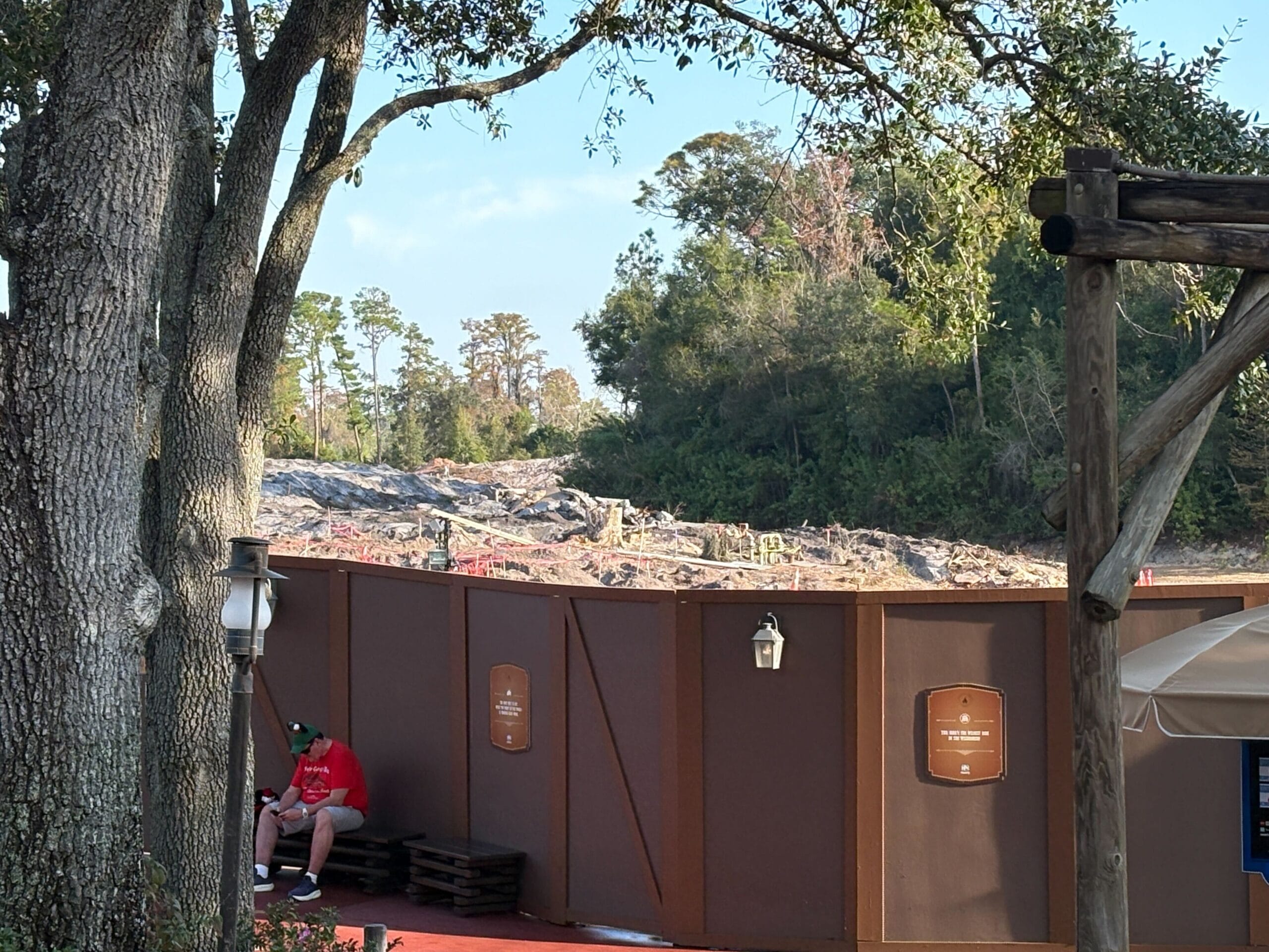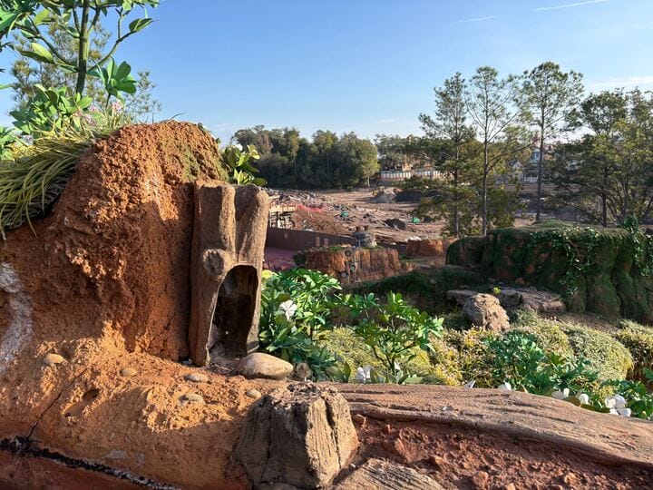 Construction walls run all the way around the former river, but guests can see the demolition/construction zone from certain vantage points. The trees visible in the back of these pictures are all at the back edge of Magic Kingdom.