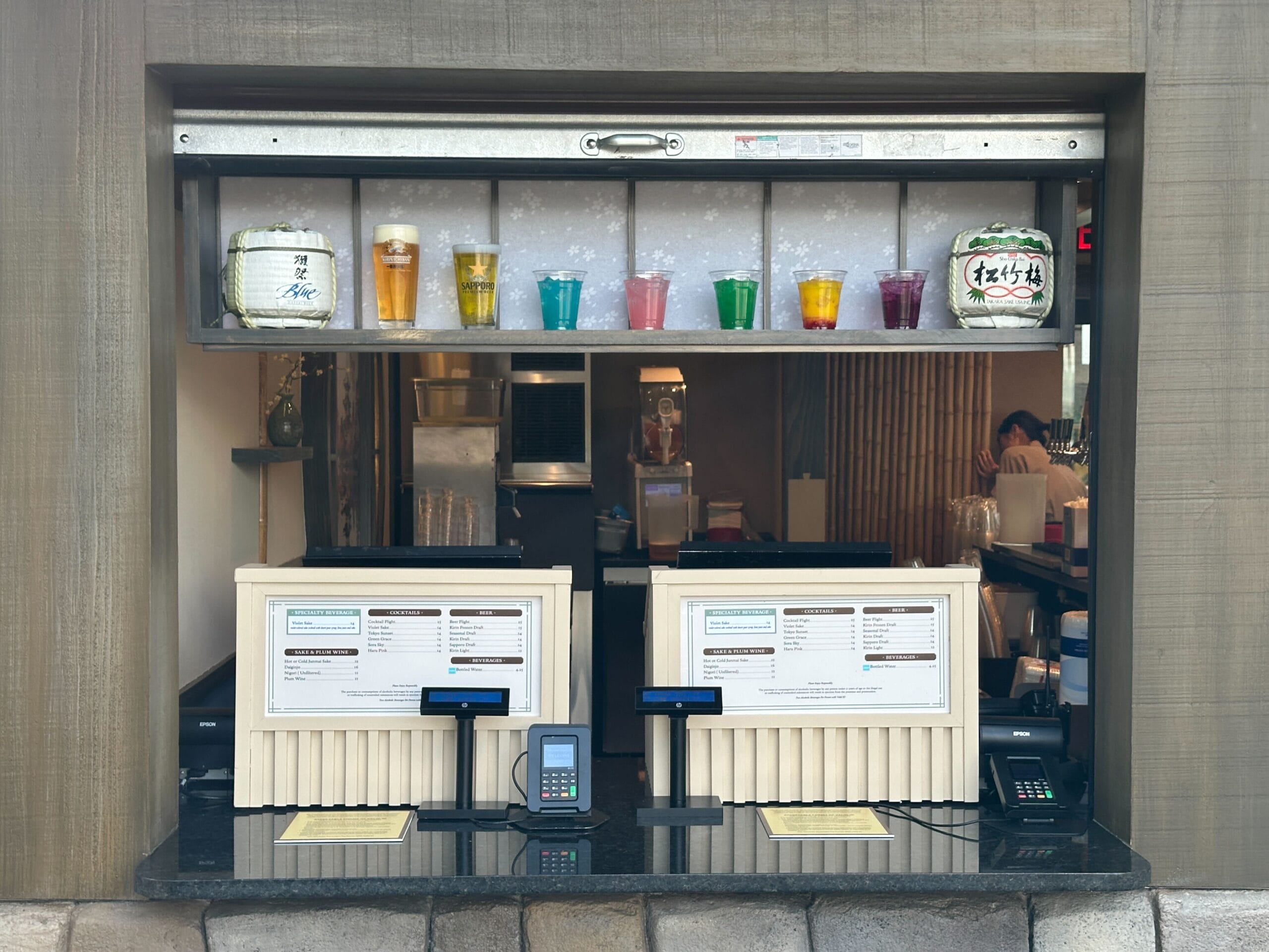 The kiosk no longer sells sodas or green tea. The Green Grace, Sora Sky, and Haru Pink cocktails replace the Cucumber Cooler, Blood Orange Lemonade, Strawberry Rose Spring Cocktail, and Seasonal Cocktail. The cocktails used to be $9, and the sakes/wines were a few dollars cheaper. There also used to be a Sparkling Sake.