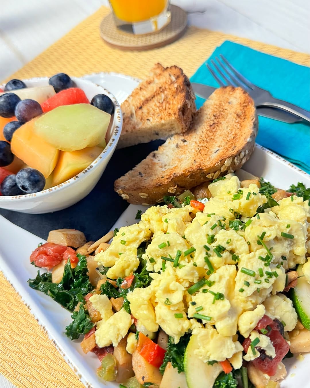 - Vegan Hash – scrambled Just Egg plant-based egg substitute, over fire-roasted tomatoes, diced potatoes, red and green peppers, onion, and zuccihini served with fresh fruit and multigrain toast