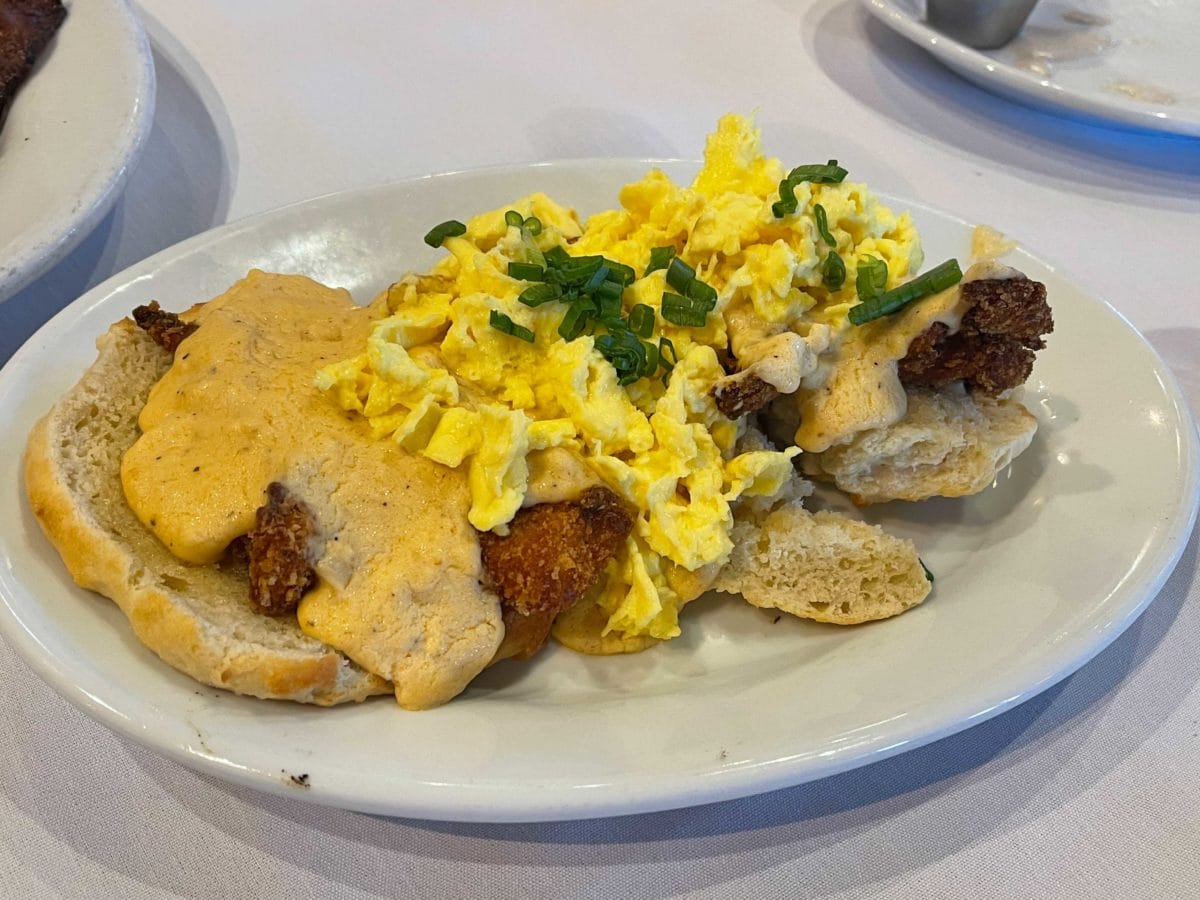 - Hallelujah Biscuit – open-faced biscuit topped with Chef Art’s famous fried chicken, two over-easy eggs, pimento cheese, pecan-smoked bacon, and smothered in sawmill gravy with a choice of side item