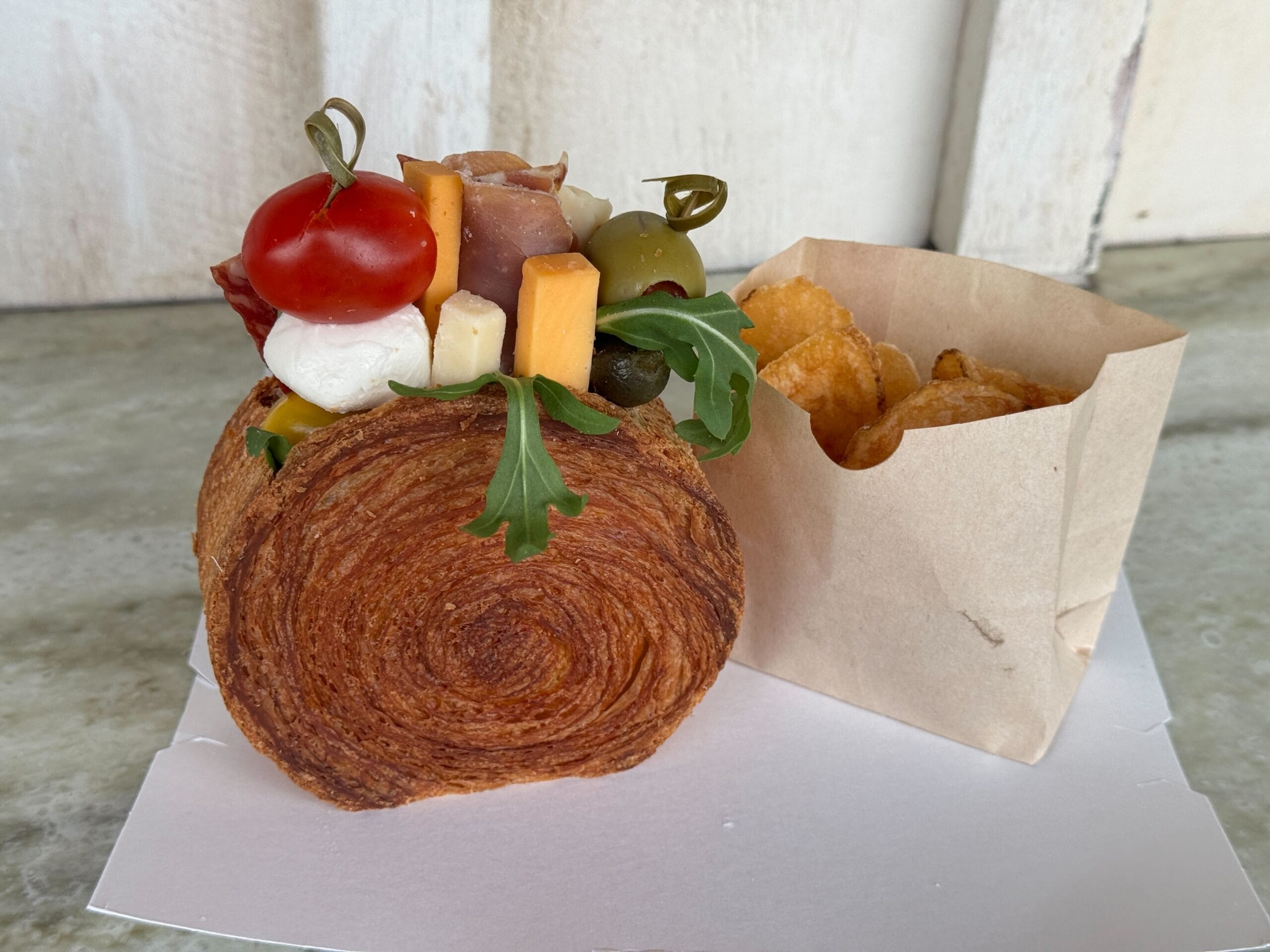 - Charcuterie croissant – two-year-aged cheddar, smoked cheddar, mozzarella pearls, prosciutto, salami calabrese, green olives, heirloom tomatoes, arugula, and cornichon served with housemade chips